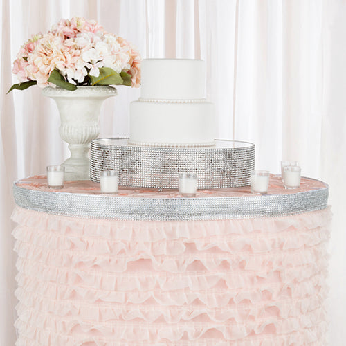 Let’s be real – when decorating with rhinestones it can be easy to go overboard. Luckily, we’ve found the perfect item for your high cocktail table! Balance delicate ruffles with glittering rhinestones with our Rhinestone combined with Ruffled Tiered Table Skirts!