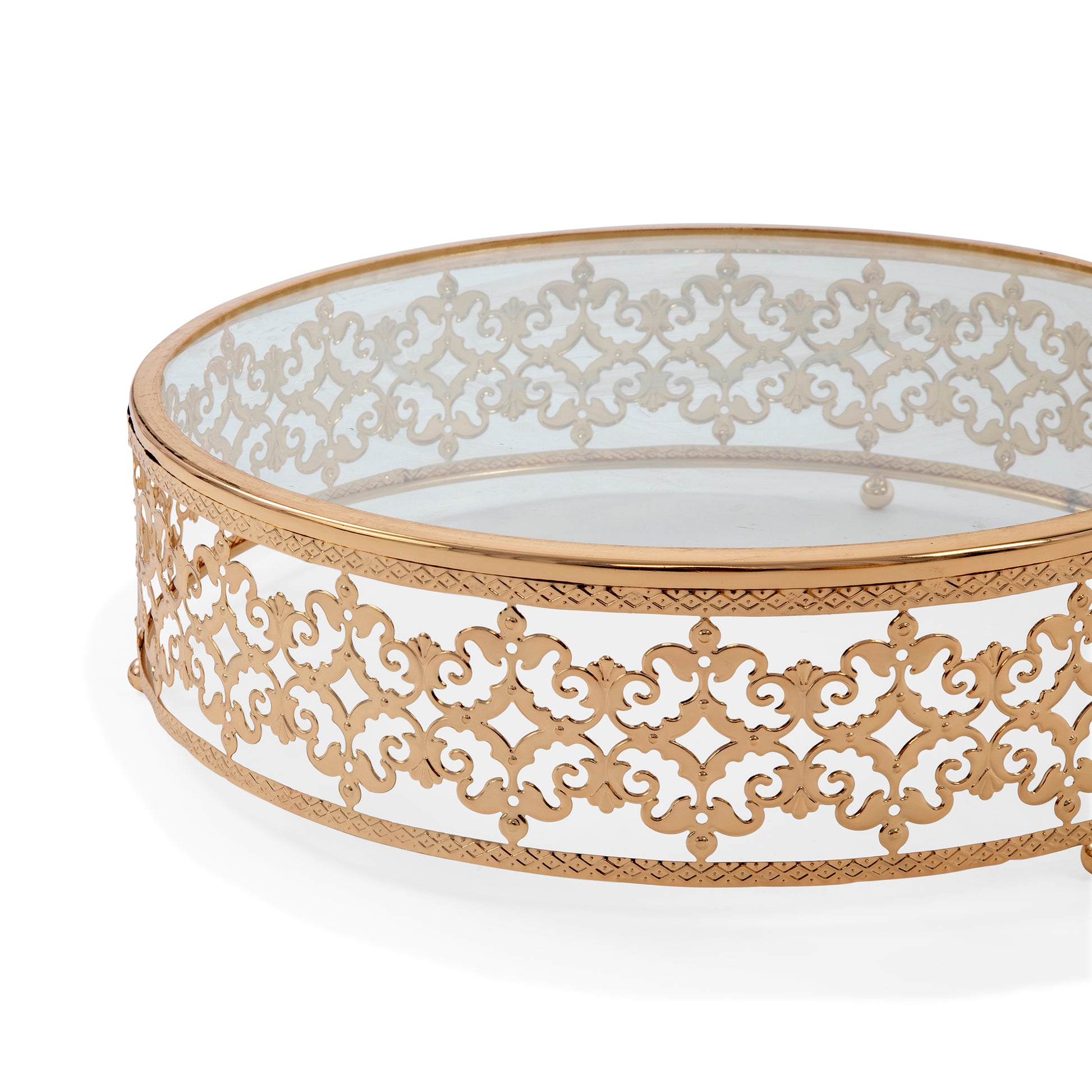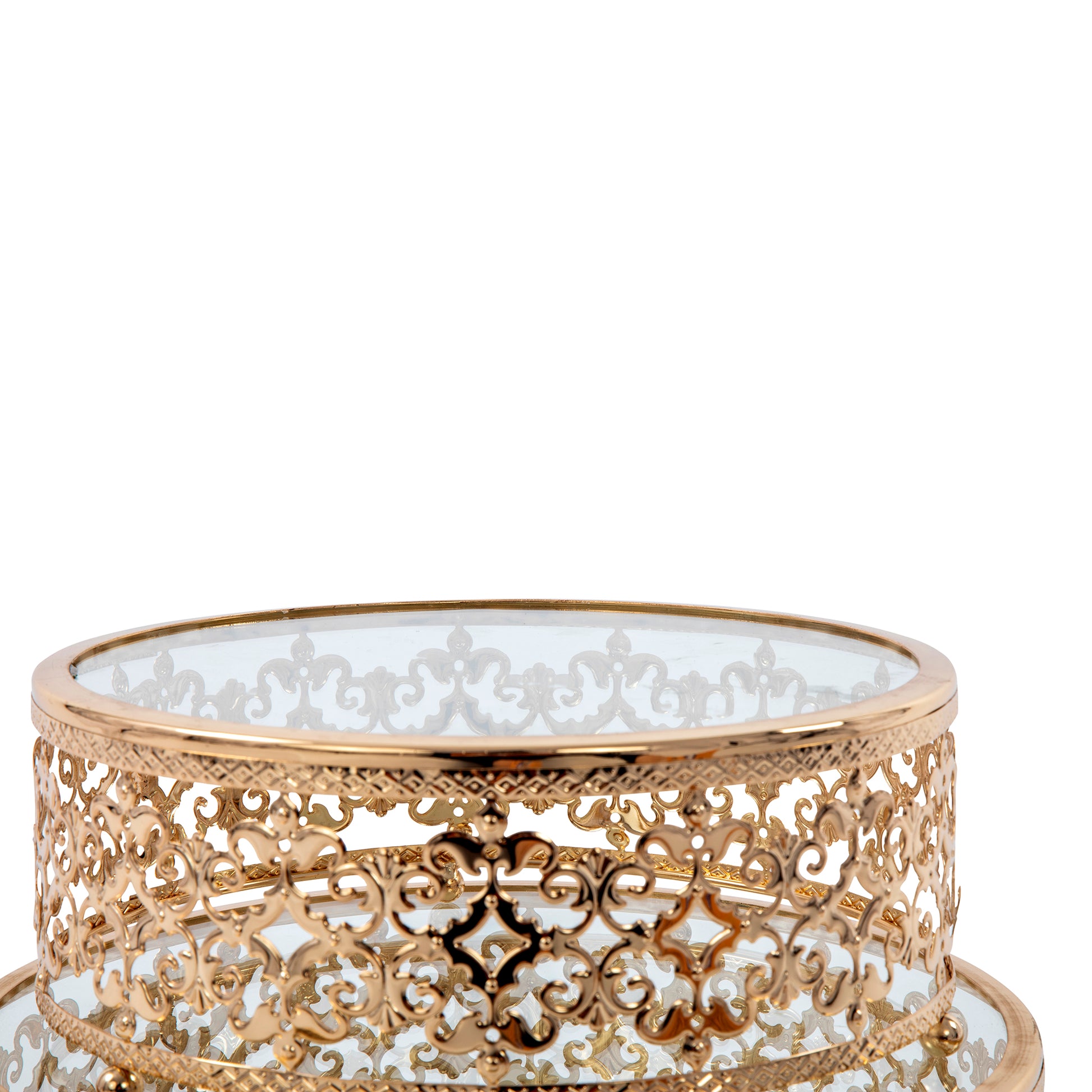 Our 3 pc/set Luxe Round Cake Display Stands - Gold is a recipe for elegance! All of your dessert table treats will disappear fast when you serve them on these elegant dessert riser stands. This versatile stands for serving cakes, cupcakes, cookies, candies, pastries, and muffins, it is also great for hors d'oeuvres and fresh fruits. These fancy cake display stands will bring elegance to your wedding reception, birthday party, baby or wedding shower, banquet, and all other special occasions. This three-piece set features a classic round silhouette with a glass top. All stands have a 4” height, and they are decked out with a 3.5” trim with a textured filigree pattern. The small stand has a 10” diameter, the medium stand has an 11.75” diameter, and the large stand has a 13.75” diameter. The even dispersion of weight this cake riser boasts allows it to easily hold up every masterpiece you set atop it.