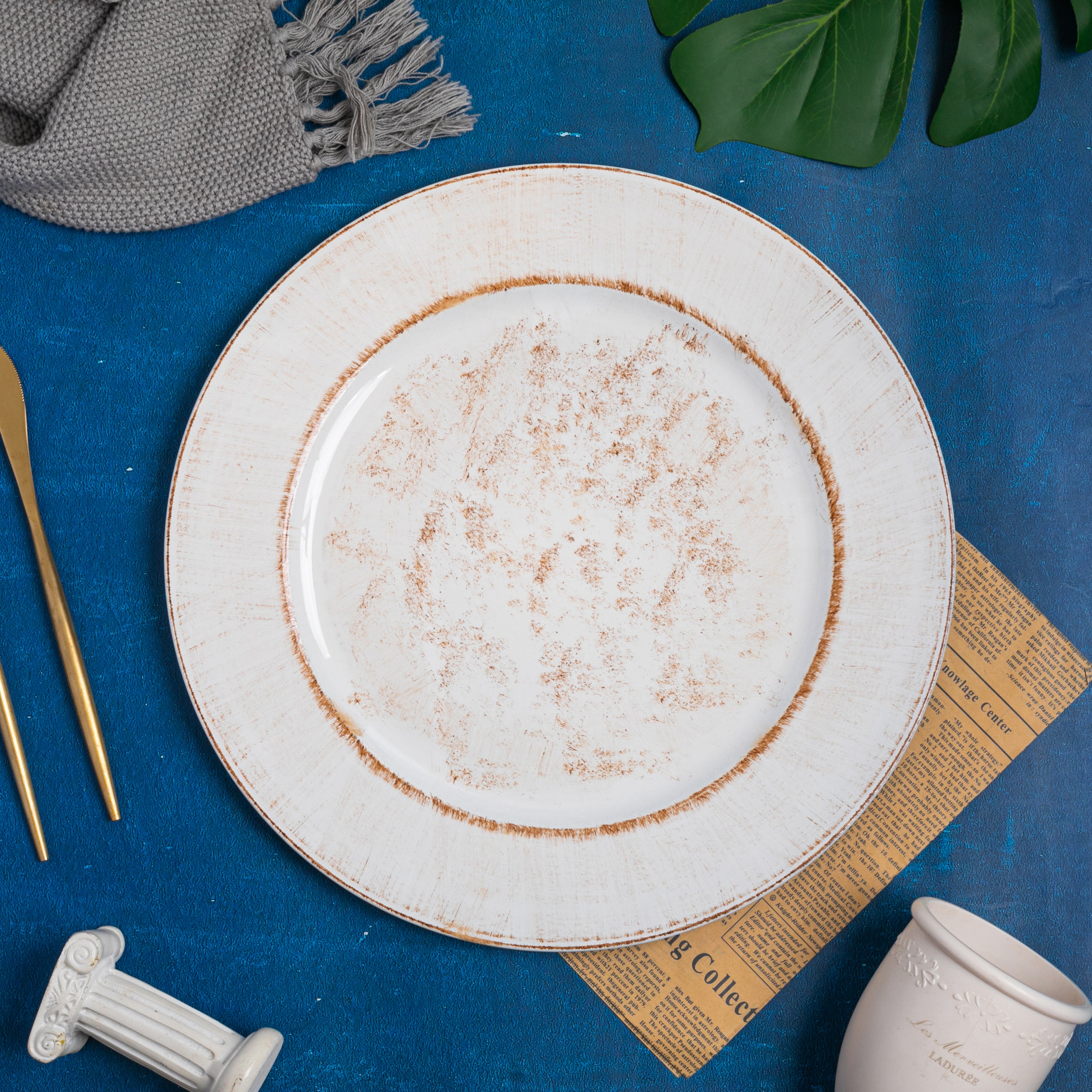 Charger plates, also called chop plates or underplates, easily enhance table decor with their main aesthetic purposes. Beyond being used as a decoration, they are also used to protect linens and upgrade your serving style as guests do not eat food directly from them.
