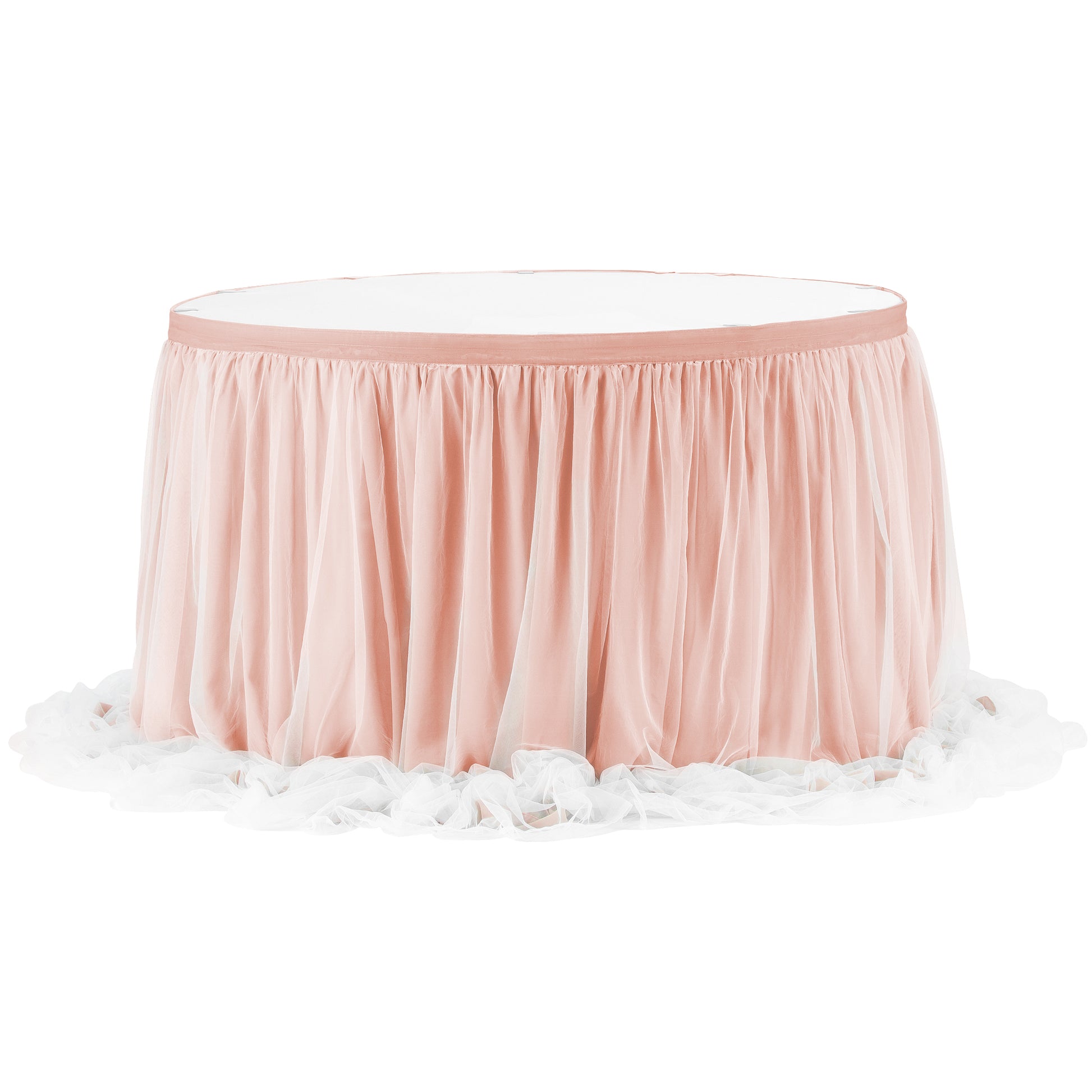 This extra long table skirt is the perfect way to highlight a special destination at your event, from the cake table to the bridal table and beyond. At 57" long, this double layer table skirt brings a glam elegance wherever it is used. The delicate sophistication of our cloud-like tulle and chiffon table skirt enhances the fairytale aesthetic of weddings, birthdays, banquets, tea parties, and other events. The sheer and soft coupling attains a high level of whimsical charm that draws attention far and wide. This wholesale waterfall table skirt is just the final touch your special event deserves. It's such a show-stopper, and it's a terrific and easy way to dress up a plain tablecloth to make it the main attraction!