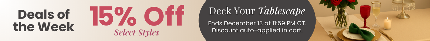 Our Deals of the Week are refreshed every week with a new selection of discounted linens and event supplies. This means you’ll always find fresh items, seasonal picks, and trending designs every time you check back.