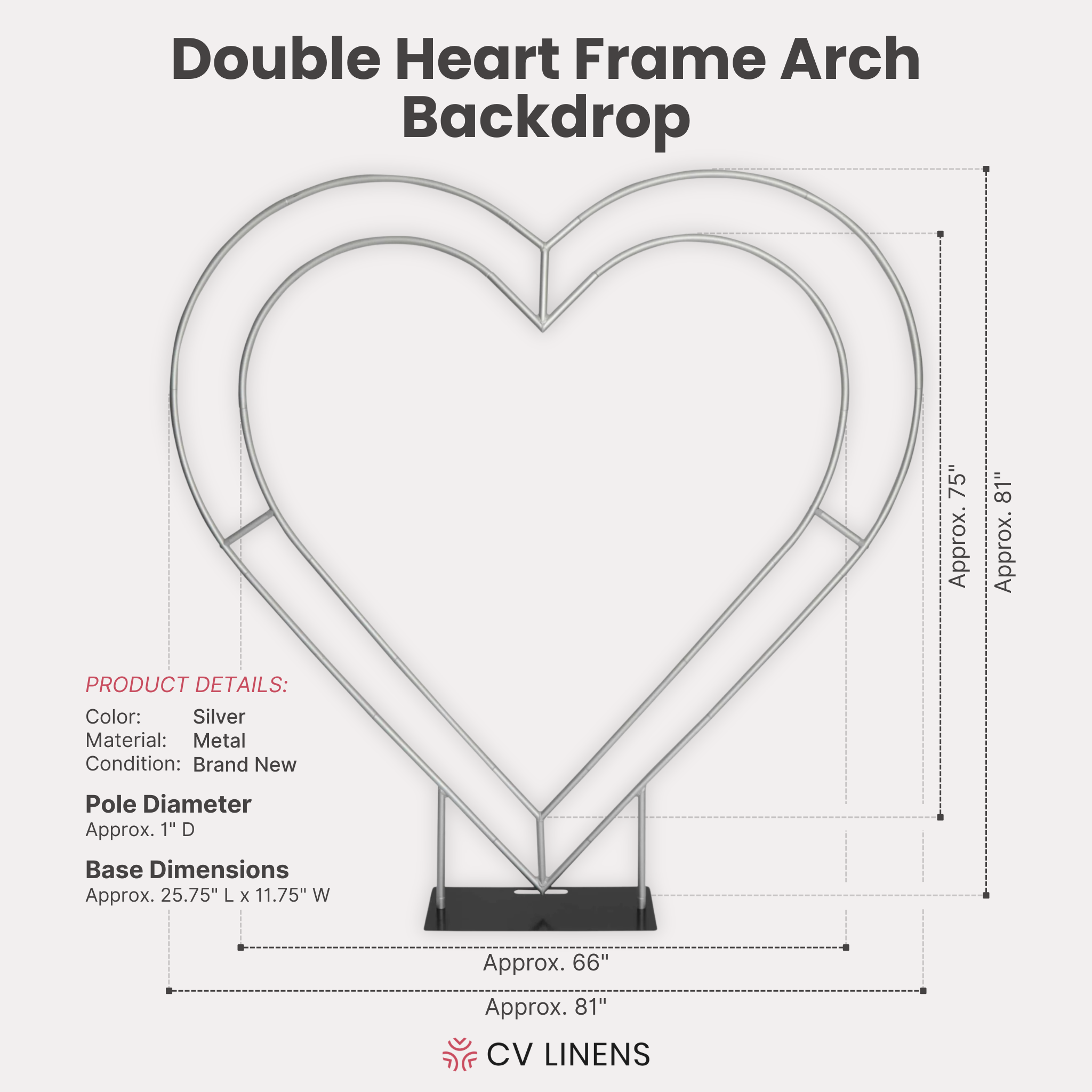 CV Linens is your destination for elegant table linens and decor that steal the spotlight, and our double heart arch frame is no exception. Pair it with our blush/rose gold spandex pillar covers for metal cylinder pedestal stands and create a visual masterpiece that people won't stop talking about!