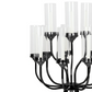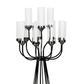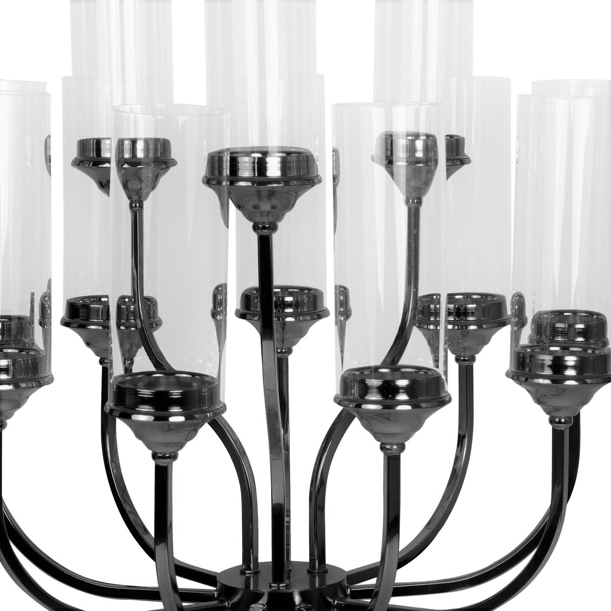 This modern geometric candle holder features twelve disc candle nozzles with cylinder glass shades on an elegant black geometric base. Each cylinder accommodates a single wax or LED taper candle to produce an ambient glow over your daytime or evening celebrations.