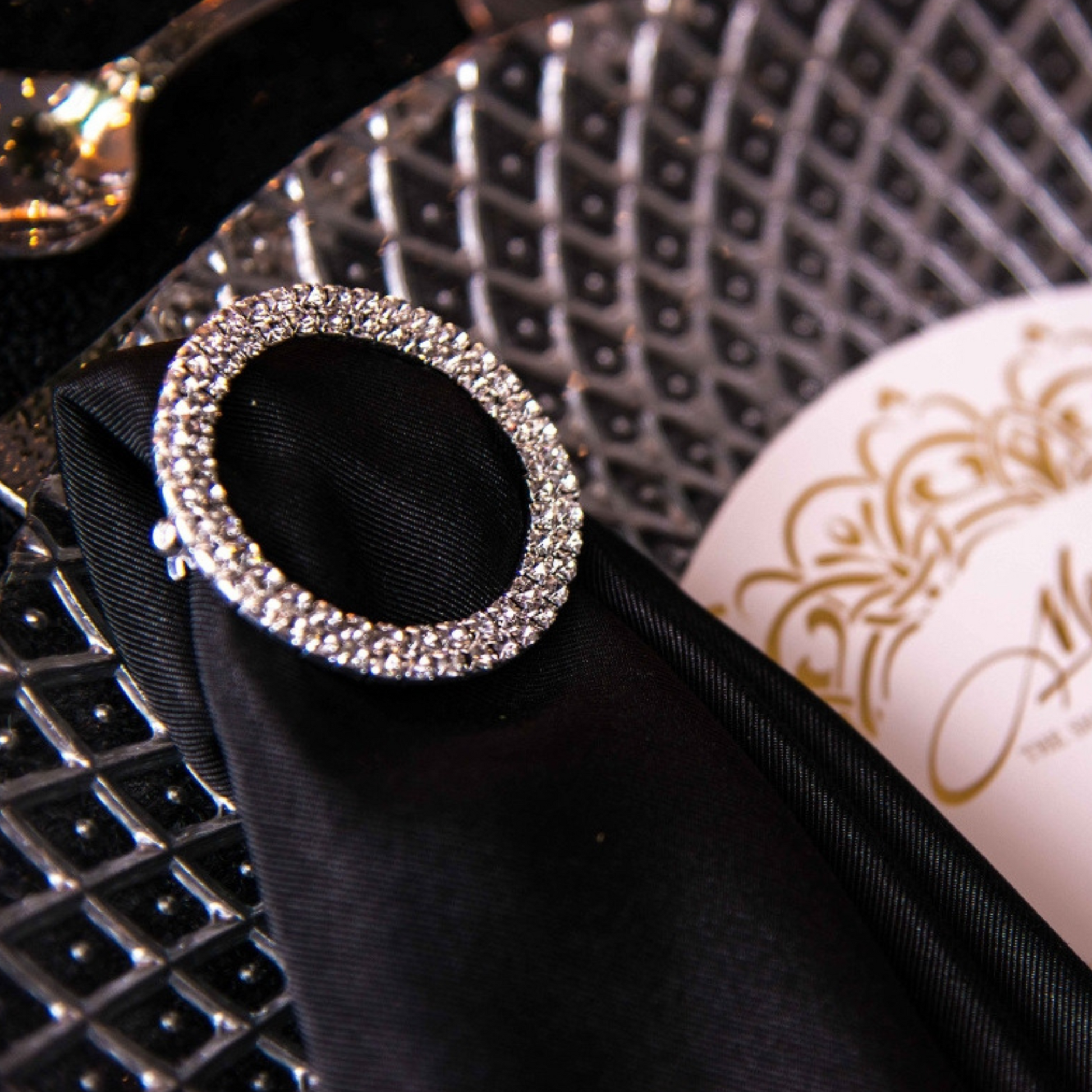 Style your dining tables using classic black napkins with gold and silver tablecloths and table decorations.