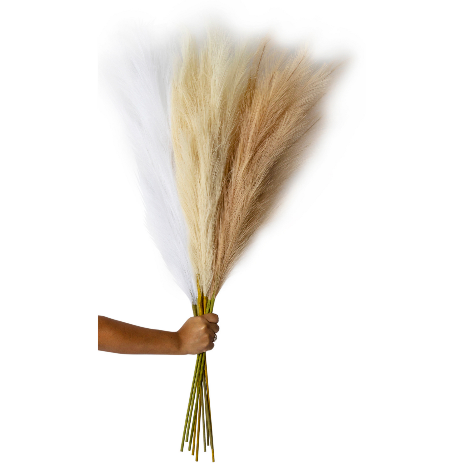 This set of three 43" faux pampas grass works wonderfully in floor vases for a flourish of wild beauty that makes a fantastical statement. The full look of pampas grass makes it a perfect accompaniment for photo booth setups and grand backdrops, as well as gorgeous table centerpieces, mantle scape, wedding floral arrangements, altar accents, or to decorate a wedding arch. Artificial pampas grass is perfect for repeat use at events or at home. While it imitates a real-life look, this fake grass will retain a realistic appeal because it will not shed or fade, plus it will not trigger allergies. Our large pampas grass wholesale will work its magic for all of your events to create a scene-stealing ambiance that will garner endless compliments and make all of your photos look effortlessly sophisticated.