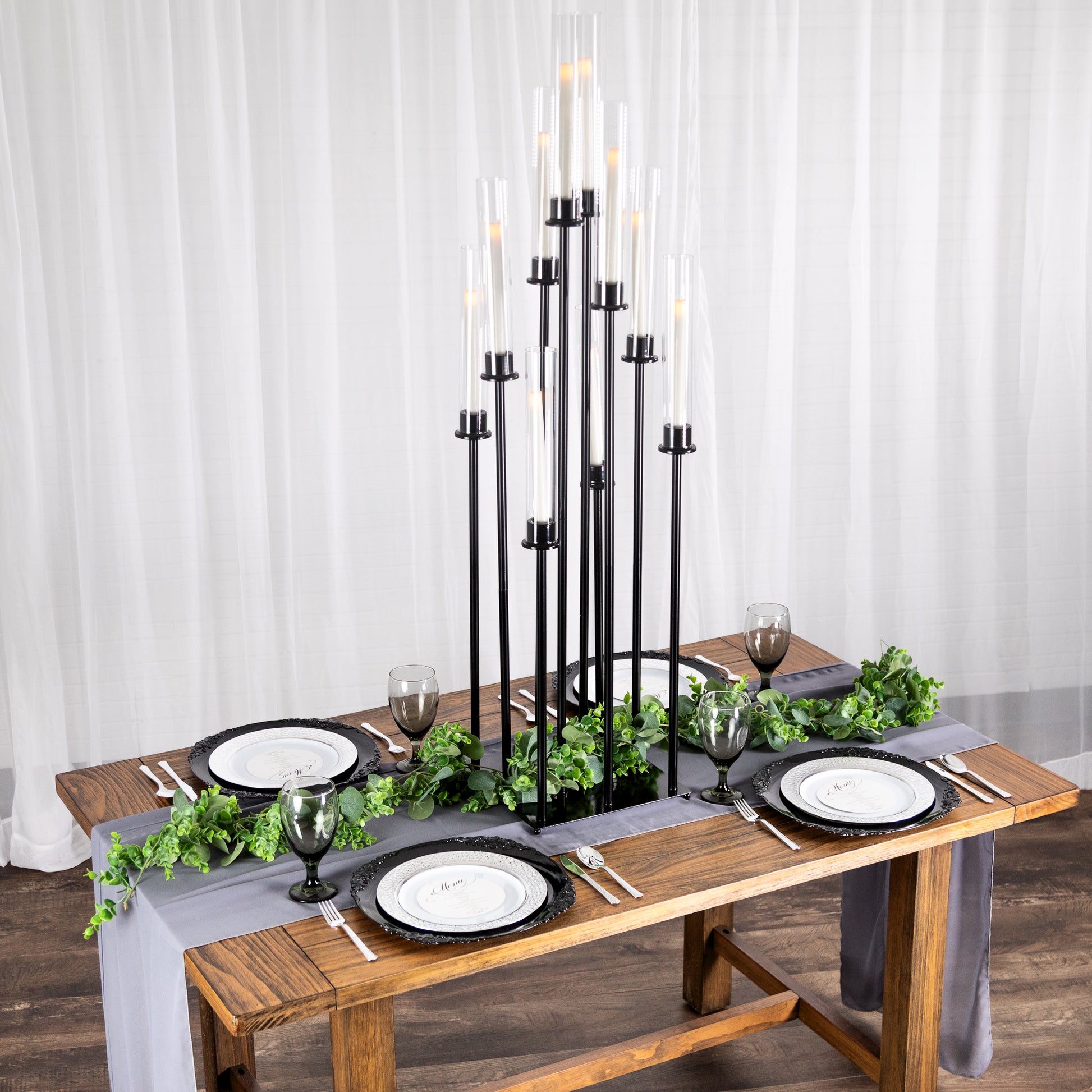 Explore design ideas with our 10-arm candelabra centerpieces for tables - black. This stunning centerpiece fully illuminates your table and creates a warm and inviting space. The black color exudes a chic and luxurious feel. With a height of 48” these black candelabra centerpieces are sure to charm your guests.