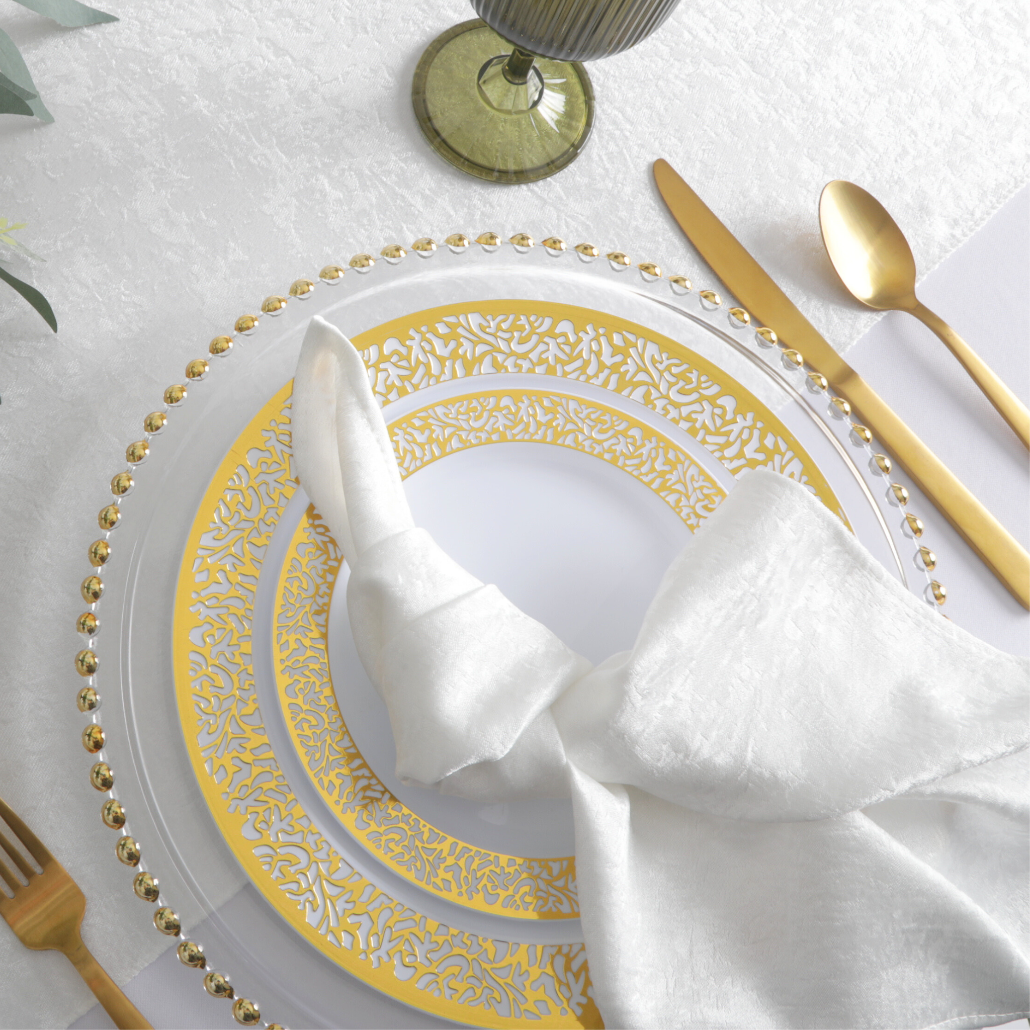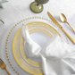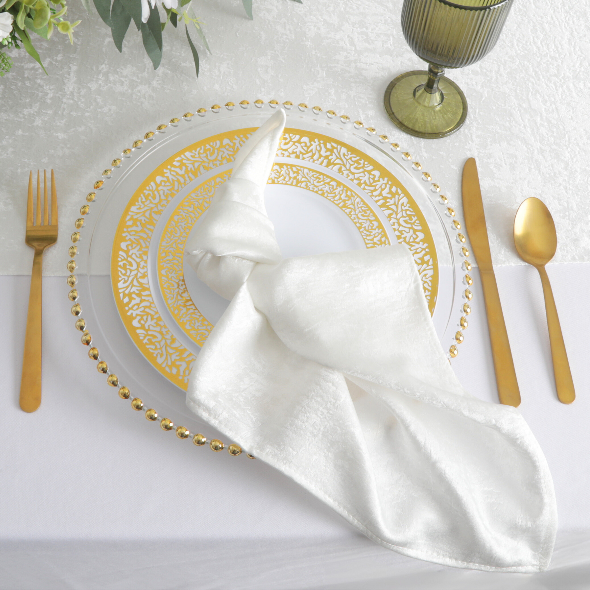 Create an atmosphere of refined luxury with light ivory or off-white napkins adorning your table setting. To enhance their elegance, pair them with a contrasting tablecloth in navy blue or charcoal gray, achieving a sophisticated balance of tones that delights the senses. 20"x20" Emerald Green Shimmer Napkin is also available for added flexibility in your table setting.