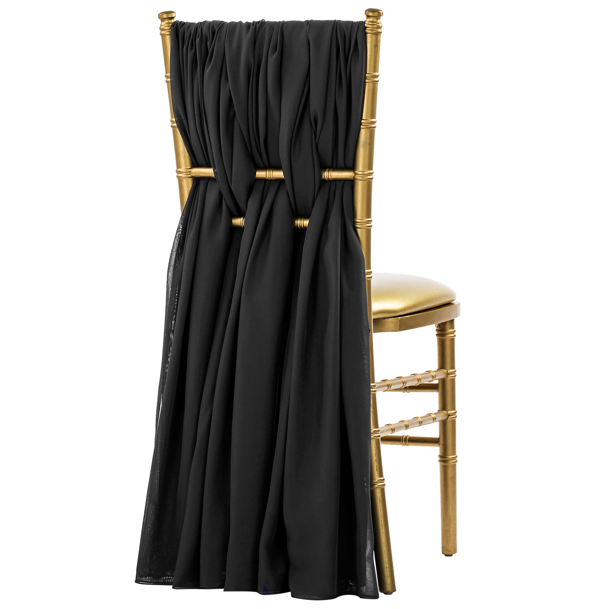 Instantly heighten the elegance of your banquet, folding or Chiavari chairs with our 5pcs Pack of Chiffon Chair Sashes/Ties. Made from premium quality Chiffon fabric, these sashes endow a sleek look and show off dream-like luxury at weddings and receptions. These lightweight and breezy sashes create bows, weaves and drape elegantly across church pews, guest chairs, high top tables or head bride and groom chairs. Their versatility achieves any look your event theme can demand. Embellish them with clips, pins, sashes, gems and more to transform lackluster party chairs into exquisite and eye-catching banquet chairs. These chair sashes are ideal for creating a chic elegance for celebrations like weddings, baby or bridal showers, birthday festivities and any themed party. Easy to work with and shape, you can create a cascading flow of chiffon throughout your venue and match colors to your event theme for charismatic coherence. These gorgeous wedding chair sashes catch the light and add a touch of softness to your indoor or outdoor event. To achieve the same "weaved" style look of our pictured Chiavari chair, you will need to interlace all five sashes. The results are perfect for the chairs at the head bride and groom table that works to set them apart and make a statement of grandeur.