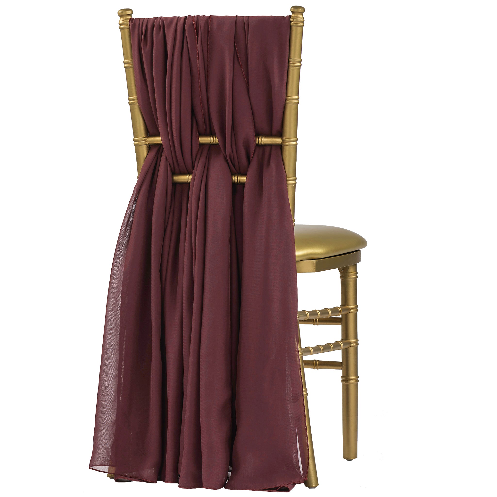 Instantly heighten the elegance of your banquet, folding or Chiavari chairs with our 5pcs Pack of Chiffon Chair Sashes/Ties. Made from premium quality Chiffon fabric, these sashes endow a sleek look and show off dream-like luxury at weddings and receptions. These lightweight and breezy sashes create bows, weaves and drape elegantly across church pews, guest chairs, high top tables or head bride and groom chairs. Their versatility achieves any look your event theme can demand. Embellish them with clips, pins, sashes, gems and more to transform lackluster party chairs into exquisite and eye-catching banquet chairs. These chair sashes are ideal for creating a chic elegance for celebrations like weddings, baby or bridal showers, birthday festivities and any themed party. Easy to work with and shape, you can create a cascading flow of chiffon throughout your venue and match colors to your event theme for charismatic coherence. These gorgeous wedding chair sashes catch the light and add a touch of softness to your indoor or outdoor event. To achieve the same "weaved" style look of our pictured Chiavari chair, you will need to interlace all five sashes. The results are perfect for the chairs at the head bride and groom table that works to set them apart and make a statement of grandeur.