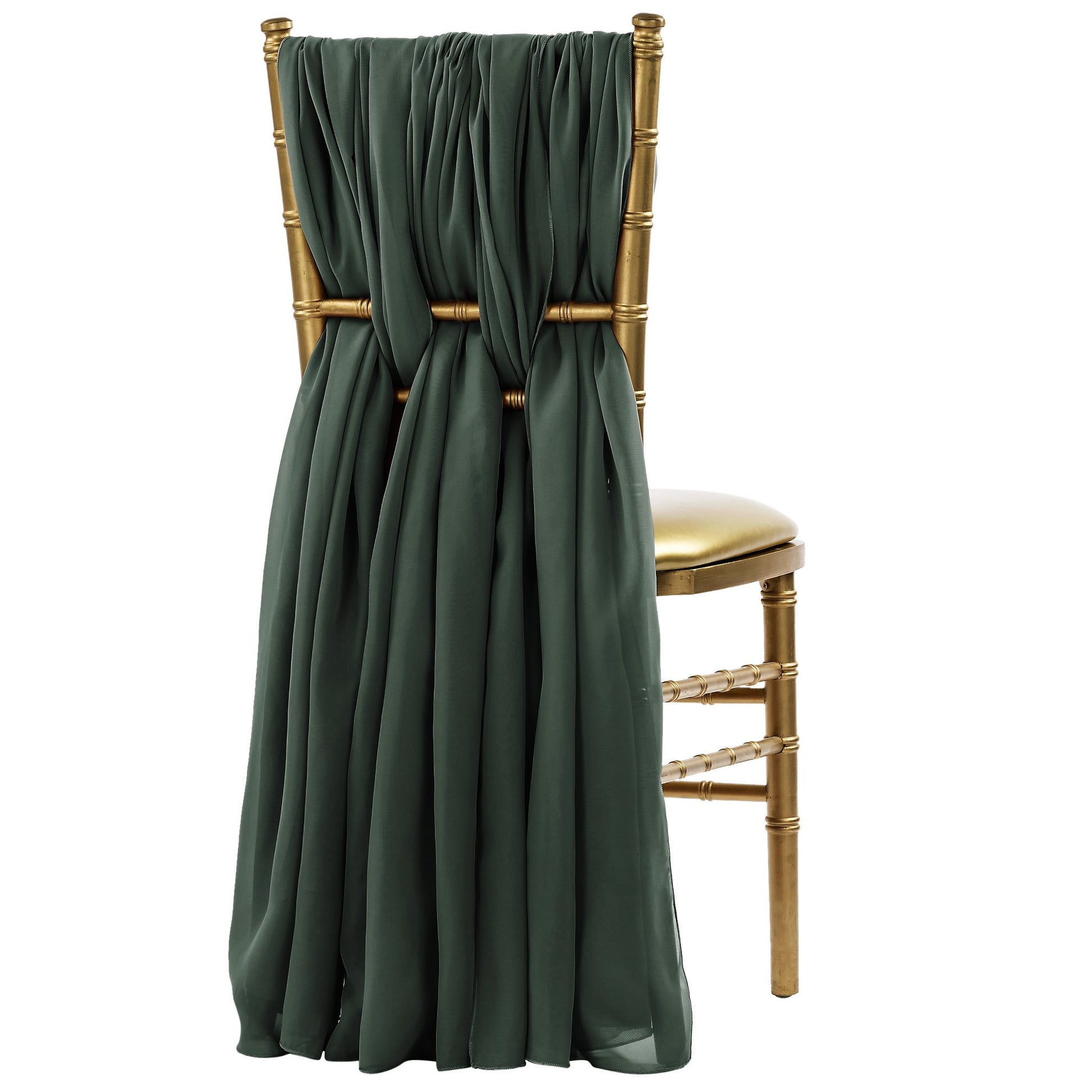 Instantly heighten the elegance of your banquet, folding or Chiavari chairs with our 5pcs Pack of Chiffon Chair Sashes/Ties. Made from premium quality Chiffon fabric, these sashes endow a sleek look and show off dream-like luxury at weddings and receptions. These lightweight and breezy sashes create bows, weaves and drape elegantly across church pews, guest chairs, high top tables or head bride and groom chairs. Their versatility achieves any look your event theme can demand. Embellish them with clips, pins, sashes, gems and more to transform lackluster party chairs into exquisite and eye-catching banquet chairs. These chair sashes are ideal for creating a chic elegance for celebrations like weddings, baby or bridal showers, birthday festivities and any themed party. Easy to work with and shape, you can create a cascading flow of chiffon throughout your venue and match colors to your event theme for charismatic coherence. These gorgeous wedding chair sashes catch the light and add a touch of softness to your indoor or outdoor event. To achieve the same "weaved" style look of our pictured Chiavari chair, you will need to interlace all five sashes. The results are perfect for the chairs at the head bride and groom table that works to set them apart and make a statement of grandeur.