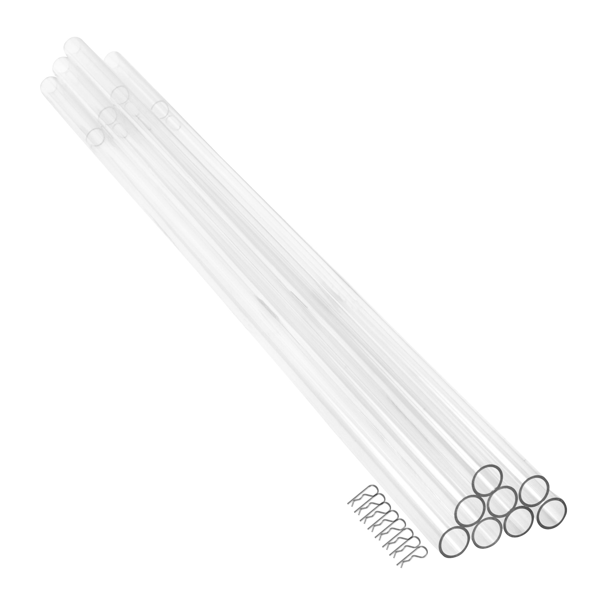 Our ceiling drape tubes are approximately 23” long with a 1/2 “diameter. The crystal clear acrylic rod tubes are colorless to cleverly blend amidst sheer materials and a variety of colors. They are made in durable acrylic making them lightweight and lasting versus aluminum styles you might find. Each set includes 8 ceiling tubes and 20 pins to secure your drapes and keep them in place. The pins are measured at an average of 4.5 cm for a sturdy fit.
