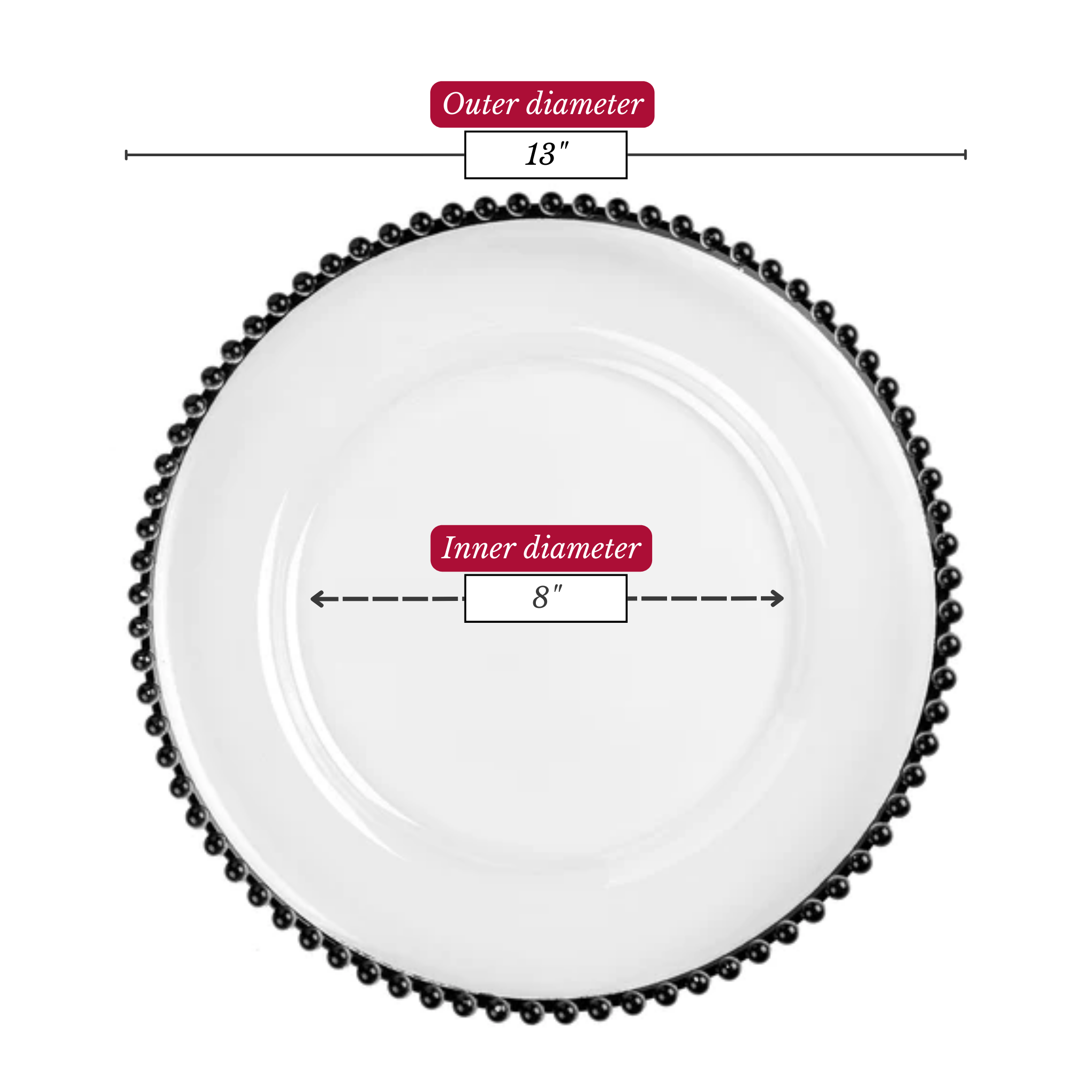 Create a stunning table setting with our elegant charger plates. These acrylic 13” chargers with beaded trimmings are perfect for weddings, birthday parties, and other special events. This sophisticated party decor adds a touch of sophistication to your dining table.