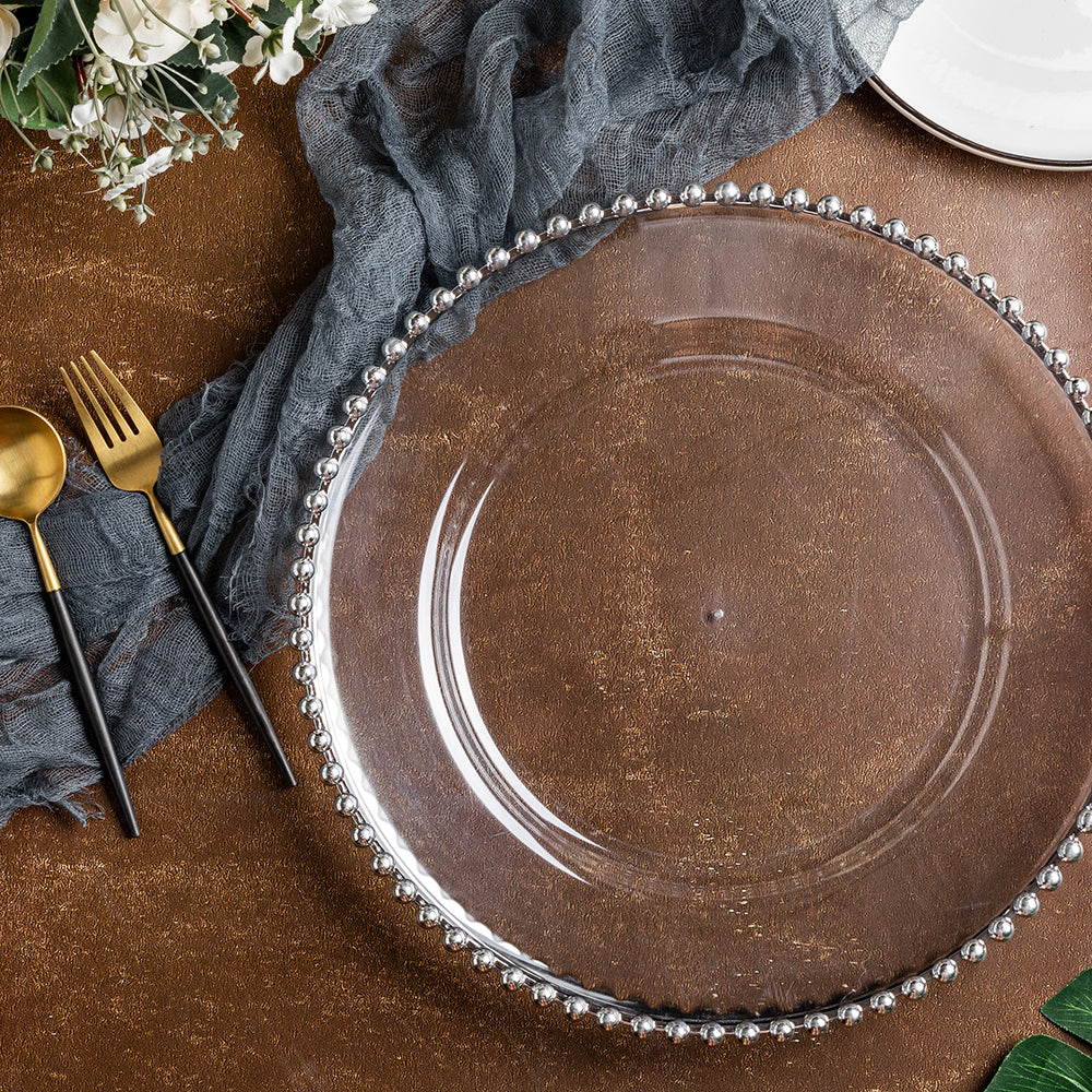 Craft elegant tablescapes with Silver Beaded Charger Plates and enjoy a luxurious dining experience. We have reef gold charger plates, gold beaded charger plates, and glass chargers for both formal parties and casual get-togethers. Complete your party with our wide range of tablecloth and table linen options.