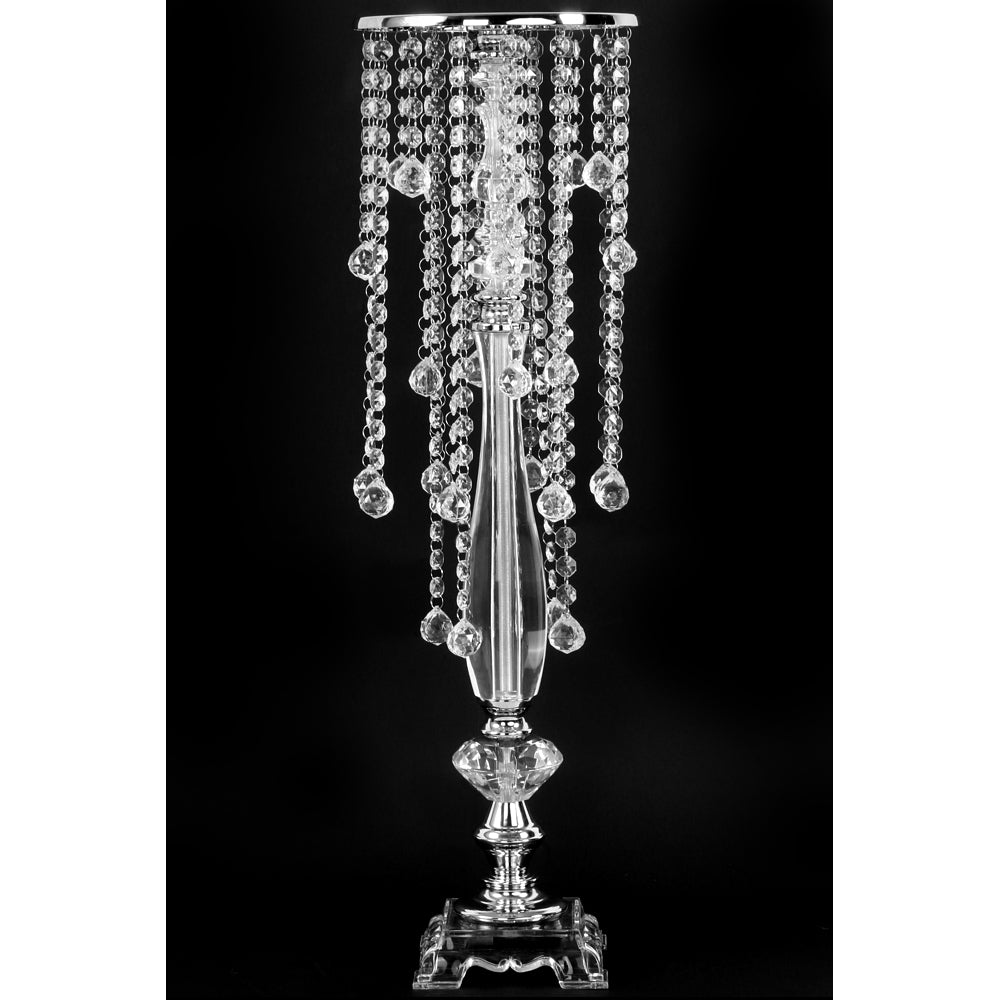 Our Acrylic Silver Crystal Drop Centerpiece is an easy-to-assemble centerpiece perfect for any event! Each centerpiece features a lifted acrylic base, silver plated topper, silver plated/acrylic center, and four tiers of standard acrylic crystal strands with large teardrop crystals on the end. The short, octagonal strands of clear diamond acrylic crystals measure approx. 4"-6.5" and the long strands elegantly hang at 13"-17". There are 24 crystal strands in total and each Acrylic Crystal Drop Centerpiece measures approx. 27" high.