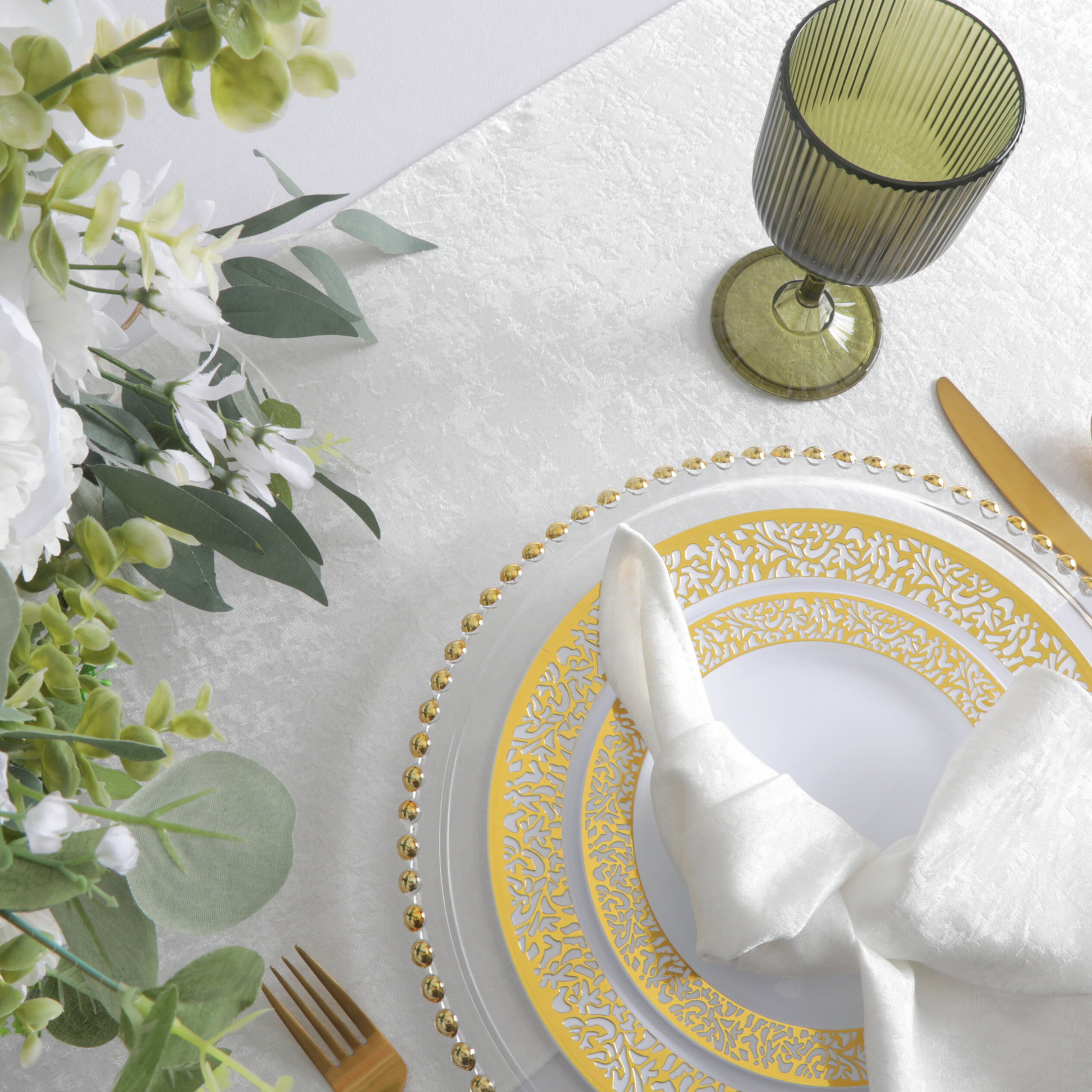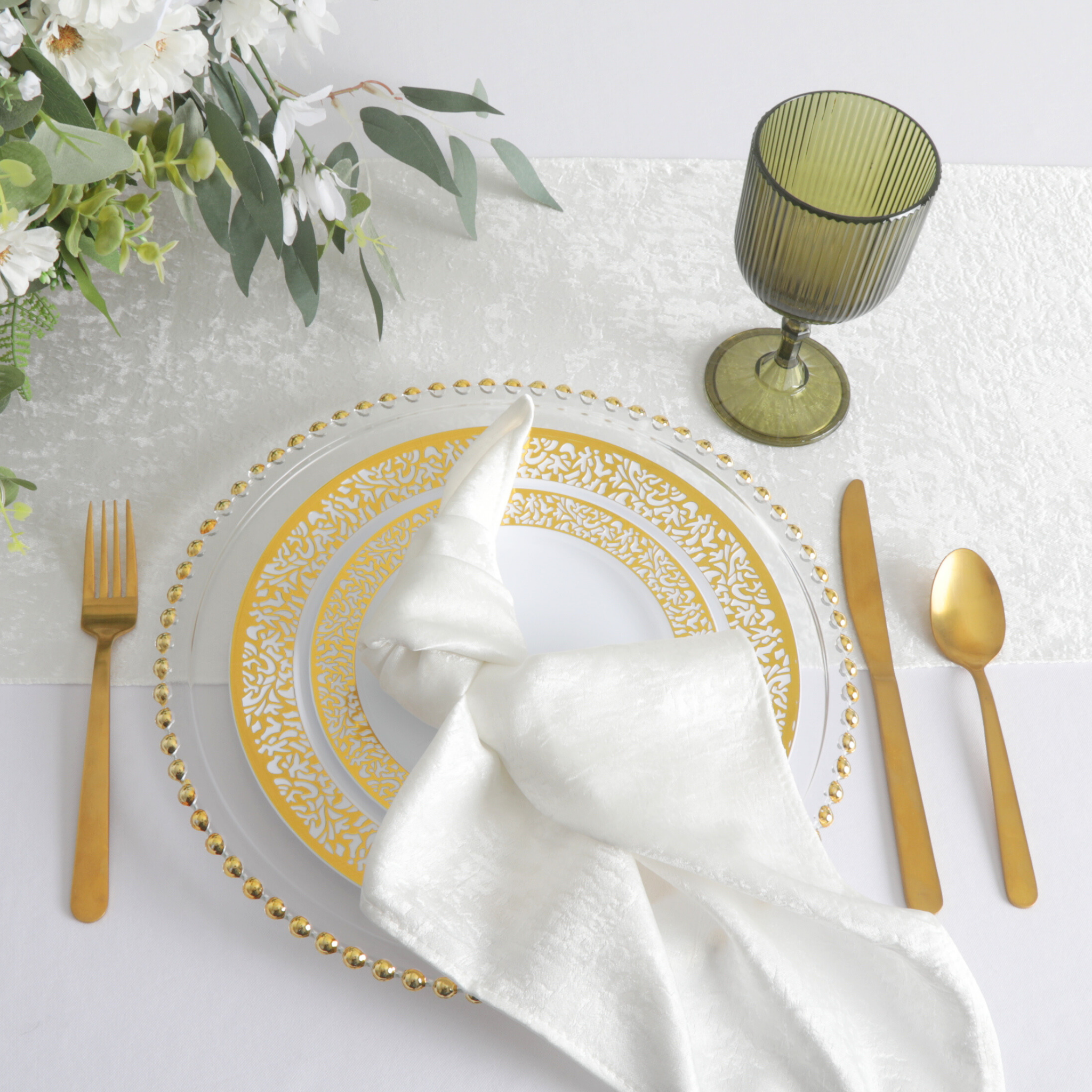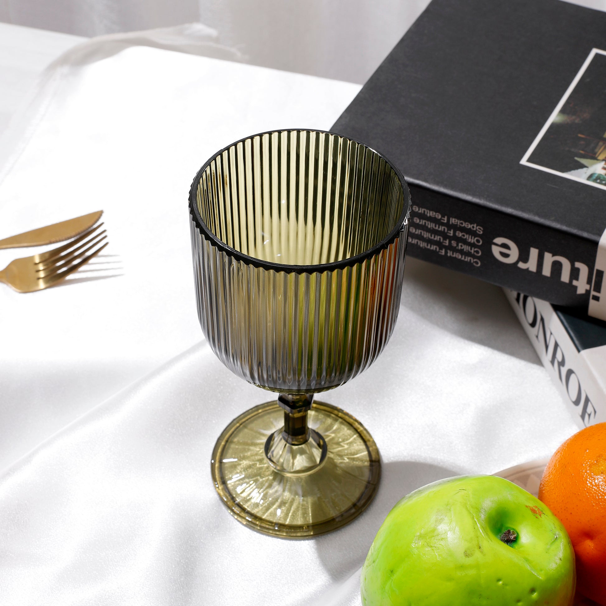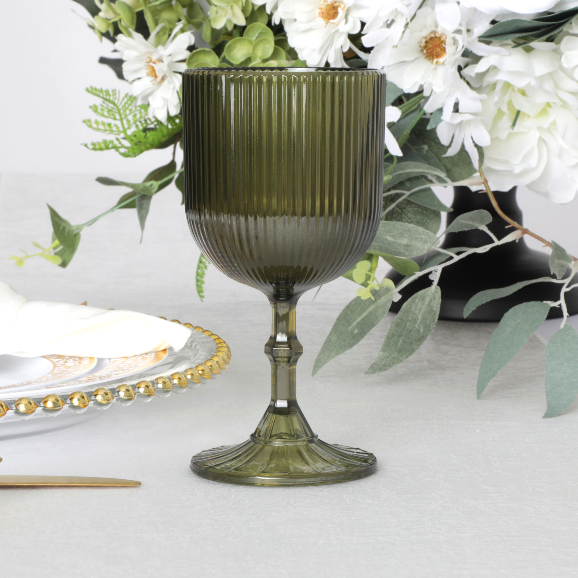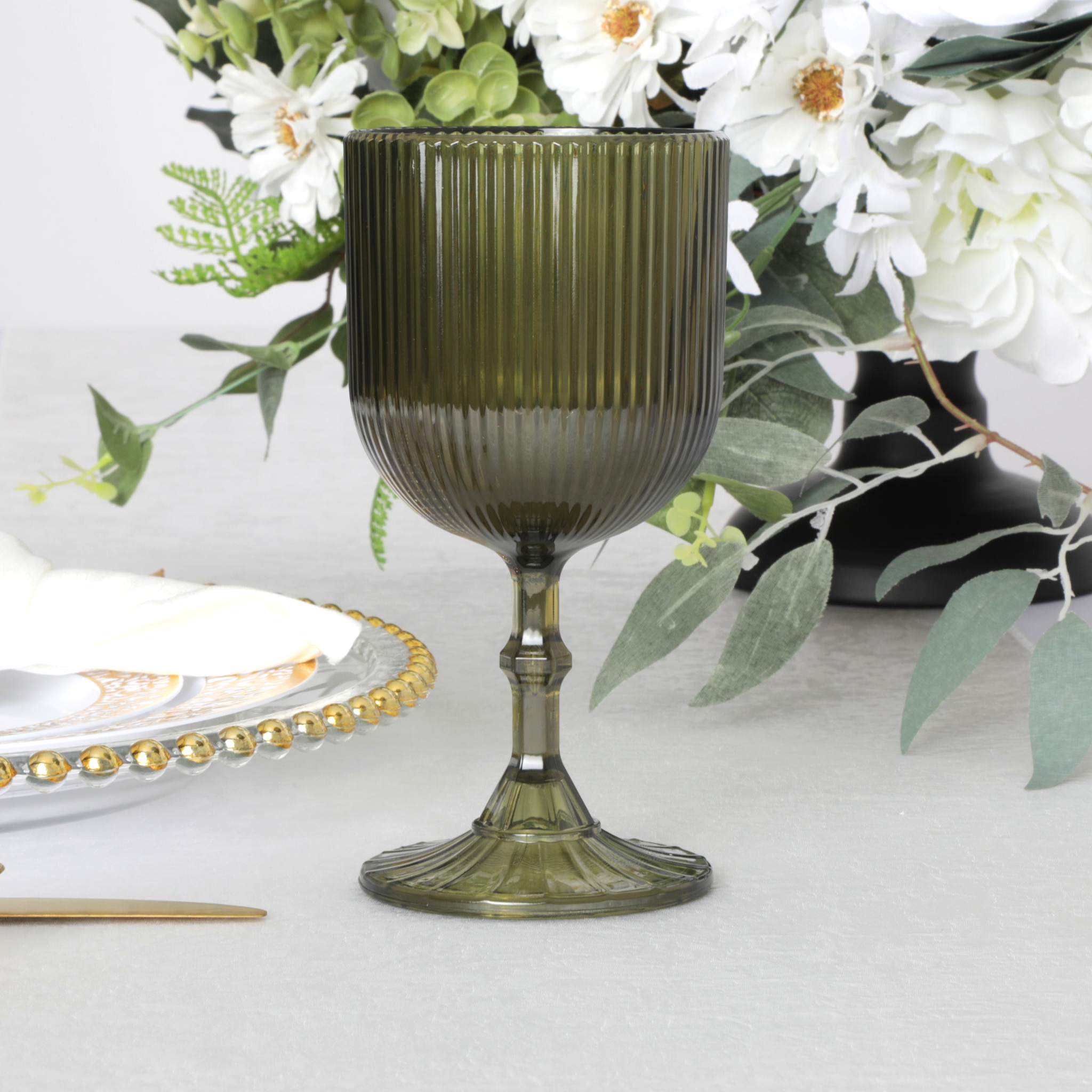 Embrace the earthy tones of these olive green acrylic goblets with complementary colors such as beige, taupe, or cream in your table linens and centerpieces to create a warm and inviting ambiance reminiscent of the outdoors.