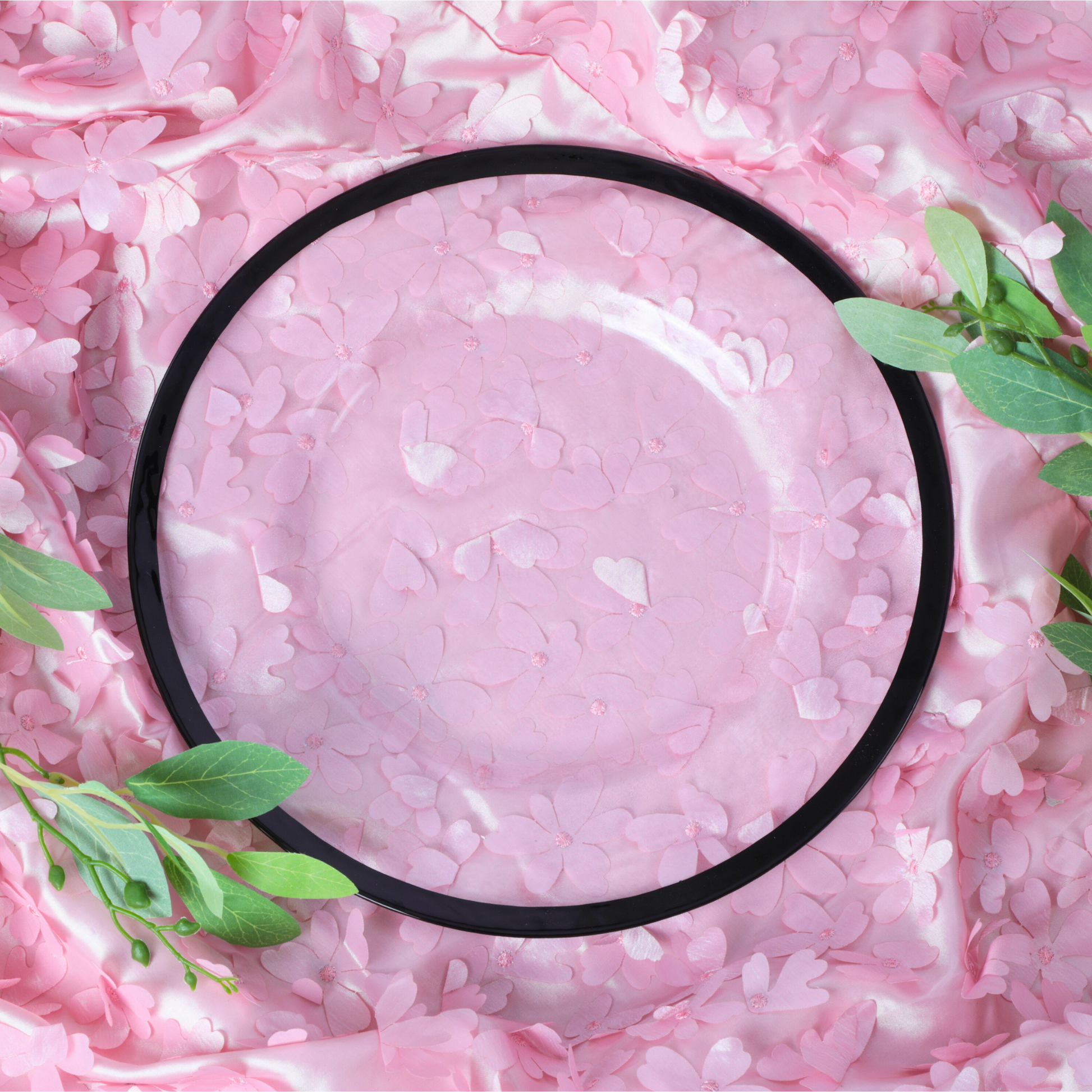 Elegantly frame your space with lovely drapes. You can choose soft ivory and champagne drapes, or deep-toned ones like royal blue or burgundy that will give the venue an intimate vibe. Your event is sure to radiate charm with the Alpine Glass Charger Plates with Black Trim from CV Linens™!