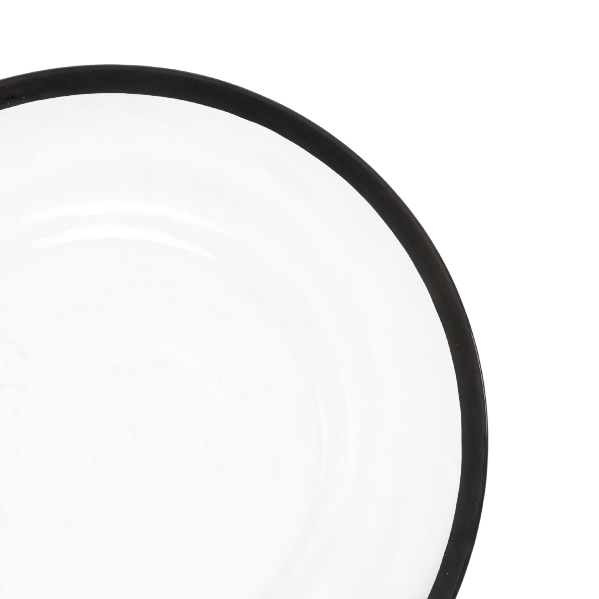 Our 13" Alpine glass charger plate is beautifully finished with a sleek black trim, bringing a striking and modern contrast to your setting. Black symbolizes timeless elegance, so it is perfectly suited to formal occasions. Whether paired with white dinnerware for a classic monochrome aesthetic, or for a striking contrast, these charger plates set the stage for memorable dining experiences.