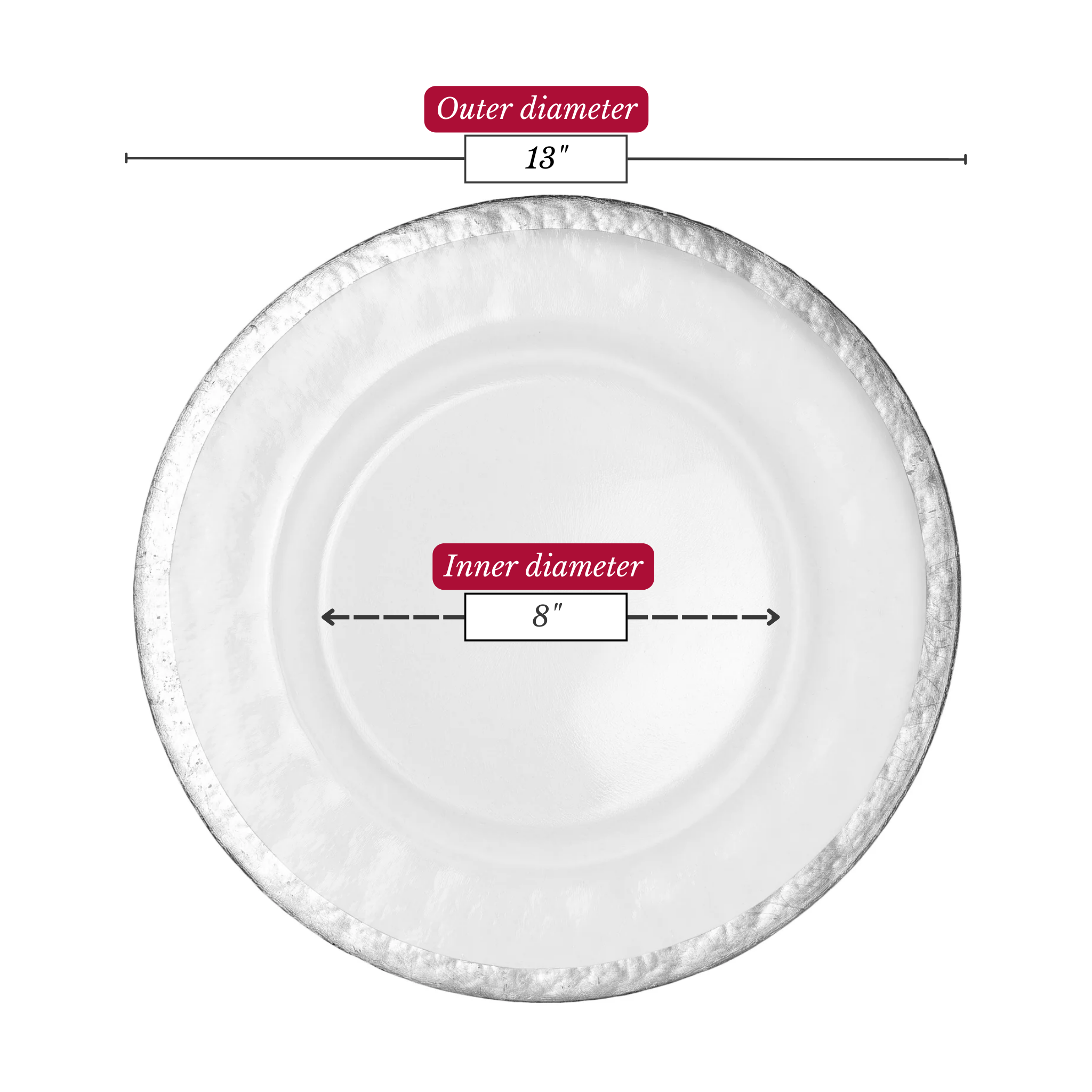 Feel the stunning blend of luxury and style with the Alpine Glass Charger Plates Trimmed in Silver. They are used as a decorative base for dinner plates, adding an upscale touch to any occasion. Our Alpine charger plates feature a textured or frosted finish reminiscent of icy mountain scenery.