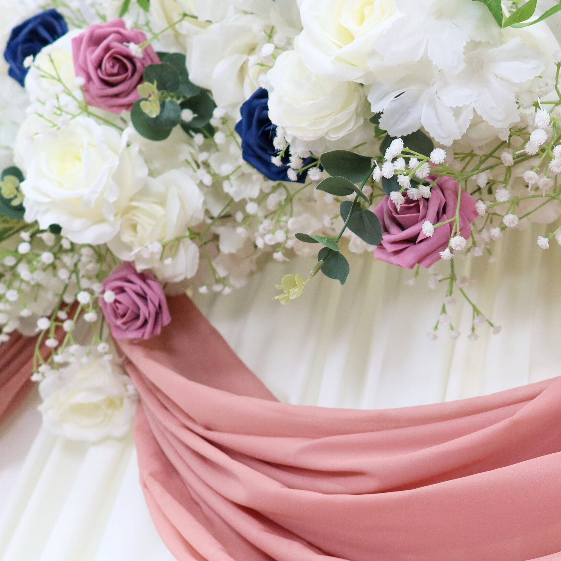 Our pre-made flower backdrop arch/table runner decor is a sophisticated artificial floral arrangement crafted to turn any space into a fairytale setting. This decor item is a mix of faux roses, baby's breath blooms, and greenery, all crafted into a full cluster that adds a charming effect to your setup.