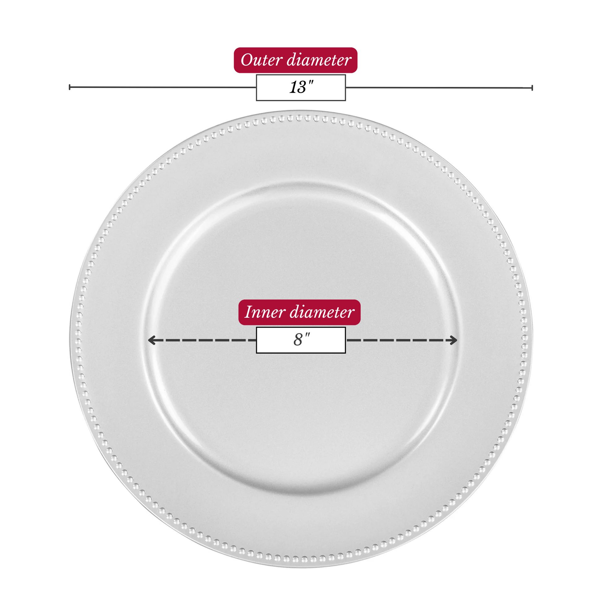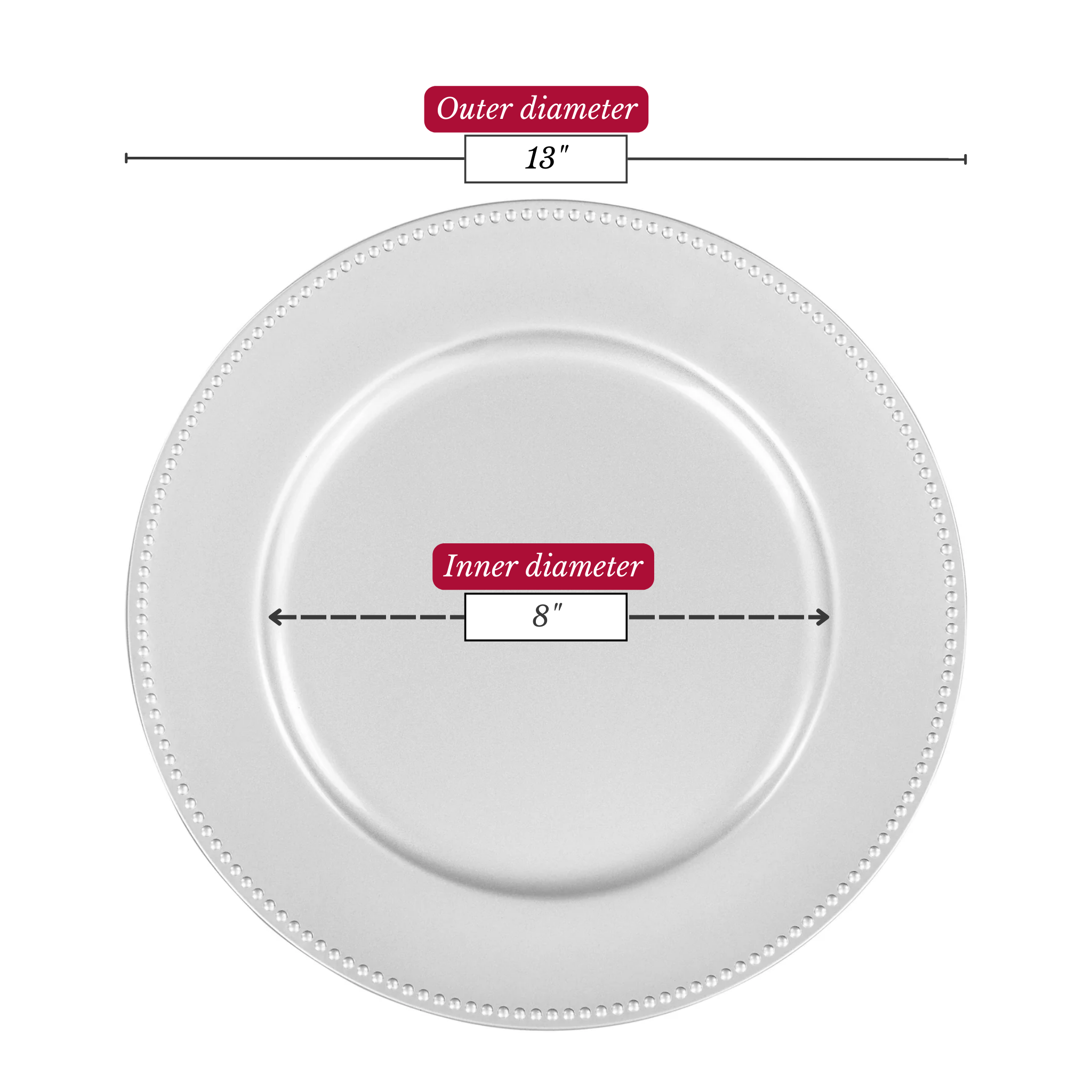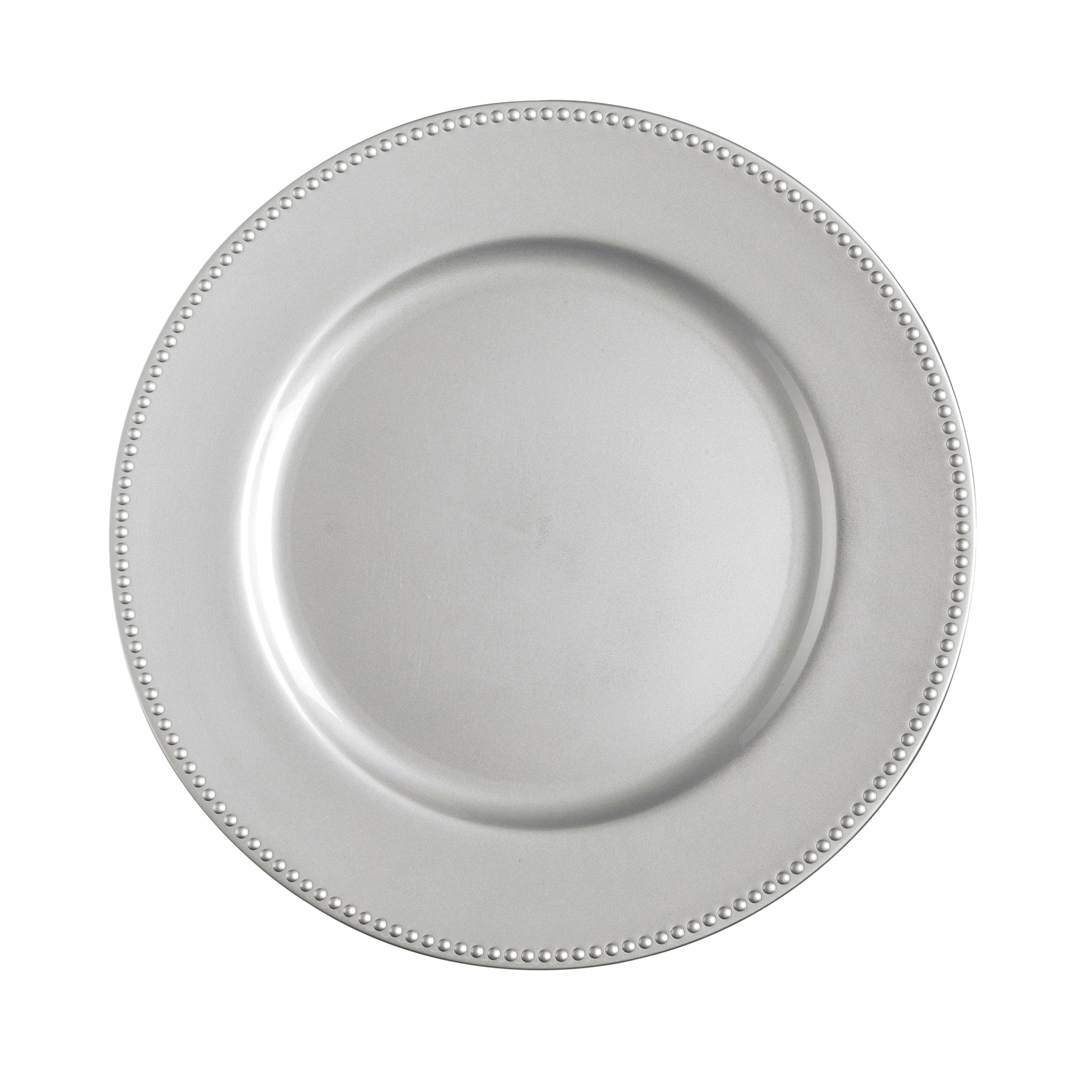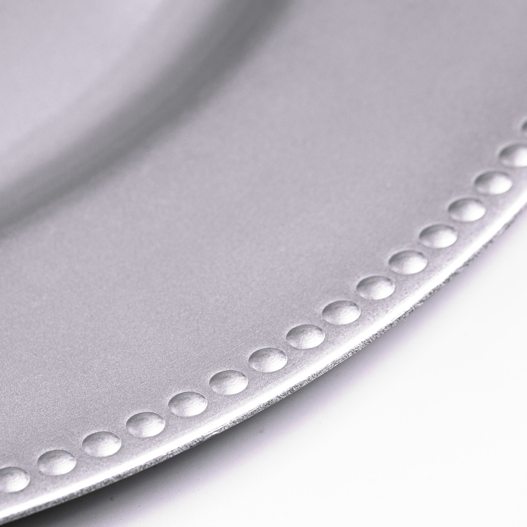 Charger plates serve both a decorative and functional purpose. They protect tabletops and tablecloths from spills and stains and also add style to your setting. Our silver chargers' beaded rim adds flair and a polished look to your tablescape.