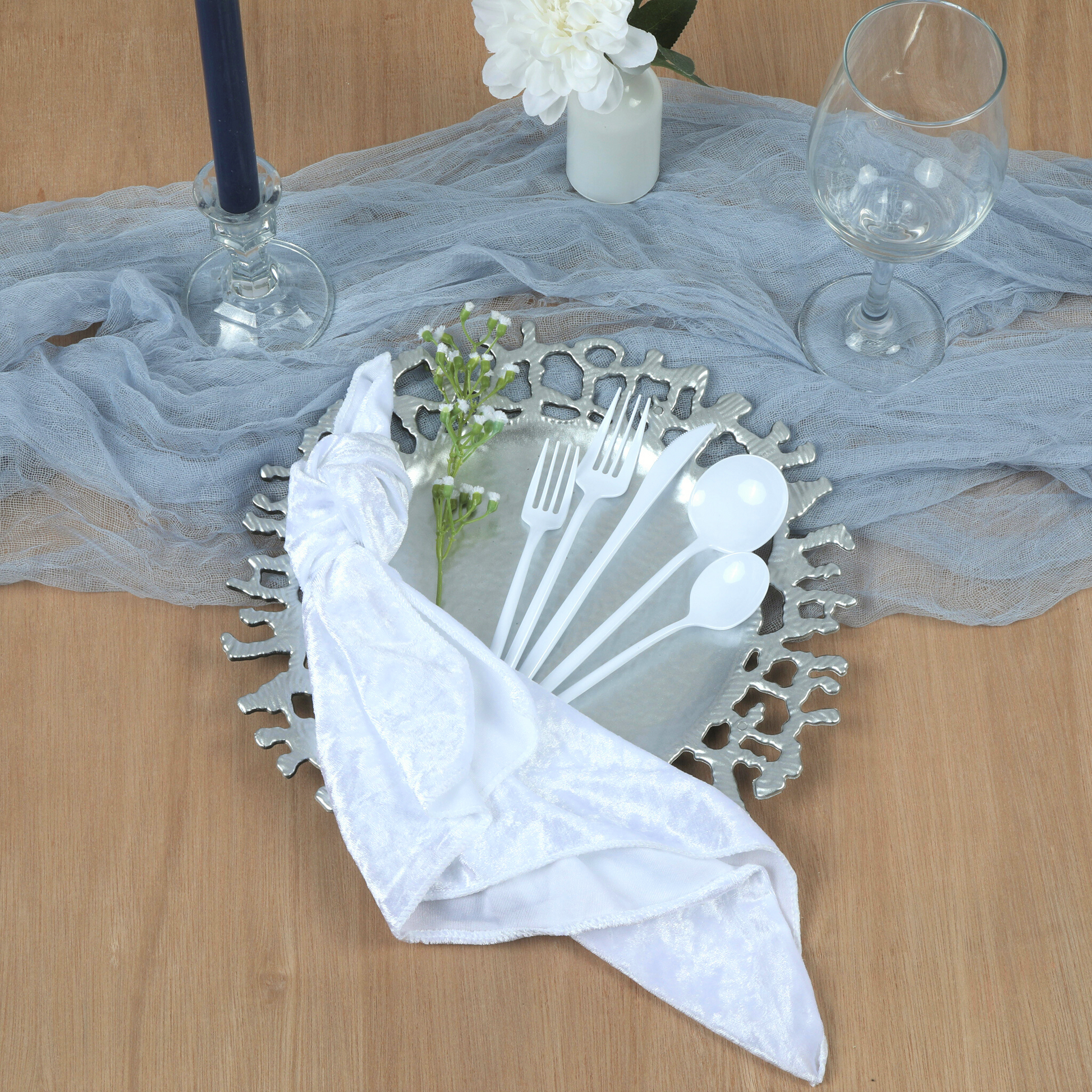 Complete your tablescape by styling your branch molten silver charger plates with the right table linens.