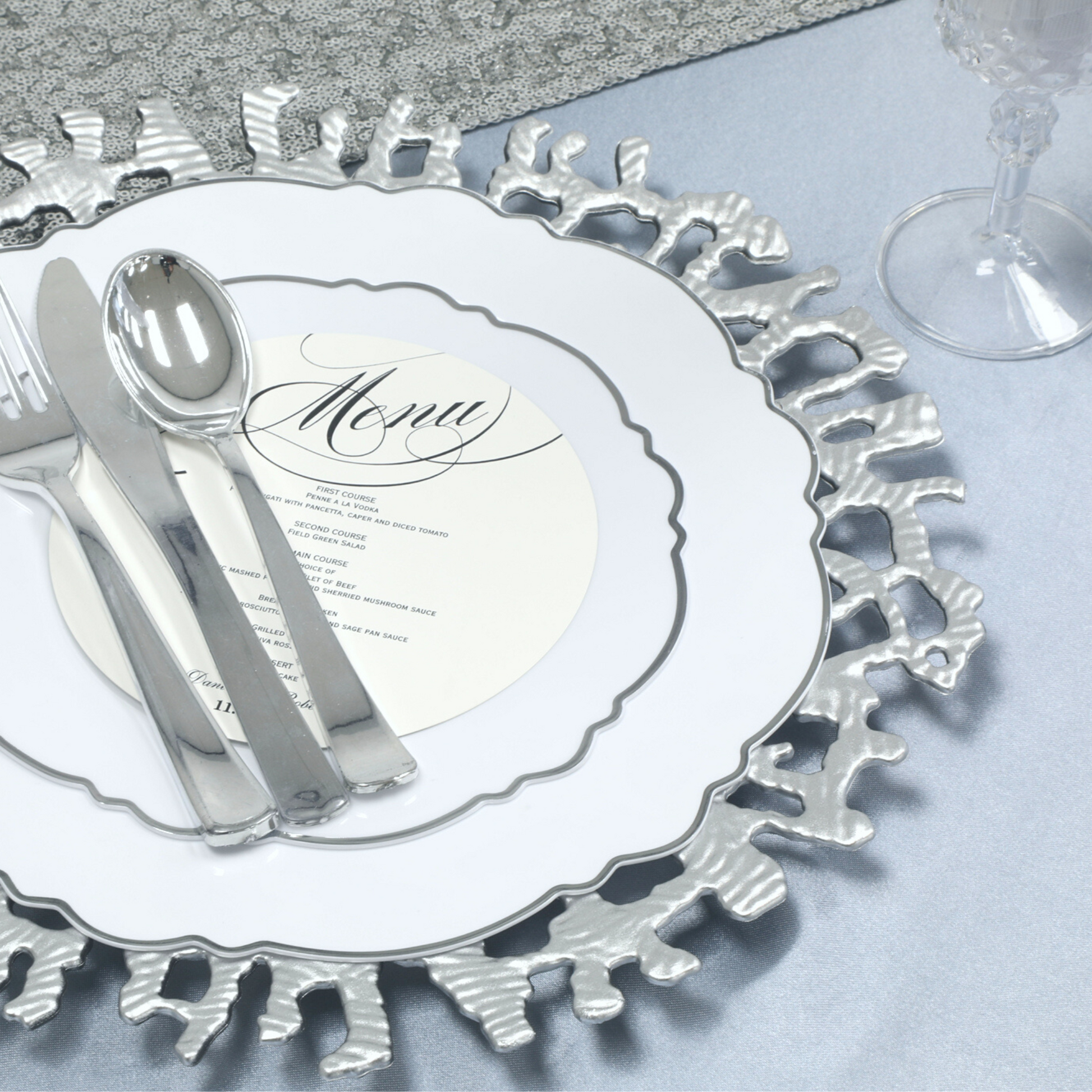 Add some style and texture to your tablescape with our silver acrylic charger plates. These shiny plates offer a unique blend of classic elegance and sophistication. Their timeless silver color gives off a classic look and is easy to pair with dark colors, vibrant hues, and neutrals. They are perfect for formal events like weddings and banquets.