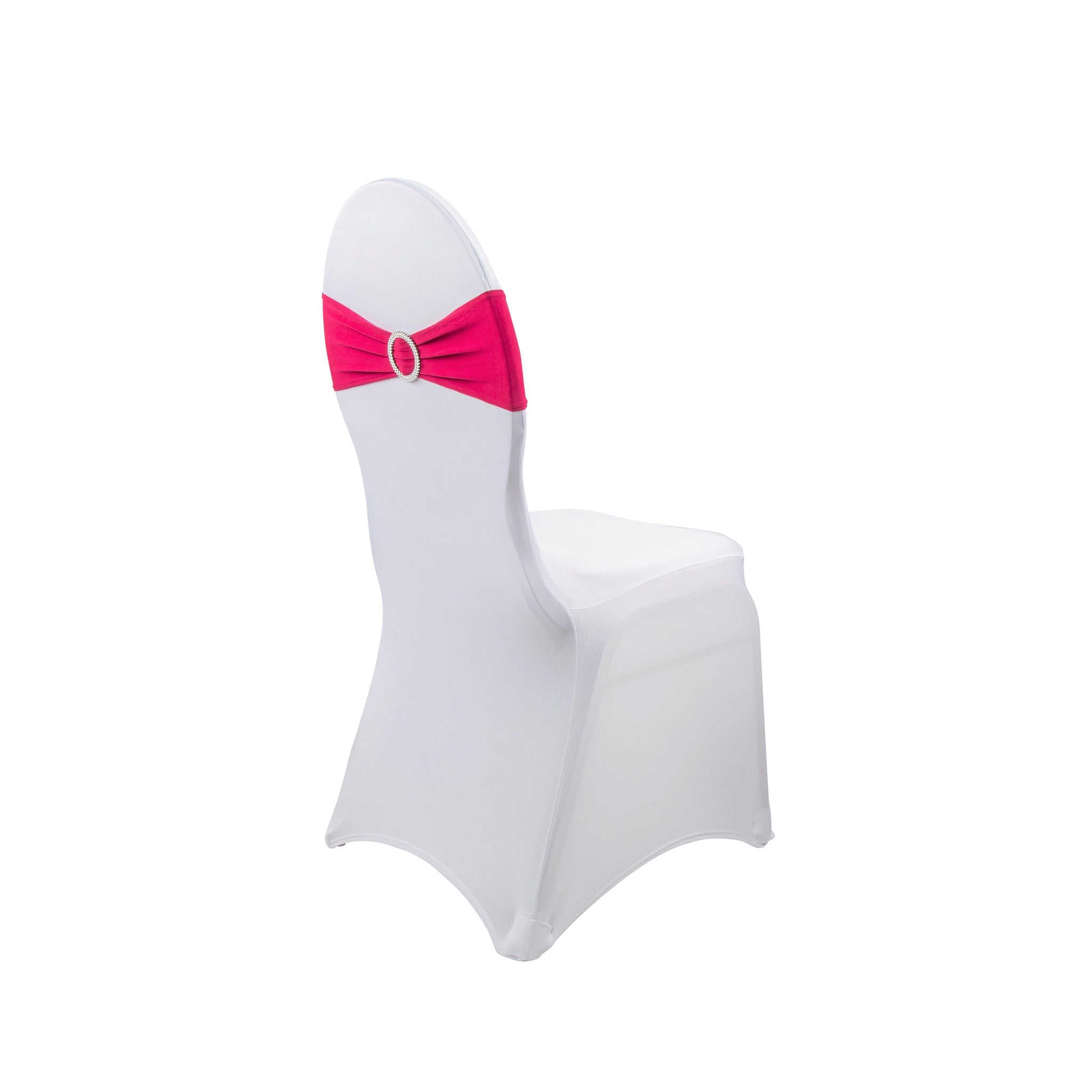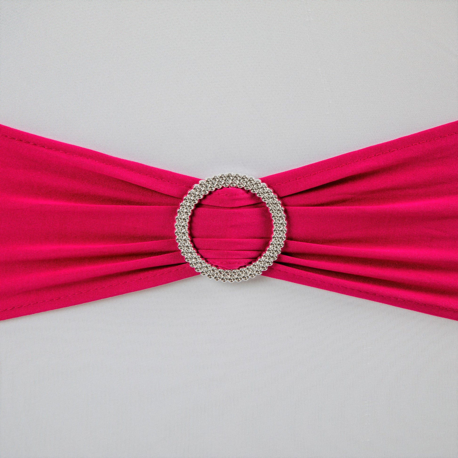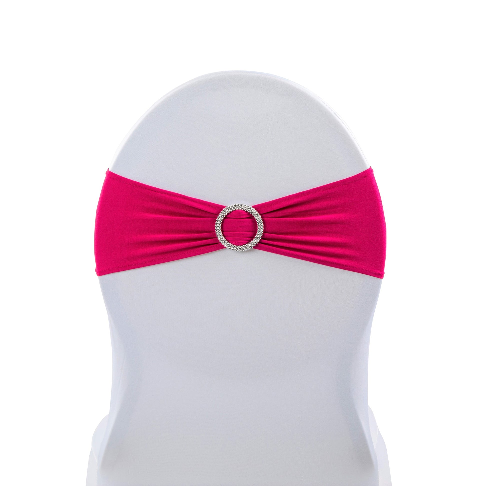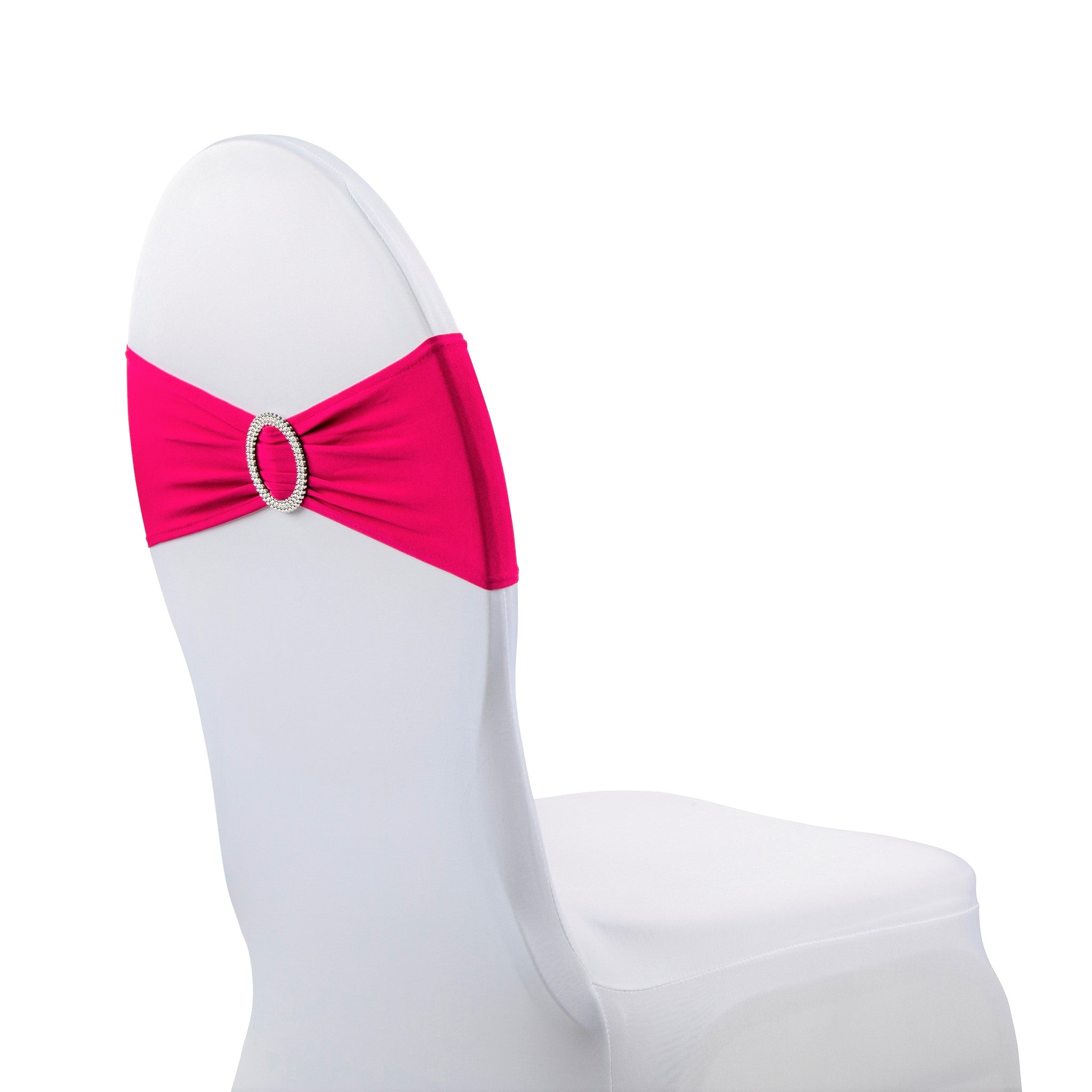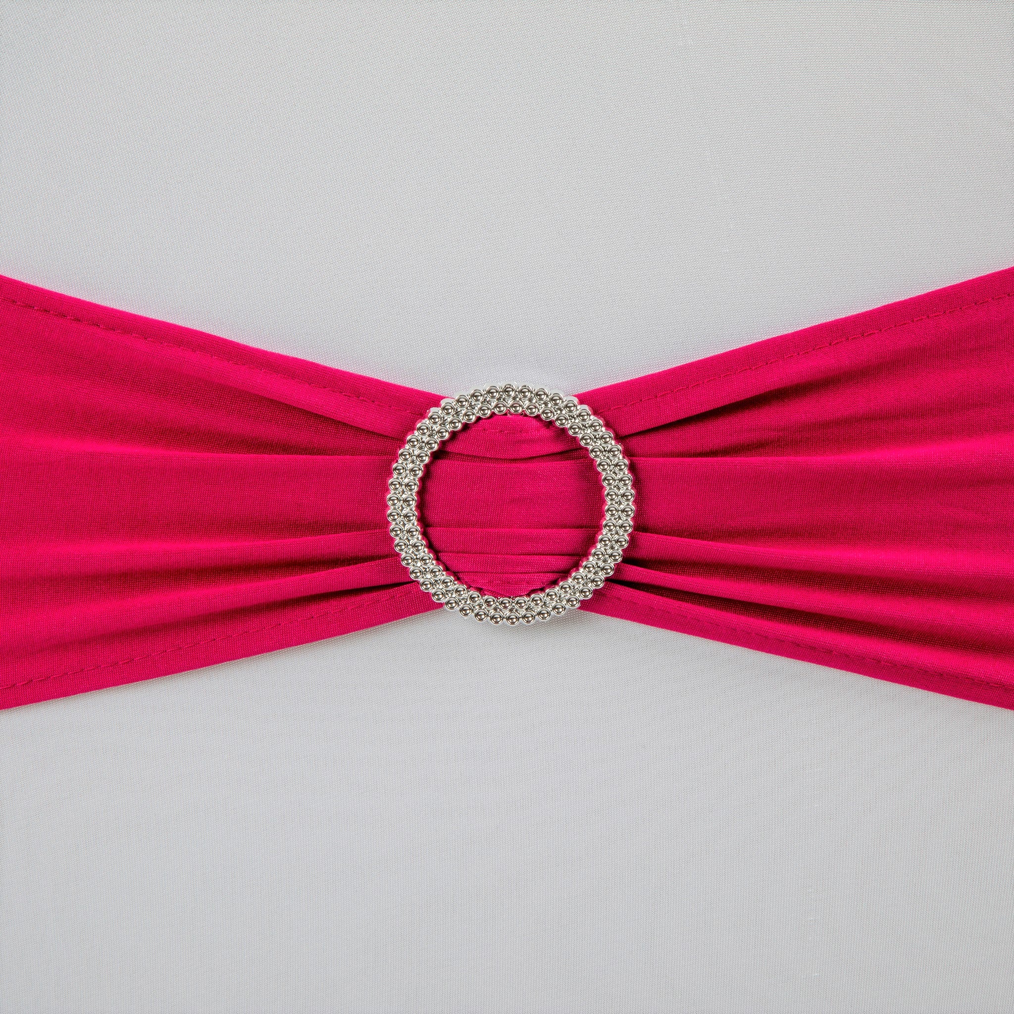 Give your guest chairs an upscale sophistication with our Buckle Spandex Stretch Chair Band - Fuchsia. Spandex chair bands with faux rhinestone buckle give off a sparkling gleam effect, perfect for elegant guest seating at your wedding ceremony, reception, birthday party, baby or bridal shower, holiday party, or corporate affair. The stretch spandex material slips easily over party chairs for a fitted look, while the built-in faux rhinestone buckle adds a flash of sparkle that will catch the event lighting and elevate the appeal of your seating arrangement.