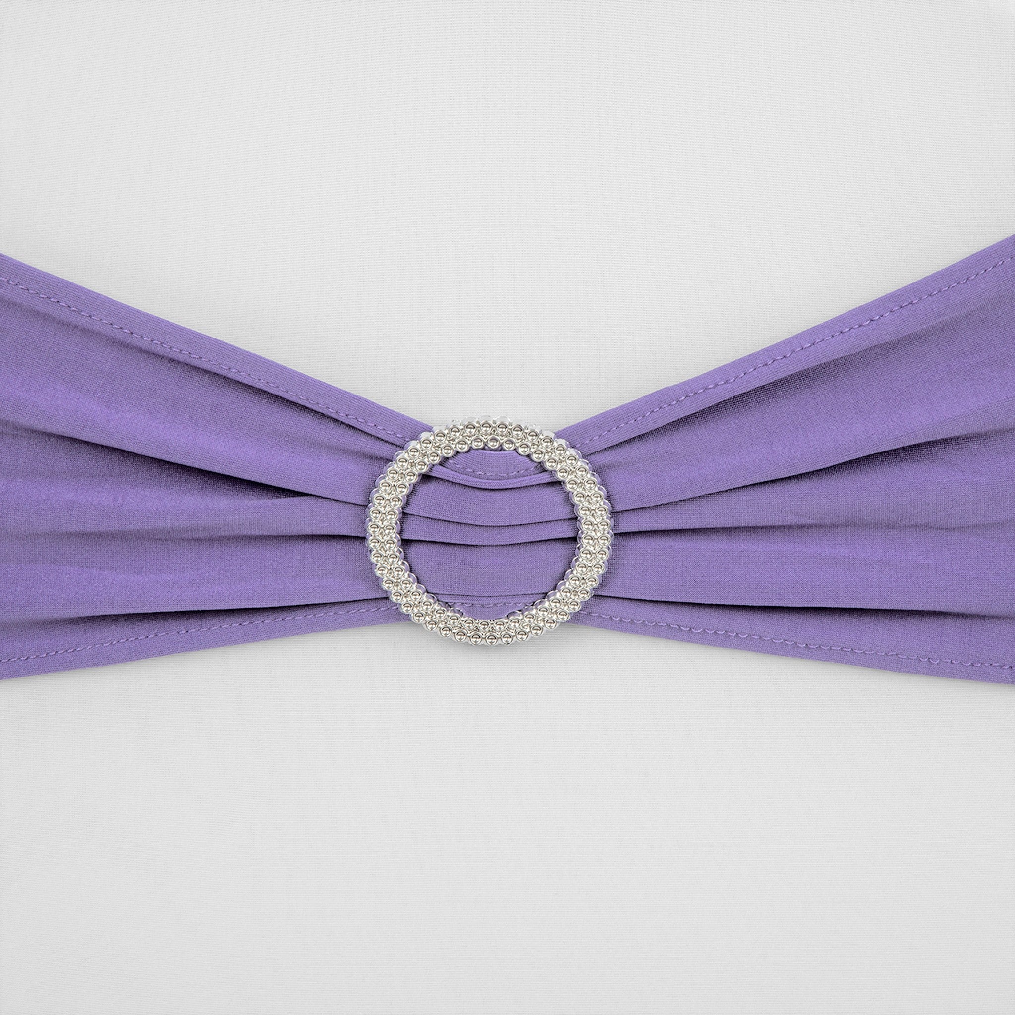 Give your guest chairs an upscale sophistication with our Buckle Spandex Stretch Chair Band - Lavender. Spandex chair bands with faux rhinestone buckle give off a sparkling gleam effect, perfect for elegant guest seating at your wedding ceremony, reception, birthday party, baby or bridal shower, holiday party, or corporate affair. The stretch spandex material slips easily over party chairs for a fitted look, while the built-in faux rhinestone buckle adds a flash of sparkle that will catch the event lighting and elevate the appeal of your seating arrangement.