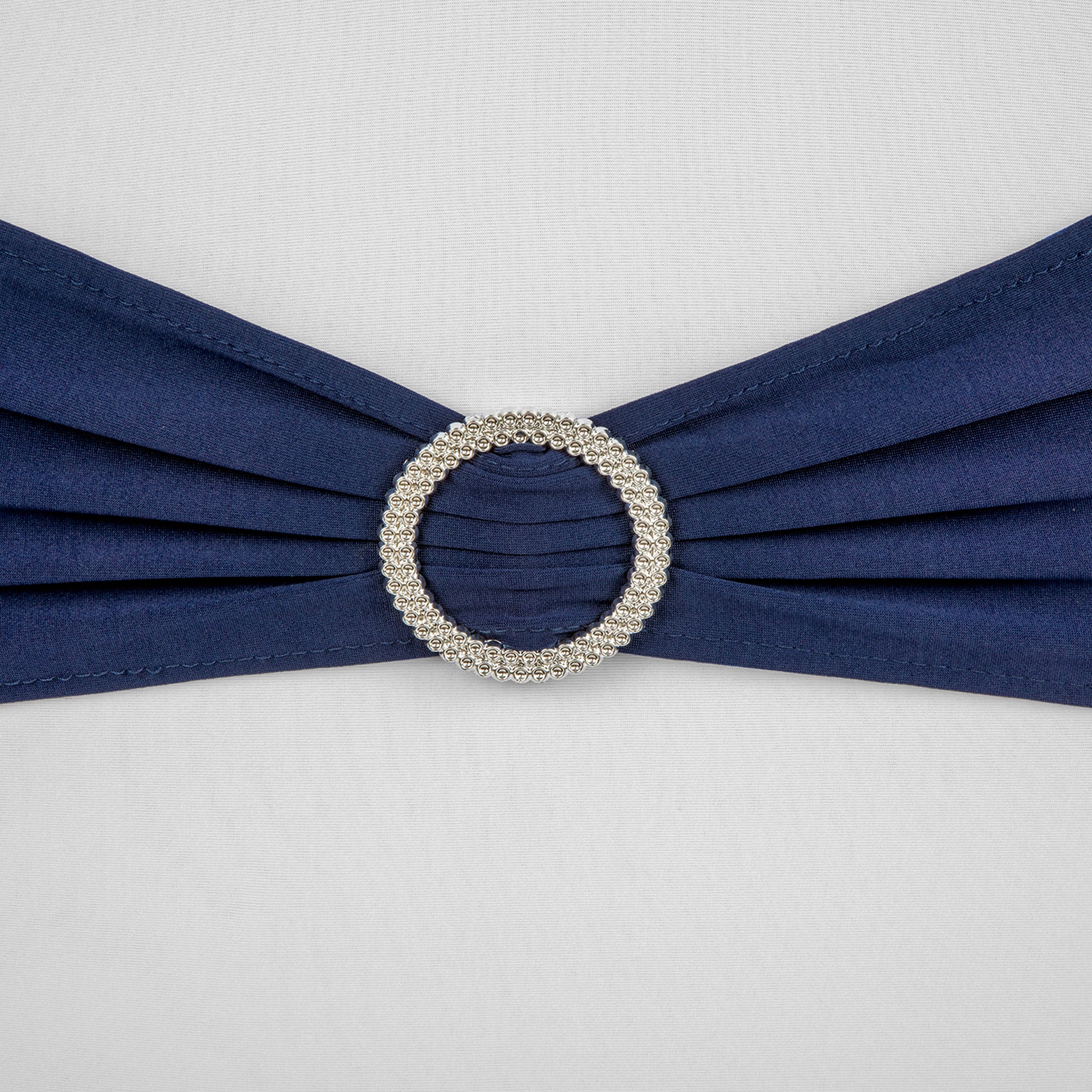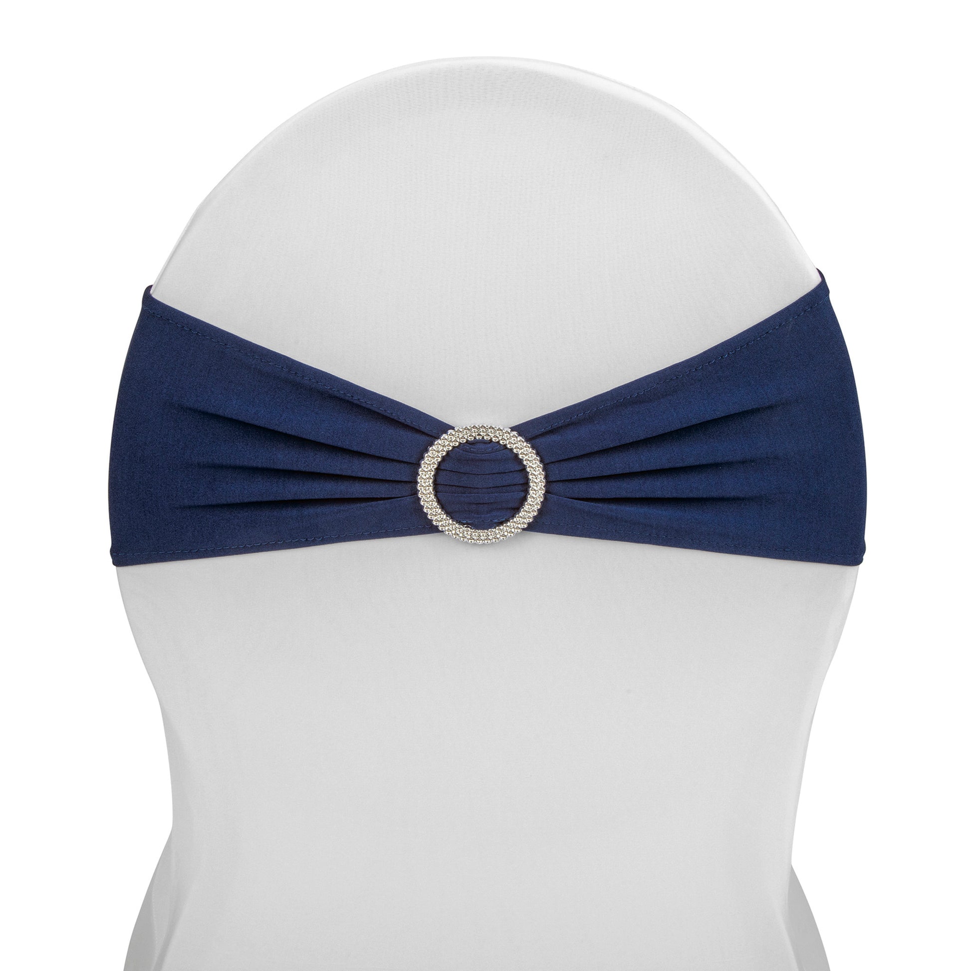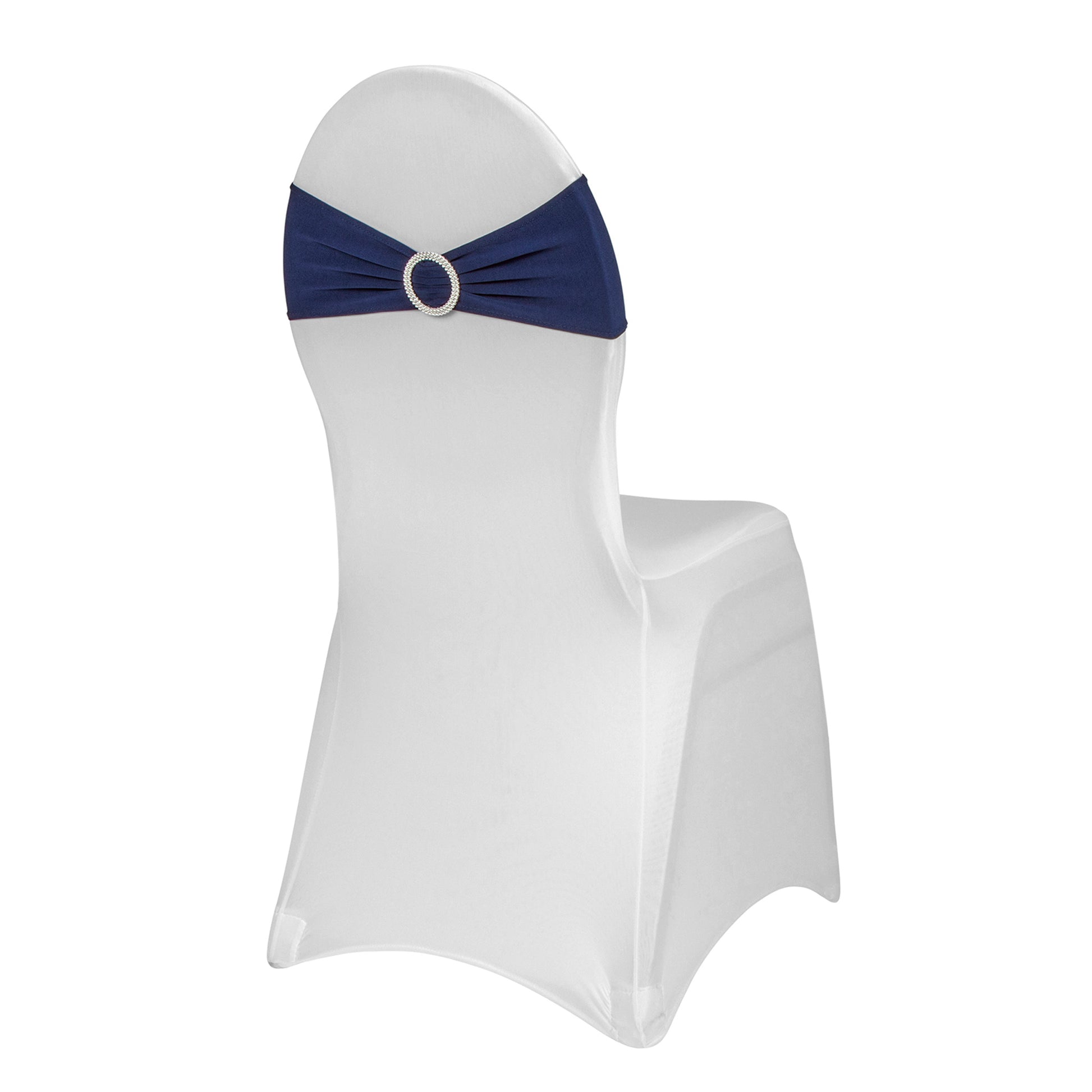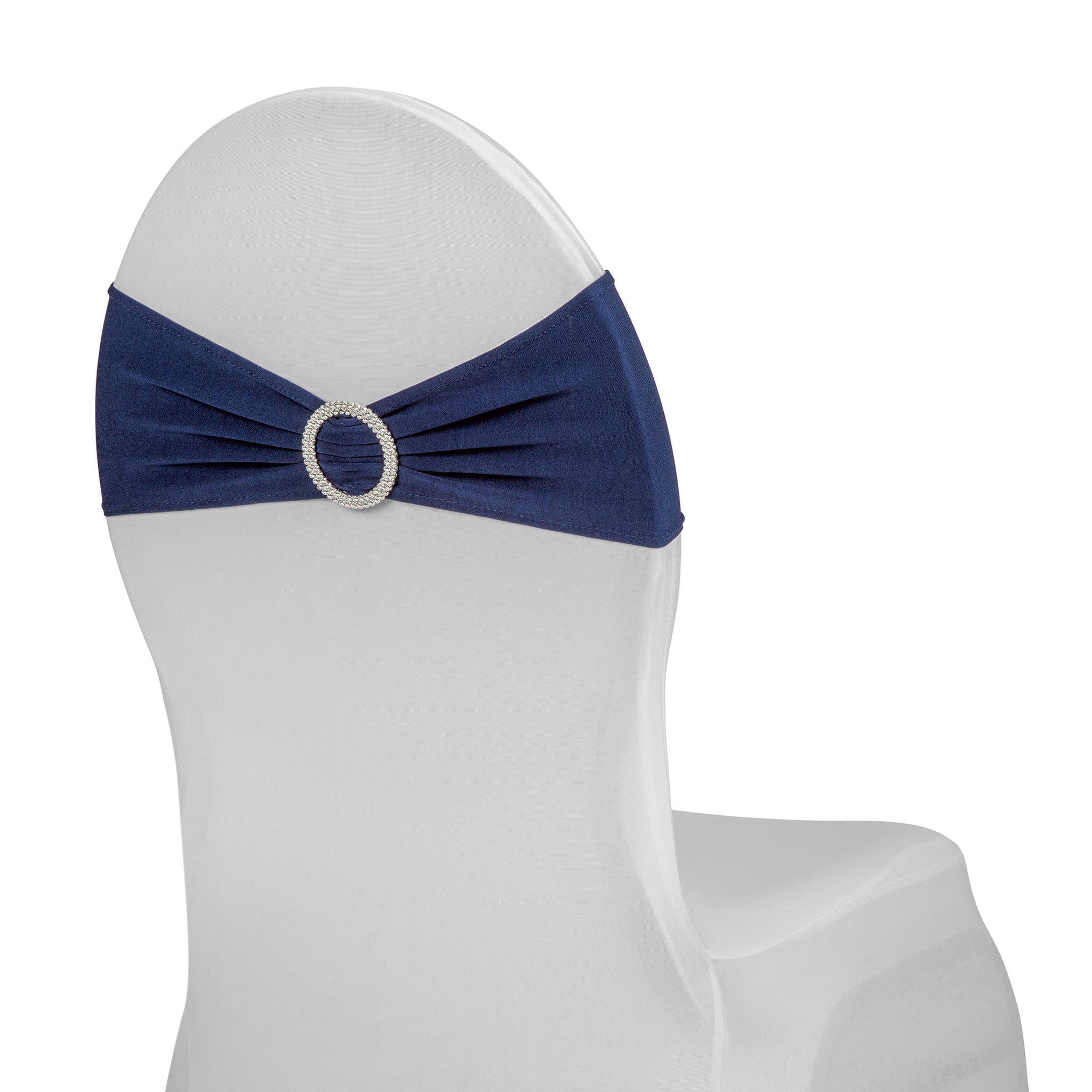 Give your guest chairs an upscale sophistication with our Buckle Spandex Stretch Chair Band - Navy Blue. Spandex chair bands with faux rhinestone buckle give off a sparkling gleam effect, perfect for elegant guest seating at your wedding ceremony, reception, birthday party, baby or bridal shower, holiday party, or corporate affair. The stretch spandex material slips easily over party chairs for a fitted look, while the built-in faux rhinestone buckle adds a flash of sparkle that will catch the event lighting and elevate the appeal of your seating arrangement.