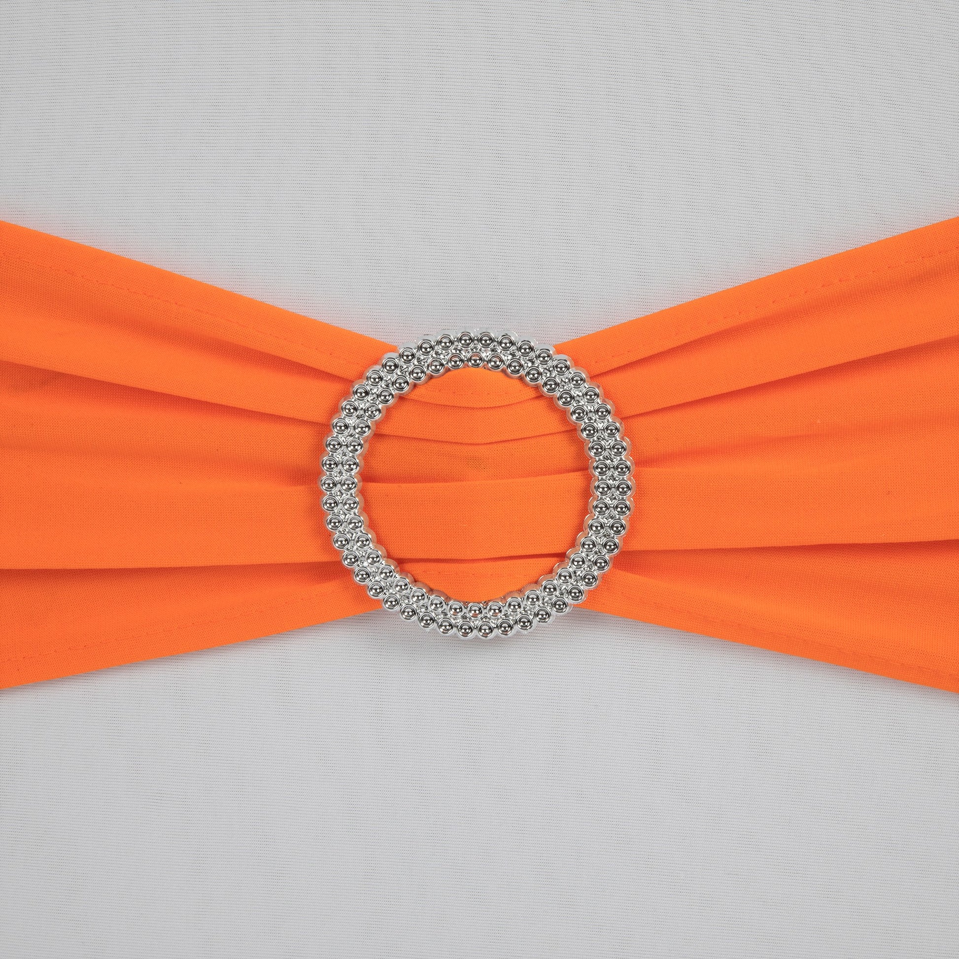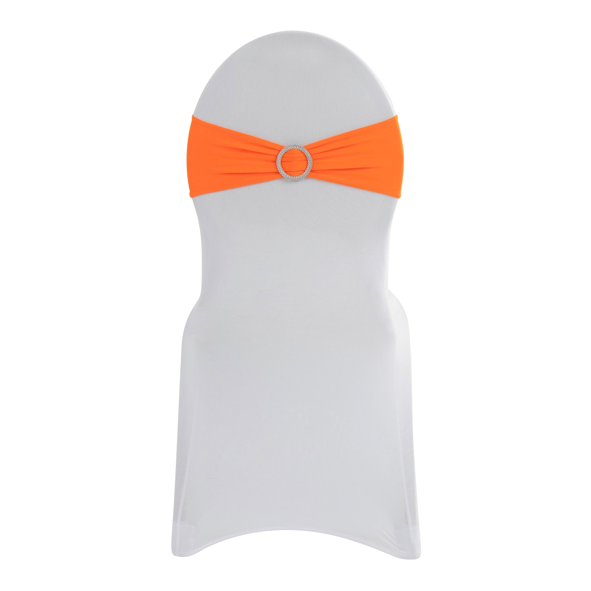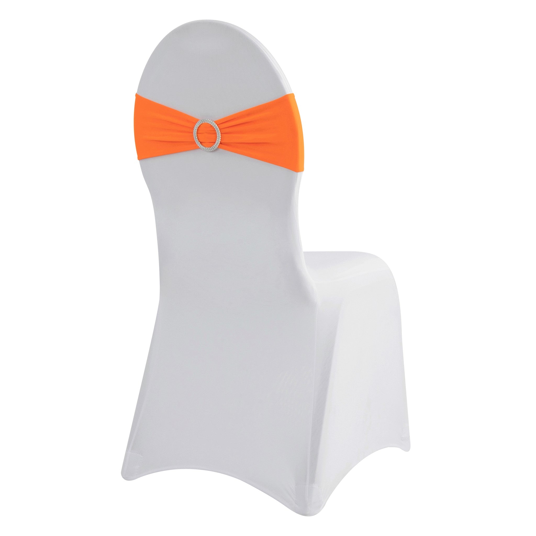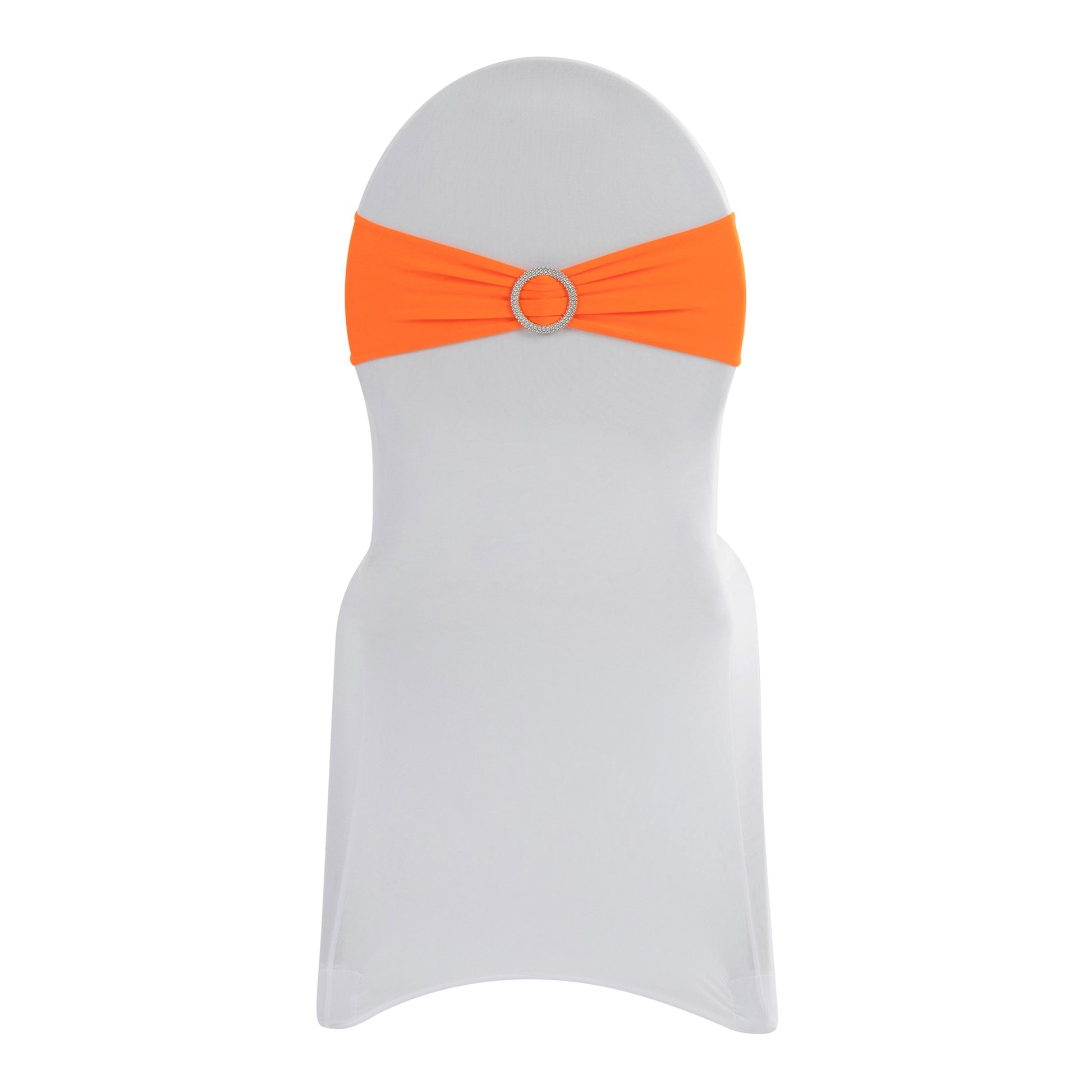 Give your guest chairs an upscale sophistication with our Buckle Spandex Stretch Chair Band - Orange. Spandex chair bands with faux rhinestone buckle give off a sparkling gleam effect, perfect for elegant guest seating at your wedding ceremony, reception, birthday party, baby or bridal shower, holiday party, or corporate affair. The stretch spandex material slips easily over party chairs for a fitted look, while the built-in faux rhinestone buckle adds a flash of sparkle that will catch the event lighting and elevate the appeal of your seating arrangement.