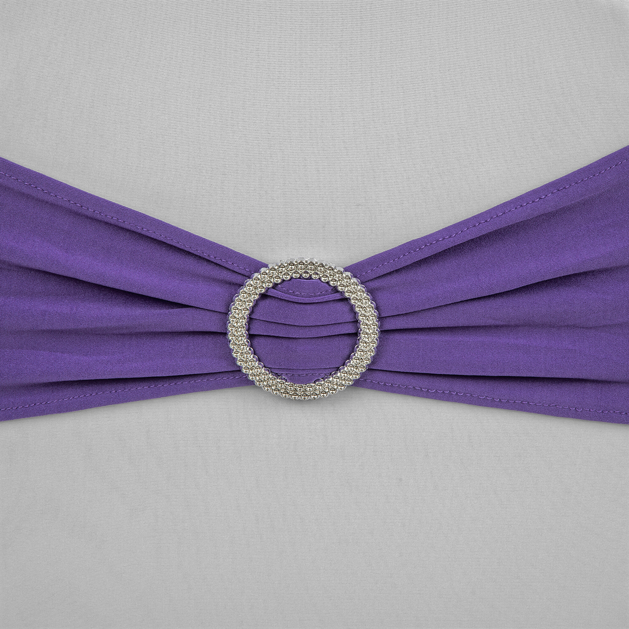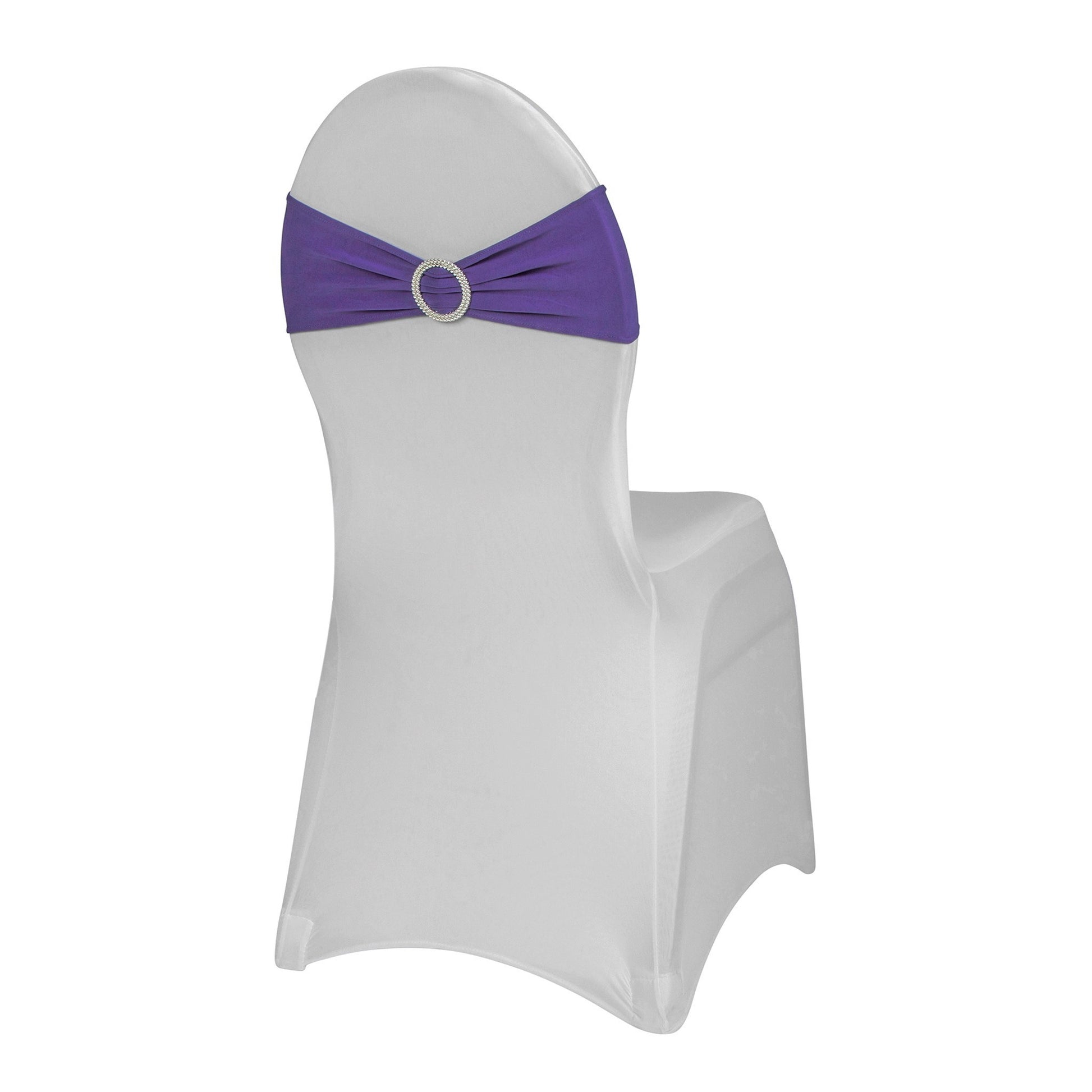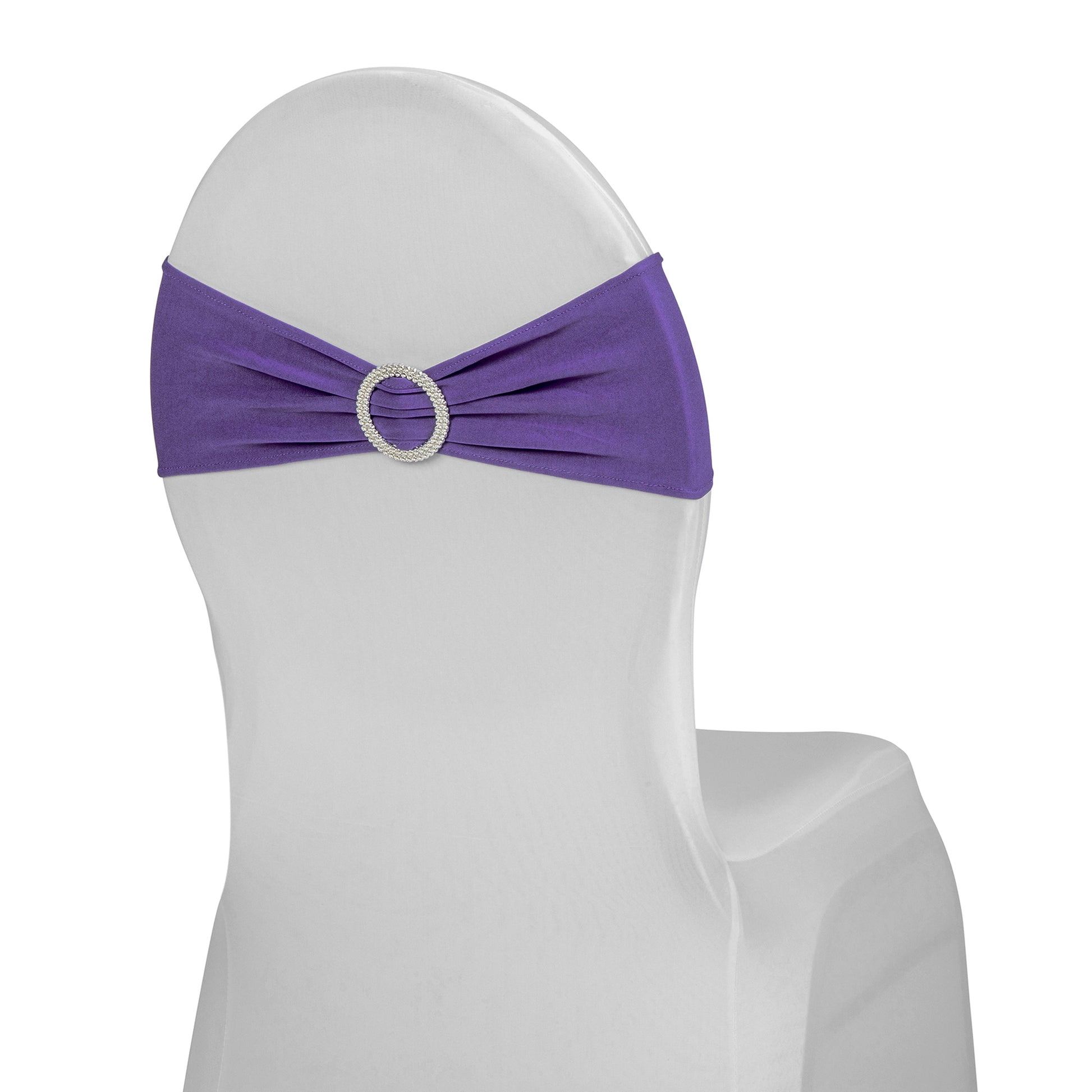 Give your guest chairs an upscale sophistication with our Buckle Spandex Stretch Chair Band - Purple. Spandex chair bands with faux rhinestone buckle give off a sparkling gleam effect, perfect for elegant guest seating at your wedding ceremony, reception, birthday party, baby or bridal shower, holiday party, or corporate affair. The stretch spandex material slips easily over party chairs for a fitted look, while the built-in faux rhinestone buckle adds a flash of sparkle that will catch the event lighting and elevate the appeal of your seating arrangement.