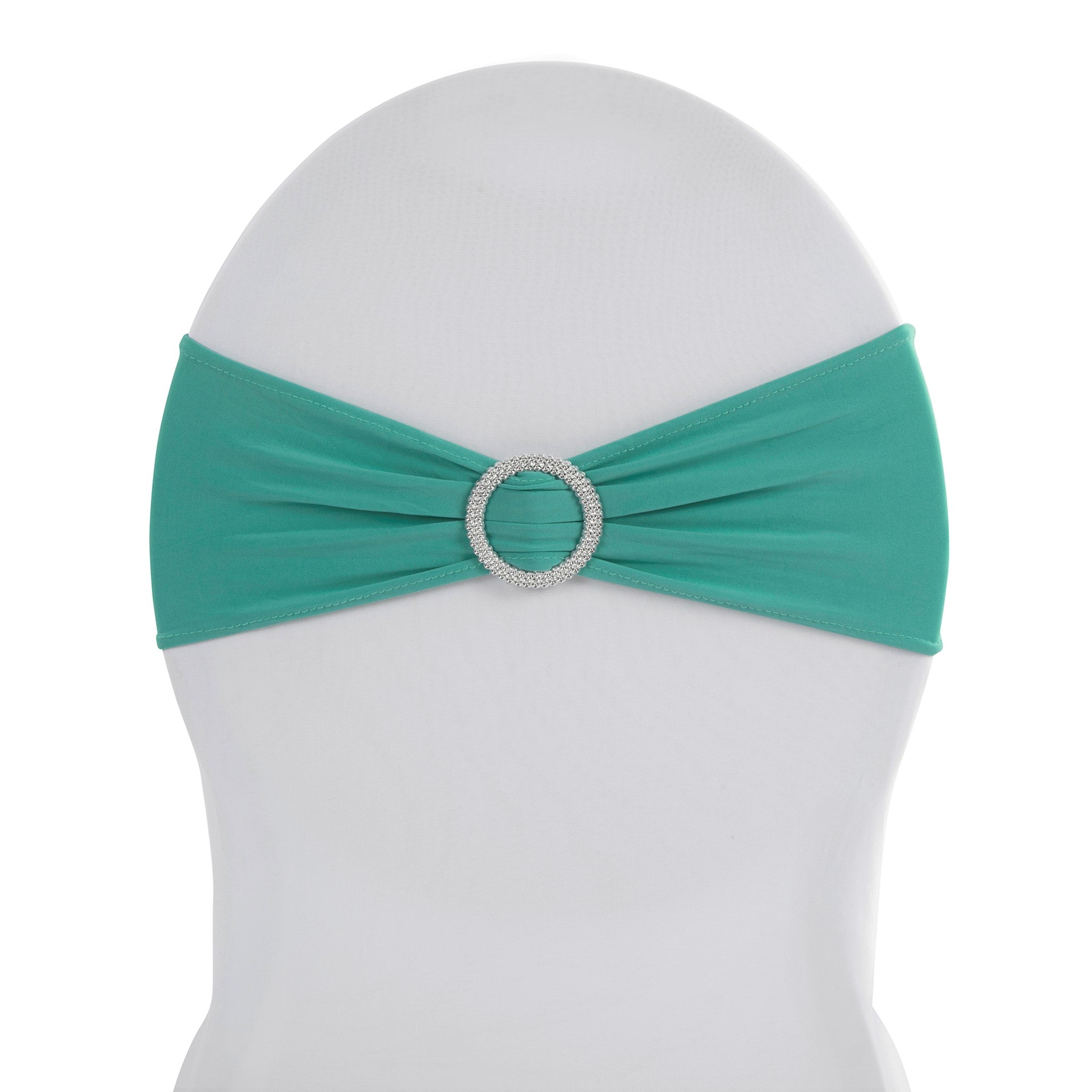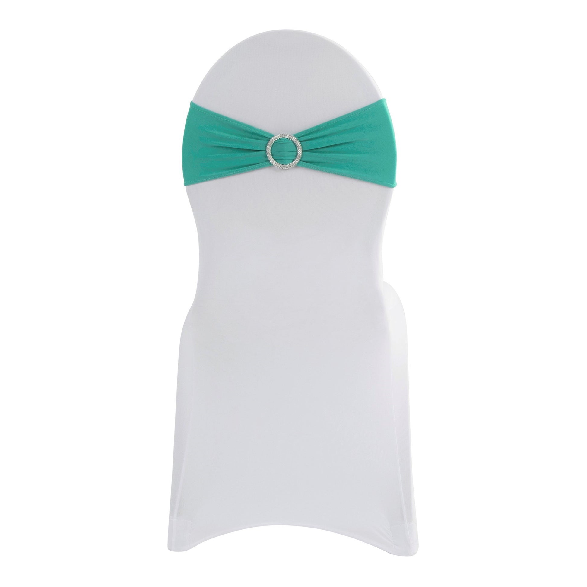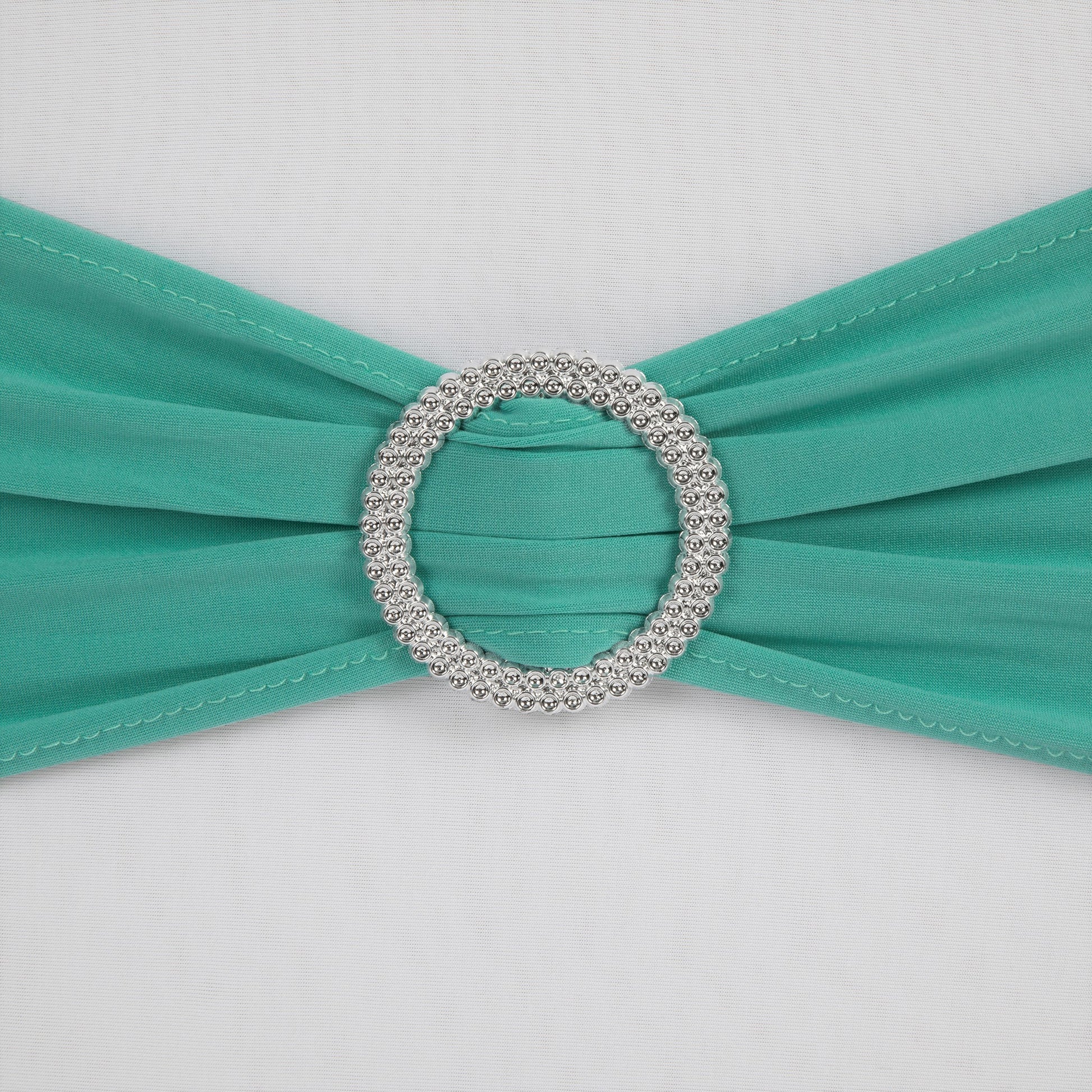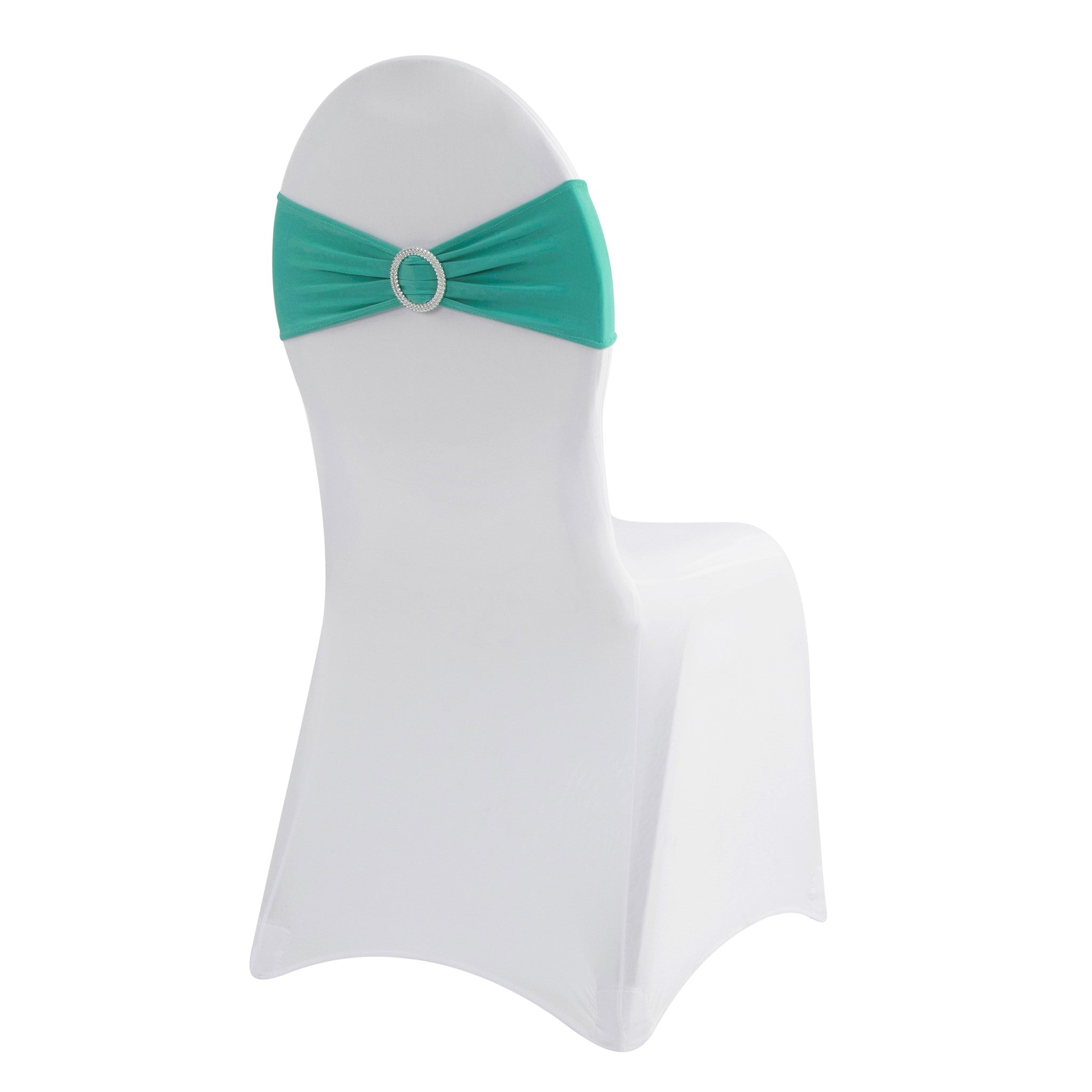 Give your guest chairs an upscale sophistication with our Buckle Spandex Stretch Chair Band - Turquoise. Spandex chair bands with faux rhinestone buckle give off a sparkling gleam effect, perfect for elegant guest seating at your wedding ceremony, reception, birthday party, baby or bridal shower, holiday party, or corporate affair. The stretch spandex material slips easily over party chairs for a fitted look, while the built-in faux rhinestone buckle adds a flash of sparkle that will catch the event lighting and elevate the appeal of your seating arrangement.