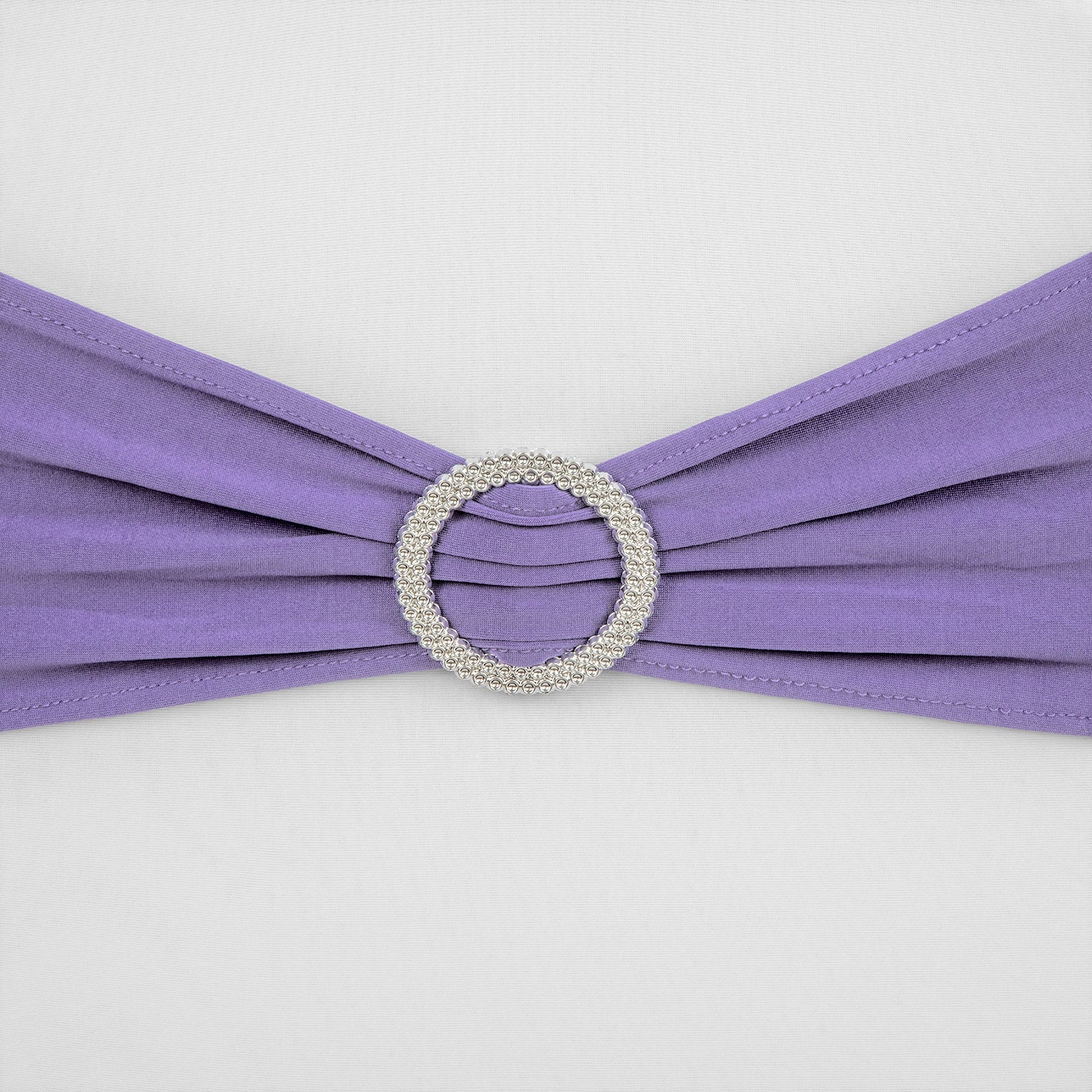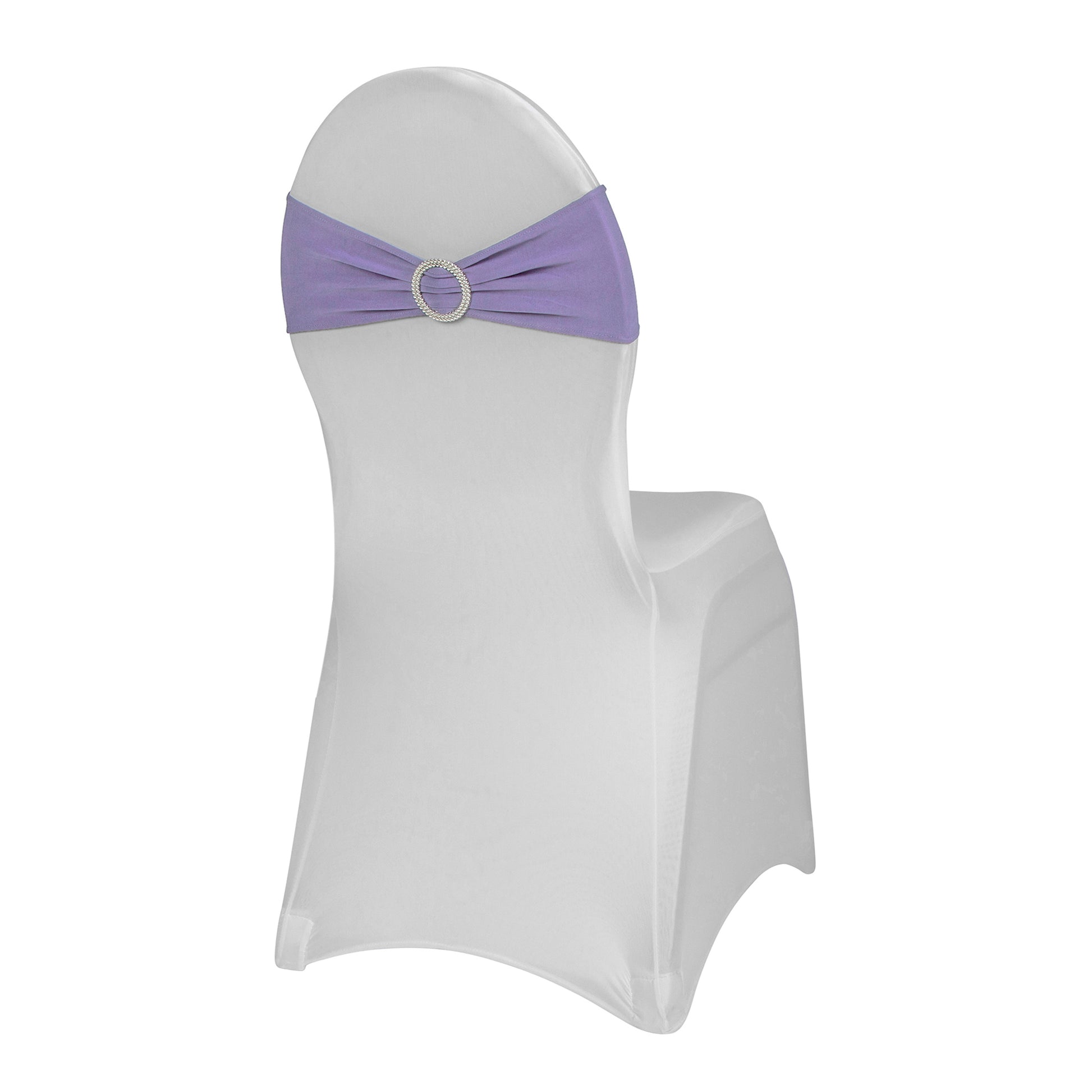 Give your guest chairs an upscale sophistication with our Buckle Spandex Stretch Chair Band - Victorian Lilac/Wisteria. Spandex chair bands with faux rhinestone buckle give off a sparkling gleam effect, perfect for elegant guest seating at your wedding ceremony, reception, birthday party, baby or bridal shower, holiday party, or corporate affair. The stretch spandex material slips easily over party chairs for a fitted look, while the built-in faux rhinestone buckle adds a flash of sparkle that will catch the event lighting and elevate the appeal of your seating arrangement.