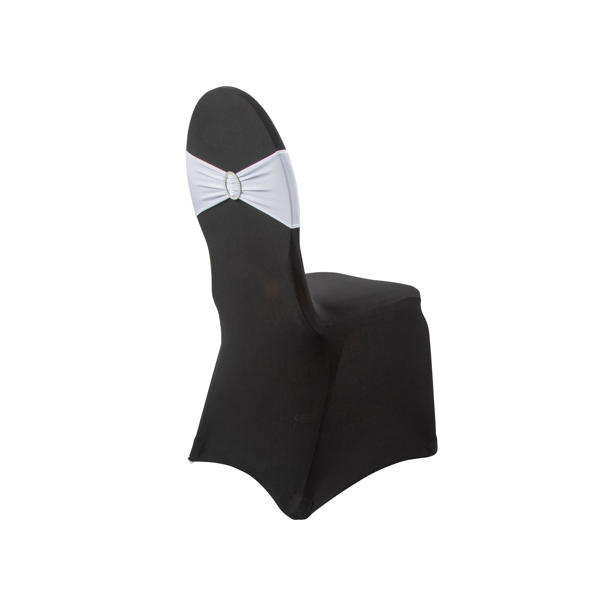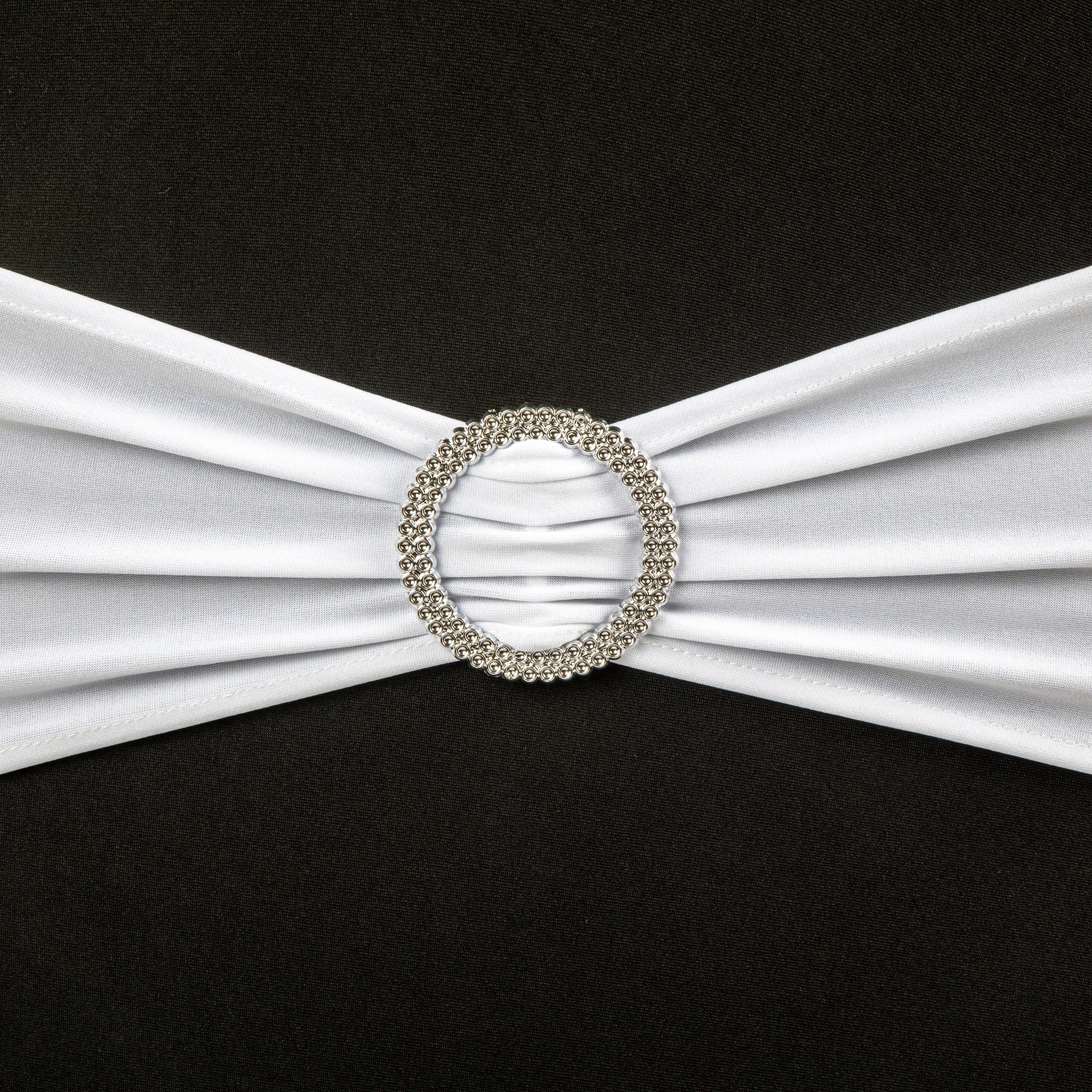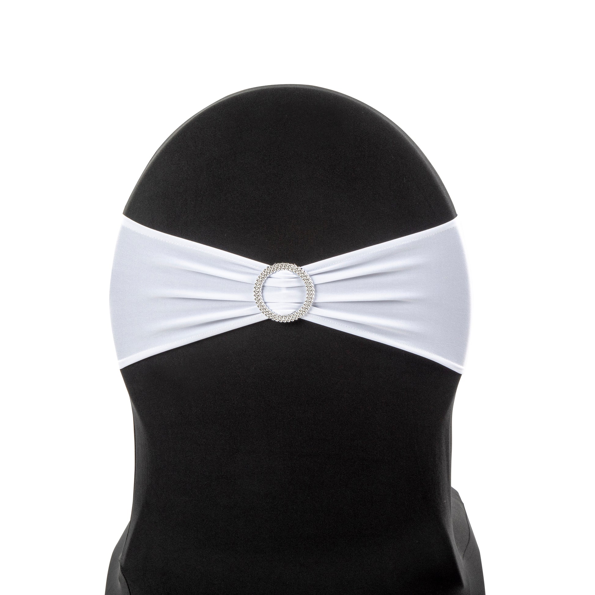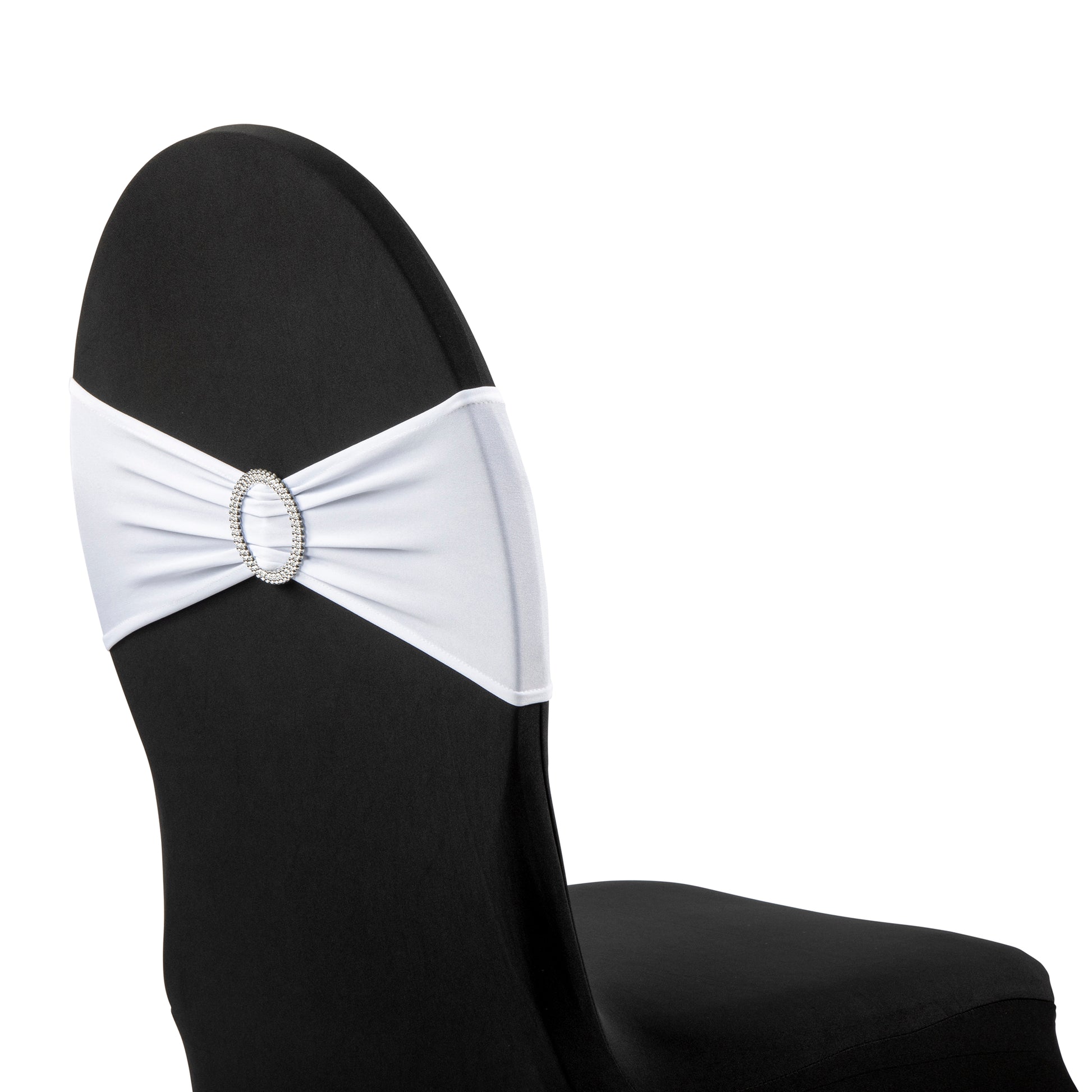 Give your guest chairs an upscale sophistication with our Buckle Spandex Stretch Chair Band - White. Spandex chair bands with faux rhinestone buckle give off a sparkling gleam effect, perfect for elegant guest seating at your wedding ceremony, reception, birthday party, baby or bridal shower, holiday party, or corporate affair. The stretch spandex material slips easily over party chairs for a fitted look, while the built-in faux rhinestone buckle adds a flash of sparkle that will catch the event lighting and elevate the appeal of your seating arrangement.