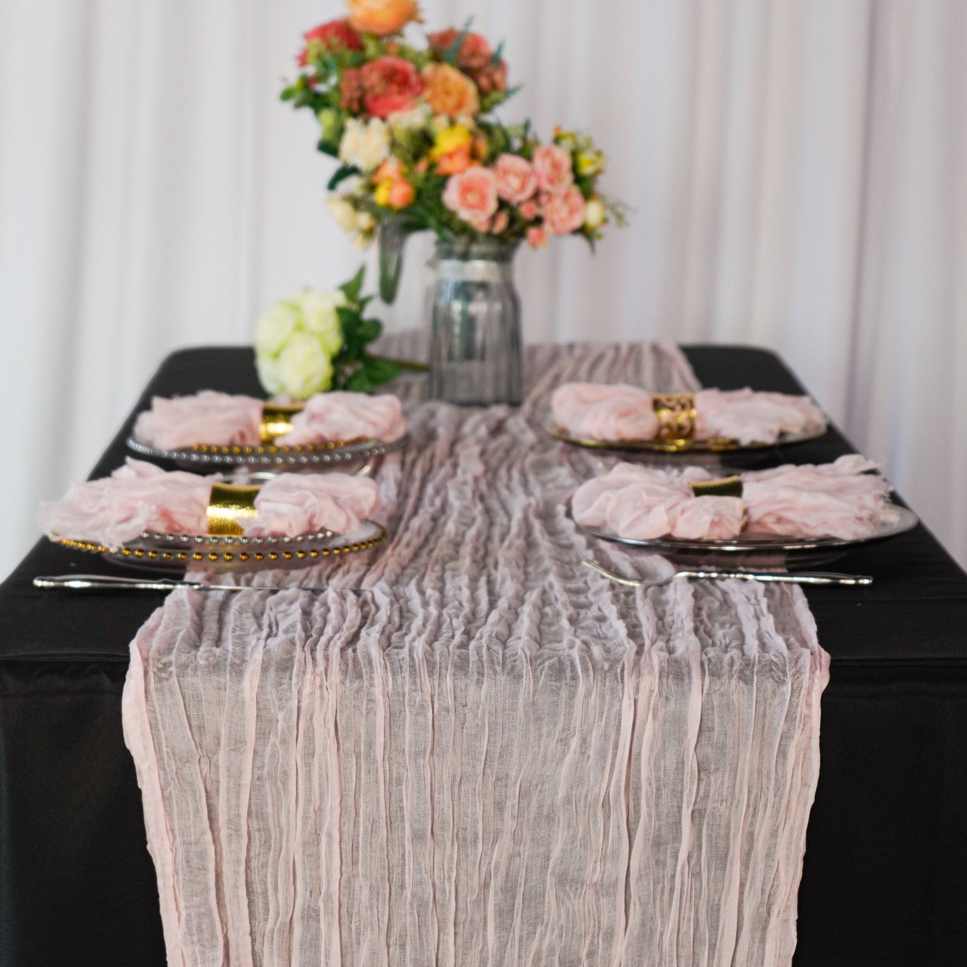 Blush/Rose Gold Cheesecloth Napkins are a good way to dress your tablescape, especially if you're going for a chic-boho look.