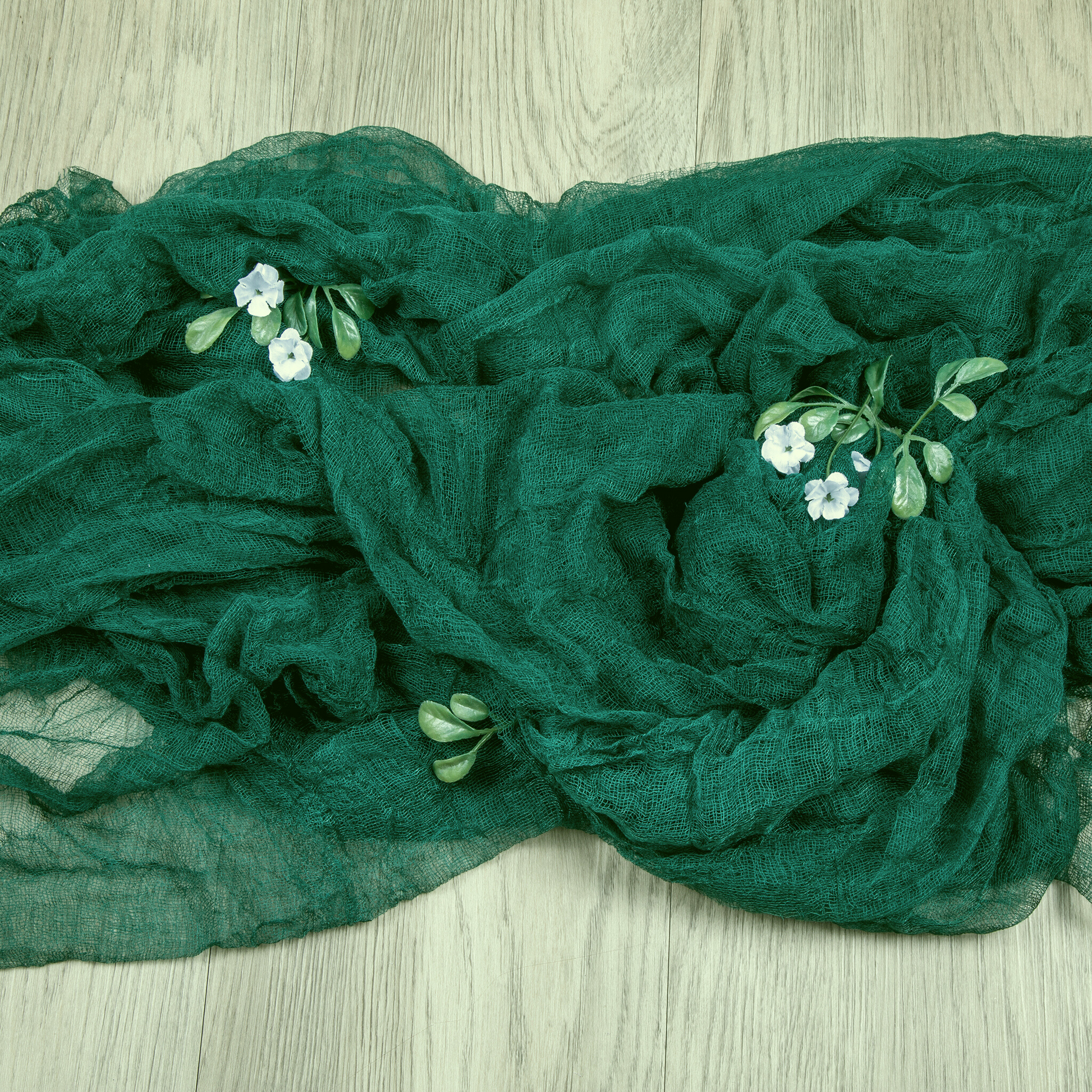 Your guests will be impressed with your decorating skills when you enhance your venue with the appeal of our Cheesecloth Table Runner 25" x 16ft - Hunter Green. This lightweight, gauzy material boasts a romantic ambiance that is a perfect addition for rustic, boho, or vintage events. Cheesecloth table linens are perfect for draping solo or pairing them over tablecloths. Wooden tables provide an exquisite texture all their own, and a cheesecloth table runner allows you to introduce elegant notes without detracting from the beauty of the existing surface. Ample and generous in size, the 192" length is great for achieving a perfect cascading, pooling effect. With the help of ribbons ties, you can tie up the table runner to gain a more finished look. This very light and effortless look is captured in a 25" width which is great for gathering around candles or floral centerpieces. The textured gauze of this rustic table linen requires little to no prep before events, assuring your setup is effortless and the result breathtaking!