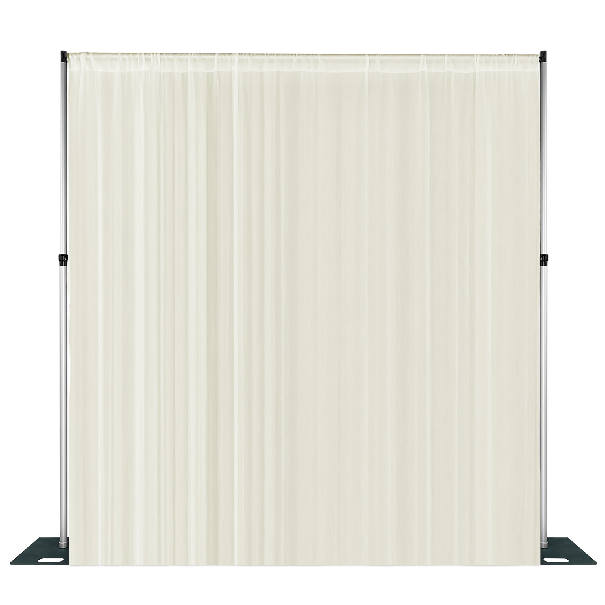 Our metal backdrop stand is an adjustable, heavy-duty backdrop stand kit that allows you to customize the height and width of your backdrop. It provides excellent stability and support, so you can confidently hang your Ivory Chiffon Curtain Drape to create a captivating focal point for your event. This is essential for accommodating various event spaces and styles, providing the flexibility you need to create a captivating backdrop.