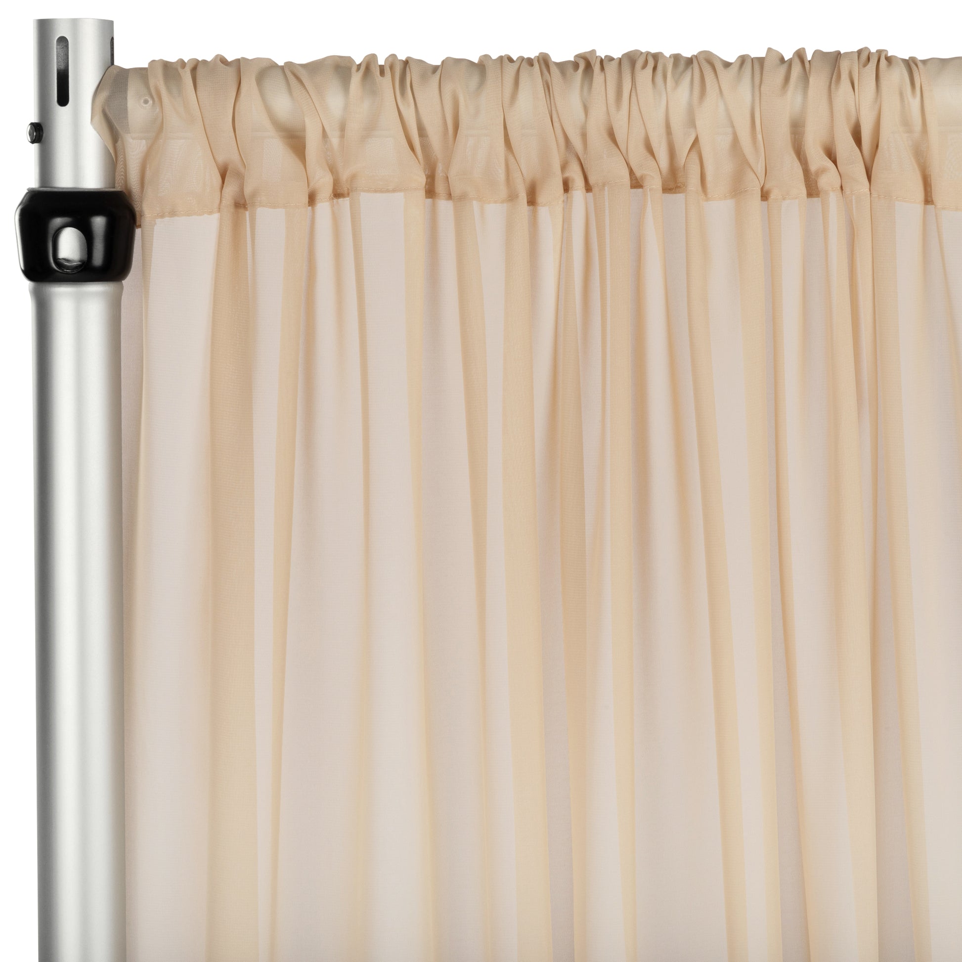 Our Chiffon Curtain Drape 12ft H x 58" W Panel - Champagne showcases exceptional flow, and with its timeless style, it's an obvious choice to compliment all other decor. Boasting a superb drape, this curtain panel promotes a luxurious appearance preferred by professional photographers, event planners, and brides alike. The sheer, transparent nature of chiffon creates a flowing aesthetic that is great for draping ceilings or creating a canopy, as well as becoming a beautiful photo backdrop or ethereal window covering.