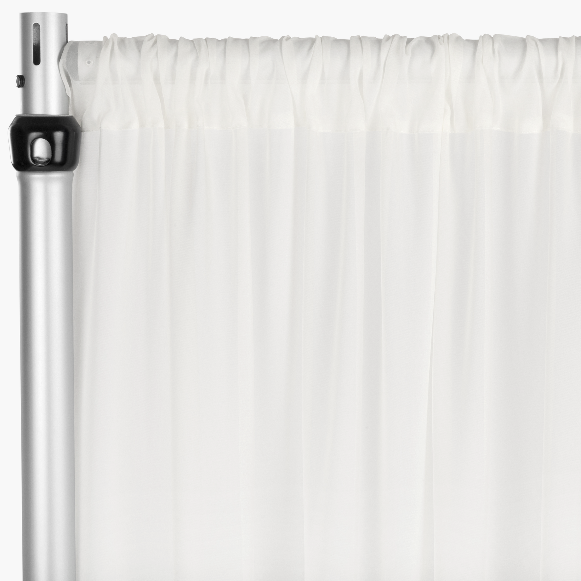 Our Chiffon Curtain Drape 12ft H x 58" W Panel - Off White/Light Ivory showcases exceptional flow, and with its timeless style, it's an obvious choice to compliment all other decor. Boasting a superb drape, this curtain panel promotes a luxurious appearance preferred by professional photographers, event planners, and brides alike. The sheer, transparent nature of chiffon creates a flowing aesthetic that is great for draping ceilings or creating a canopy, as well as becoming a beautiful photo backdrop or ethereal window covering.