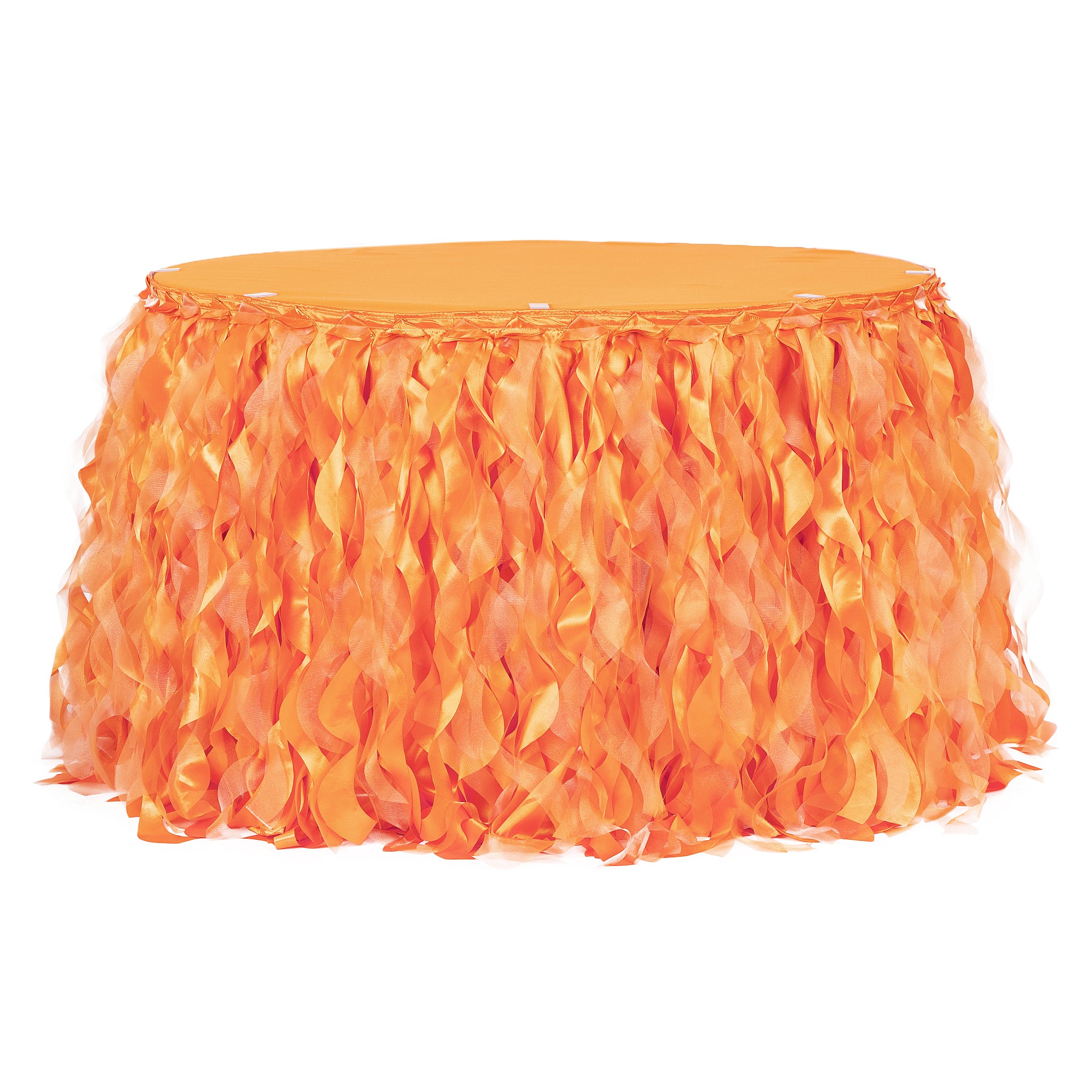 Our Curly Willow product line just became a little more fantastic with our New Curly Willow Table Skirts! Our new, updated Curly Willow design features the same whimsical look of spiraling taffeta and organza with a taffeta lining, only this time with a higher quality, more luxurious grade of material. As an added bonus, it's also available in stunning new colors! Our table skirts make a huge decorative impact at weddings, quinceaneras, birthday celebrations, and more by incorporating color and texture for a beautiful combination. As with traditional table skirts there is a 1" velcro strip sewn into the top, table-facing side, and a tablecloth or table topper will need to be purchased to cover the top of your table. Transform your event into a dreamy wonderland with our New Curly Willow Table Skirts!
