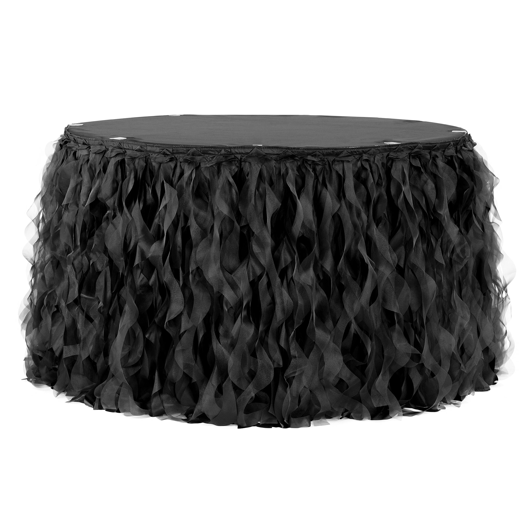 Our Curly Willow product line just became a little more fantastic with our New Curly Willow Table Skirts! Our new, updated Curly Willow design features the same whimsical look of spiraling taffeta and organza with a taffeta lining, only this time with a higher quality, more luxurious grade of material. As an added bonus, it's also available in stunning new colors! Our table skirts make a huge decorative impact at weddings, quinceaneras, birthday celebrations, and more by incorporating color and texture for a beautiful combination. As with traditional table skirts there is a 1" velcro strip sewn into the top, table-facing side, and a tablecloth or table topper will need to be purchased to cover the top of your table. Transform your event into a dreamy wonderland with our New Curly Willow Table Skirts!