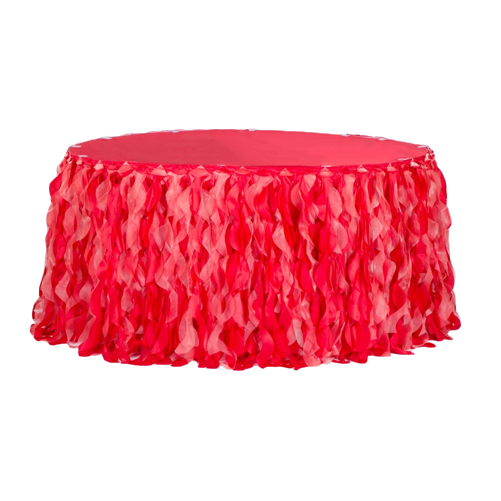 Our Curly Willow product line just became a little more fantastic with our New Curly Willow Table Skirts! Our new, updated Curly Willow design features the same whimsical look of spiraling taffeta and organza with a taffeta lining, only this time with a higher quality, more luxurious grade of material. As an added bonus, it's also available in stunning new colors! Our table skirts make a huge decorative impact at weddings, quinceaneras, birthday celebrations, and more by incorporating color and texture for a beautiful combination. As with traditional table skirts there is a 1" velcro strip sewn into the top, table-facing side, and a tablecloth or table topper will need to be purchased to cover the top of your table. Transform your event into a dreamy wonderland with our New Curly Willow Table Skirts!