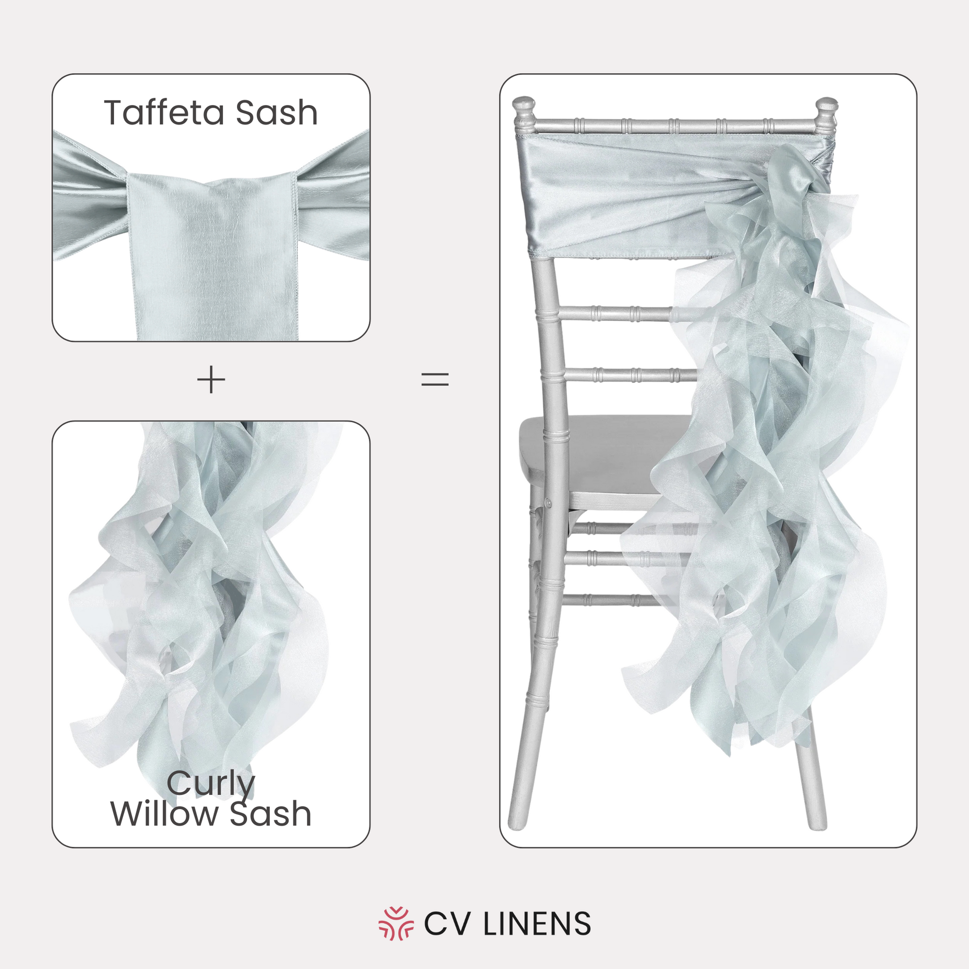 This willow sash is made of taffeta and organza. It creates a tuft of delicate curls to add detail to your chair backrest. Organza is a popular material known for its delicate fabric with a soft shimmer.