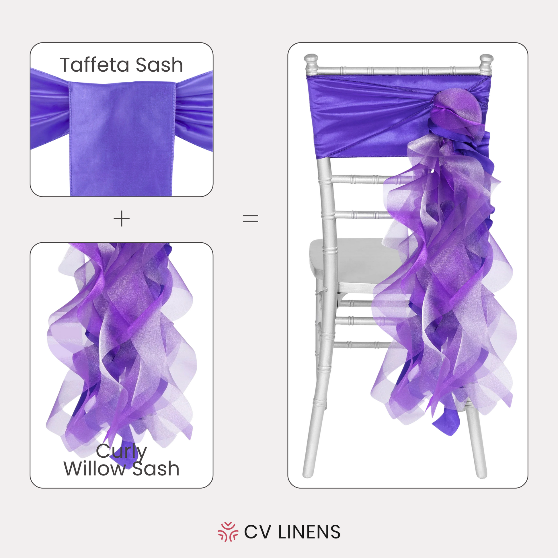 Add a touch of elegance to your party chairs with our purple chair sashes for wedding parties. Our curly willow chair sashes with a measurement of approximately 29" long. It features 14 strands for a lush cascading curl for a luxurious look.