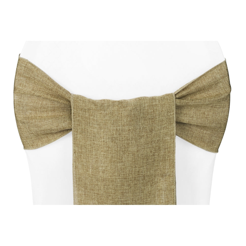 Create a cohesive theme across your venue with this faux burlap natural tan sash that offers endless decorating possibilities. Choose from a wide array of chair covers to add texture and contrast. Style your faux burlap chair sash over a white chair cover to serve as an accent rustic piece.