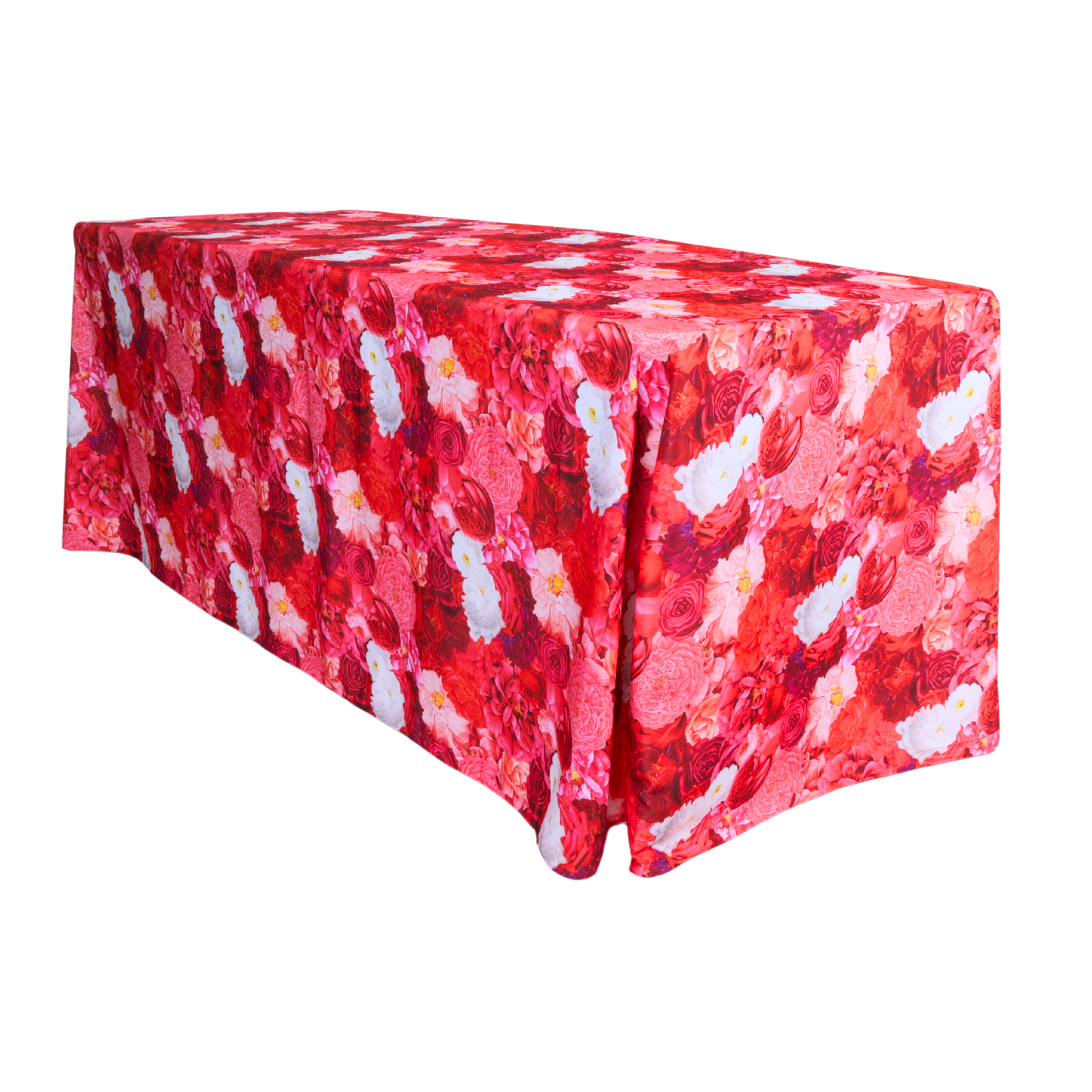 The dimensions 90”x132” of these tablecloths will elegantly drop to the floor on all sides when used on a 6ft rectangular table. You can also use this floral rectangular tablecloth on standard height 8ft tables, which will have a 15” overhang on the short side and drop to the floor on the long side.