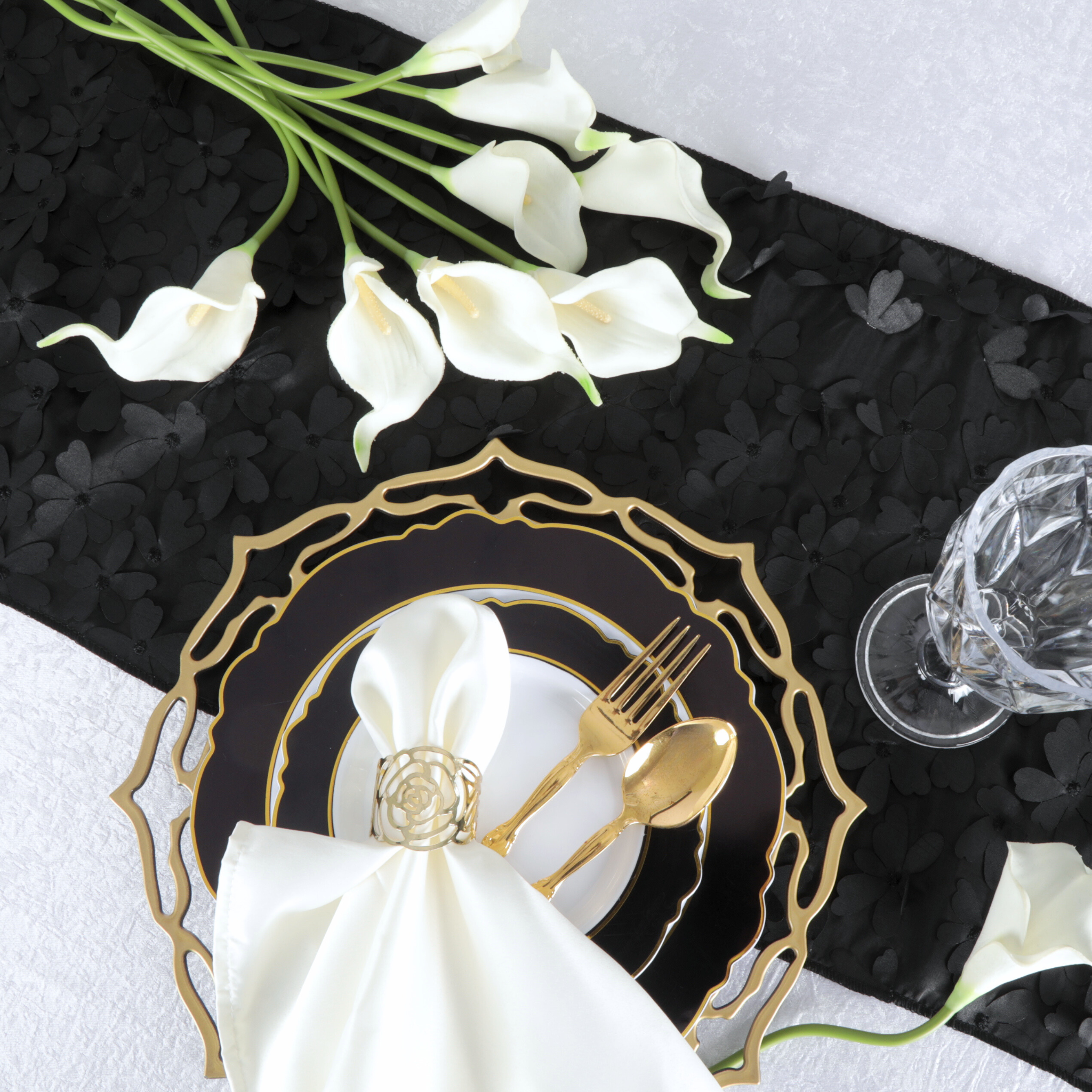 In any table arrangement, every little thing matters, and a well-chosen table runner can quietly elevate any gathering's vibe. Because of its intricate design, which evokes a blooming garden, our Black Flower Petal Taffeta Table Runner is more than just a decorative accent. It can also be a statement piece that captivates the eye and sparks conversation.
