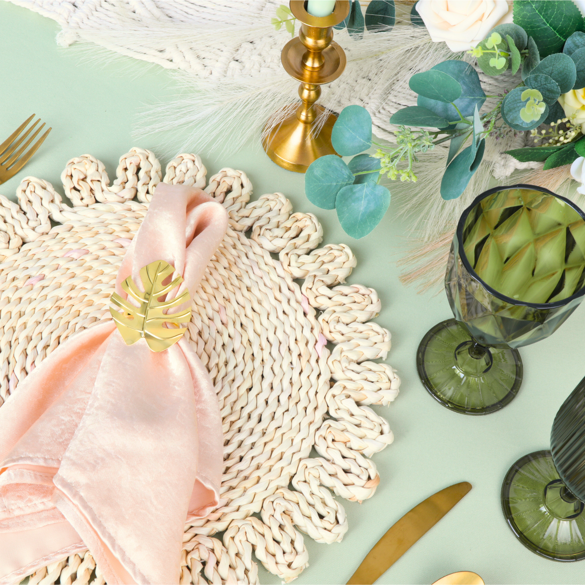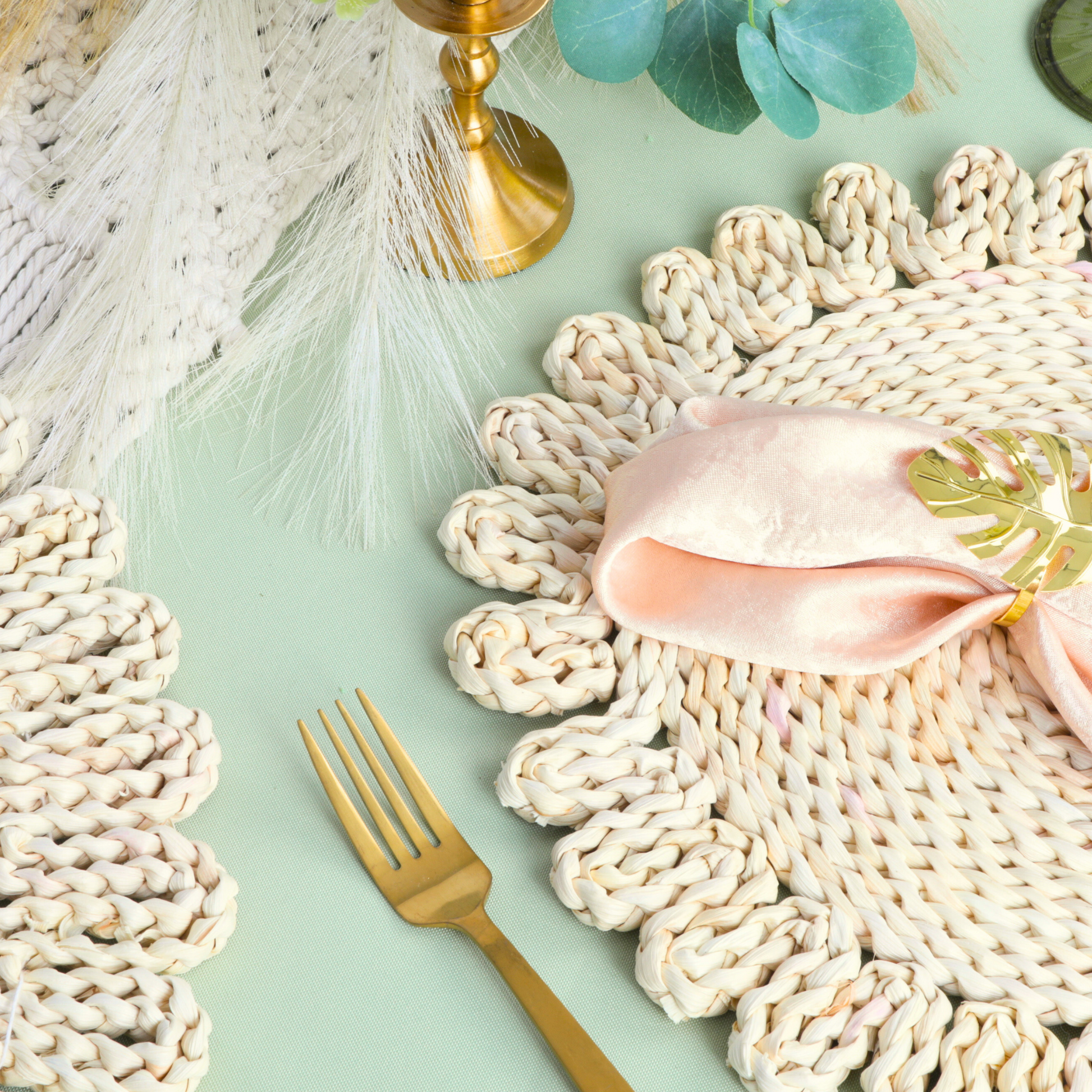 Placemats serve as both practical and decorative elements in table settings. Protect your party table surfaces from spills and scratches while adding visual interest to the dining area. They are important for maintaining hygiene during meals and creating a polished and organized look for any occasion. Straw placemats elevate your overall dining experience, perfect for weddings and intimate gatherings.