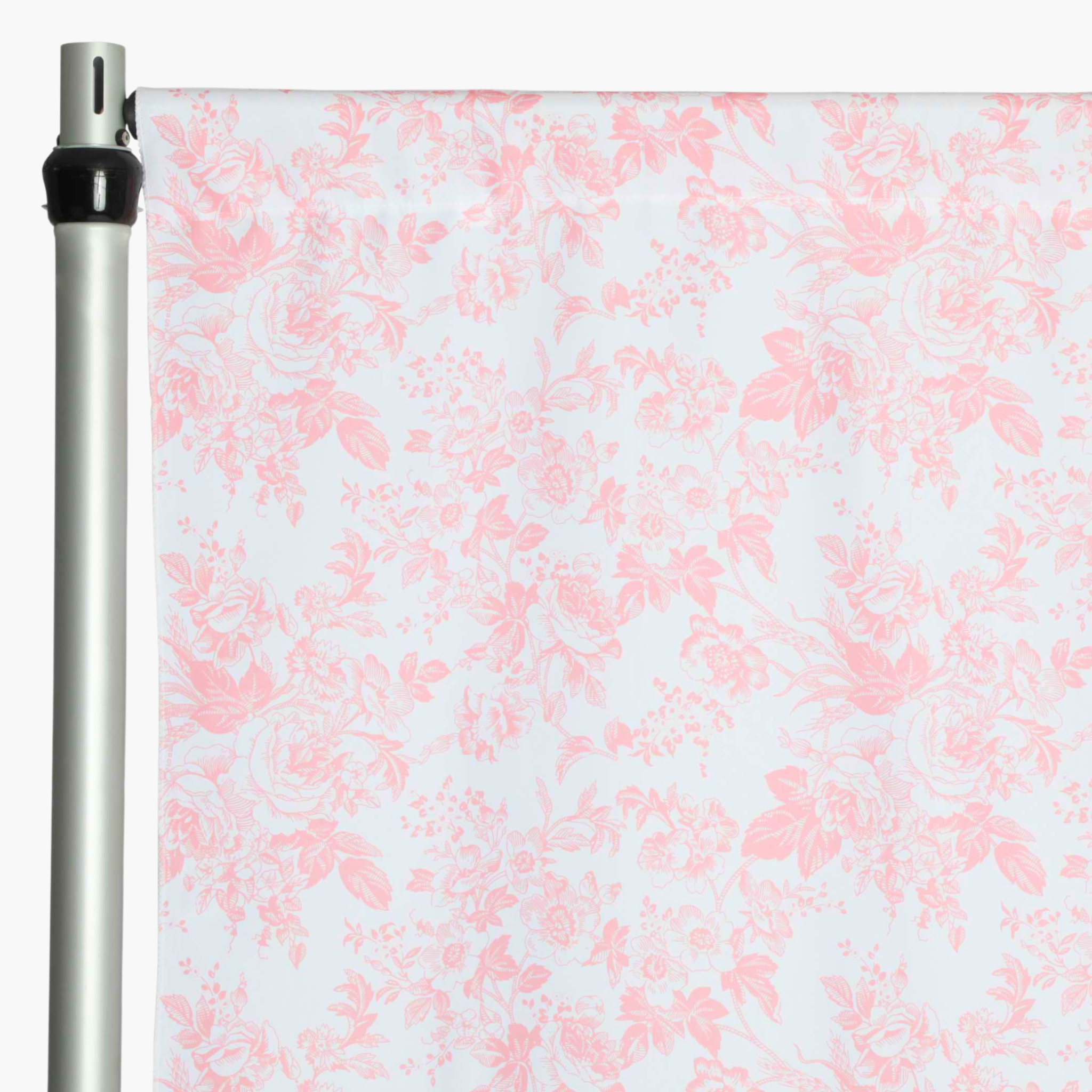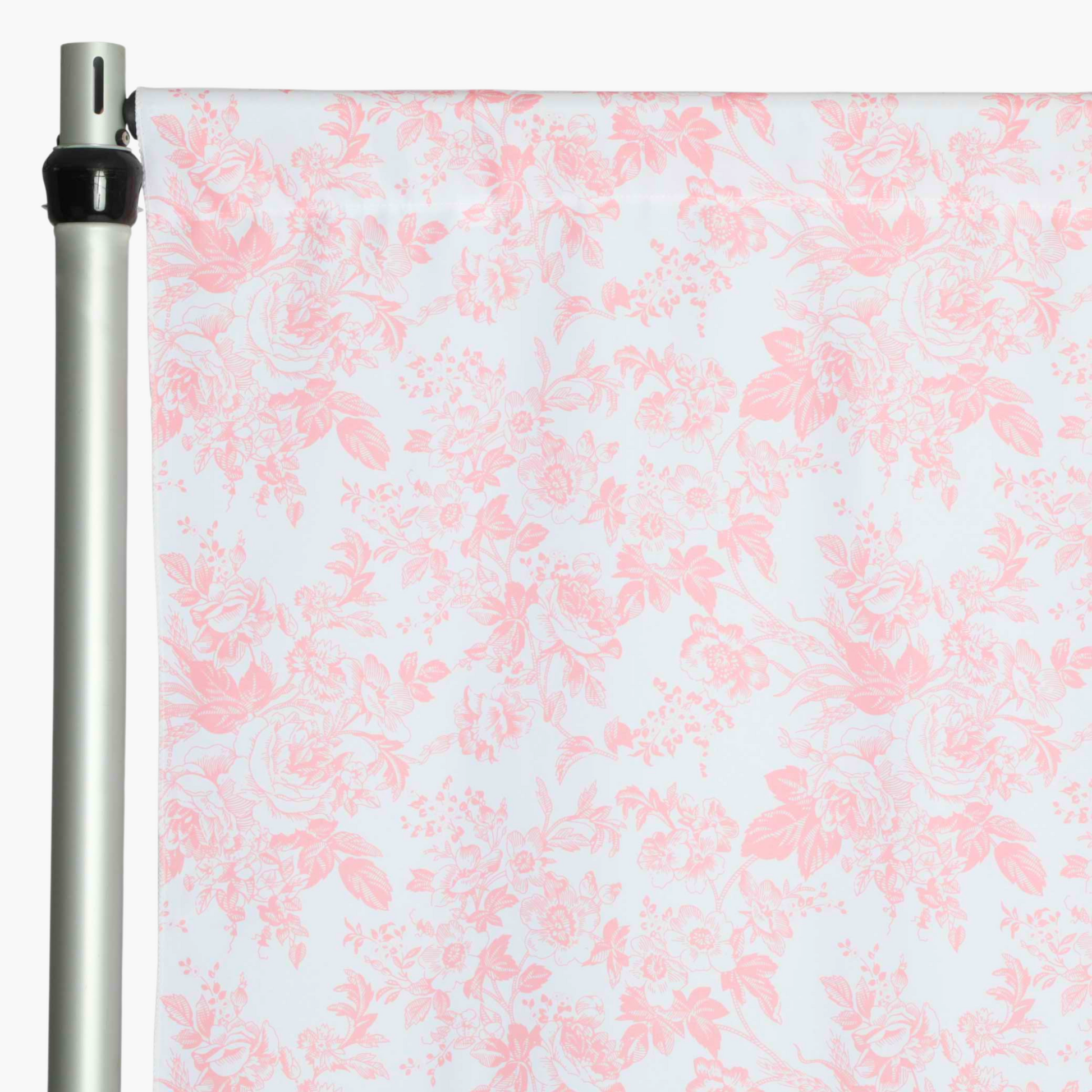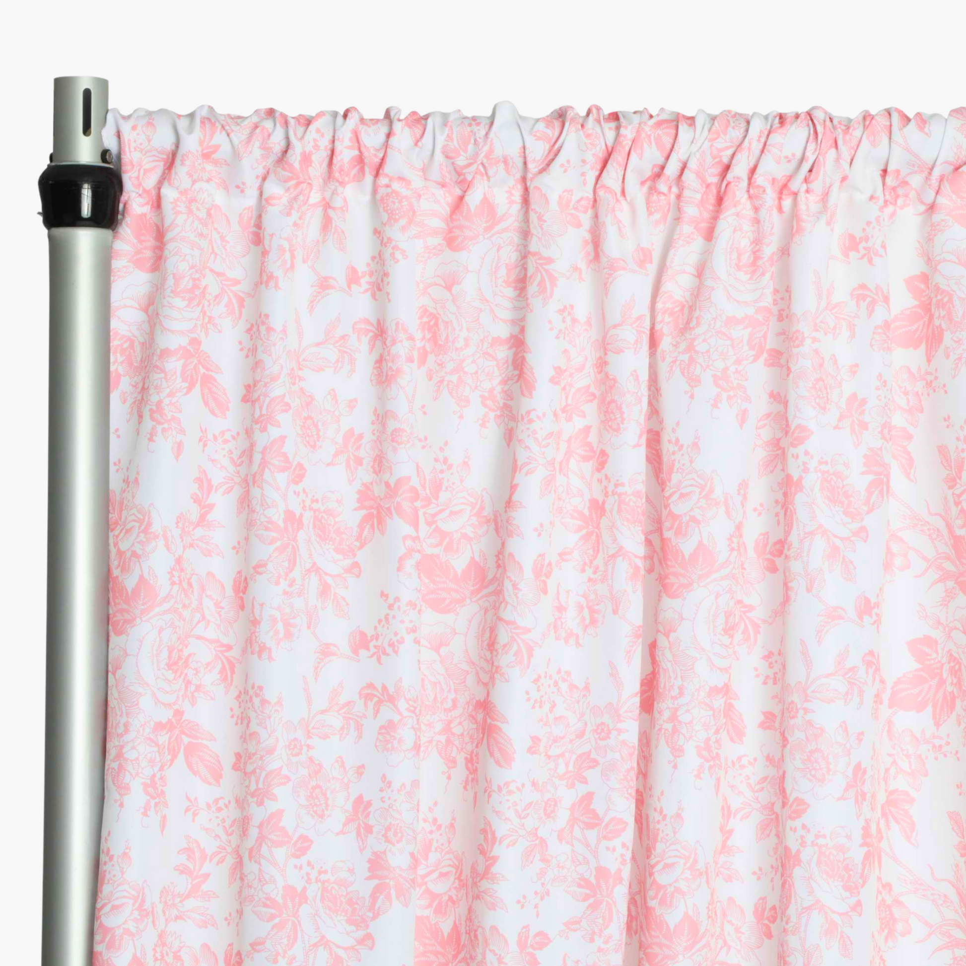 Elevate your event decor with our exquisite French Toile 10ft H x 52” W Drape in Coral. This stunning backdrop panel exudes timeless elegance and sophistication, infusing any occasion with French-inspired charm.