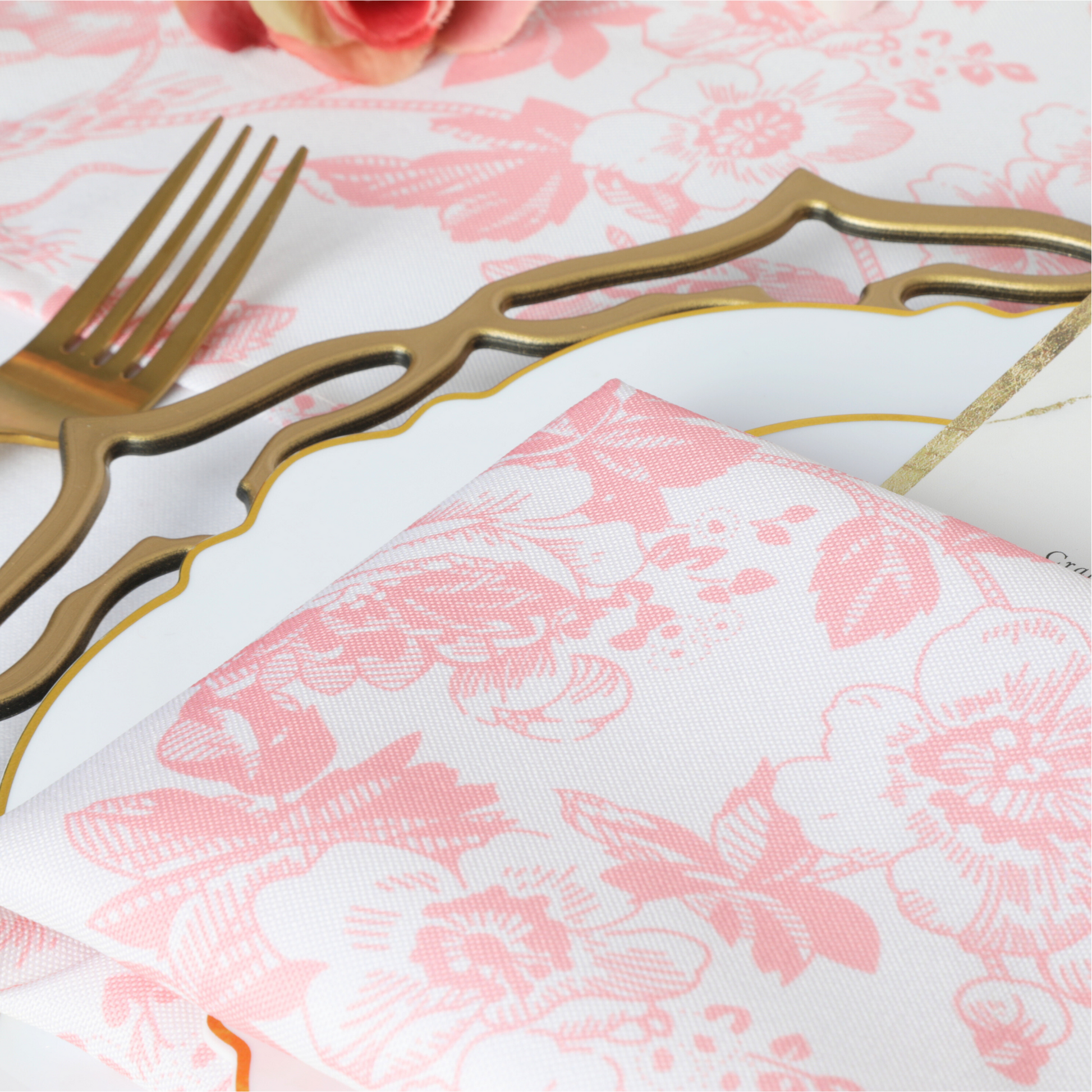 Enhance the vintage charm of your decor by pairing coral with classic French elements such as ornate furniture, vintage textiles, and delicate floral patterns. Elevate your space with the enduring elegance and allure of our coral French toile napkins.